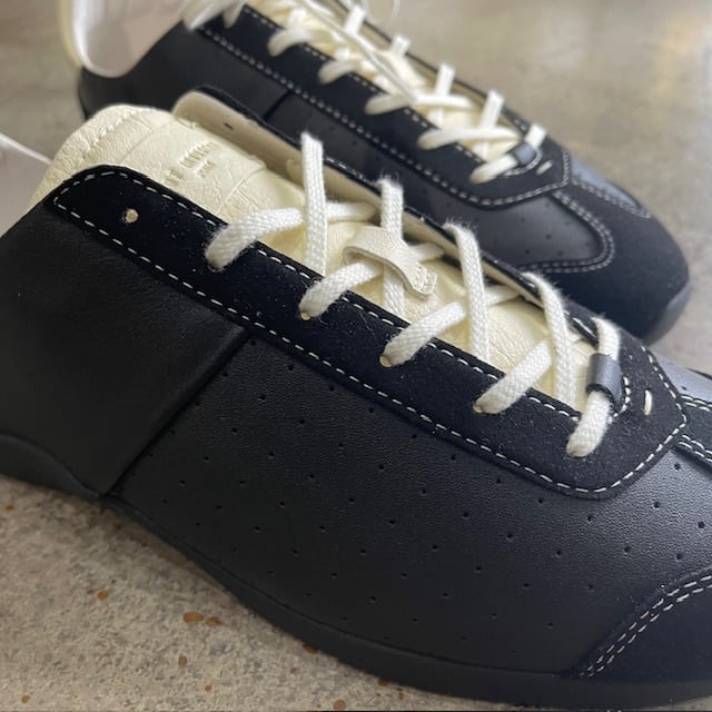 すっきりしたシルエットのスニーカーです。 とても凝った縫製 そして素材 インソールもクラフト感漂う作りです。 どこかバレーシューズやドライビングシューズを思わせるシュッとした形です。