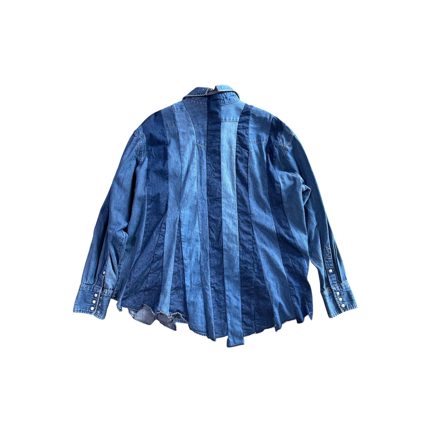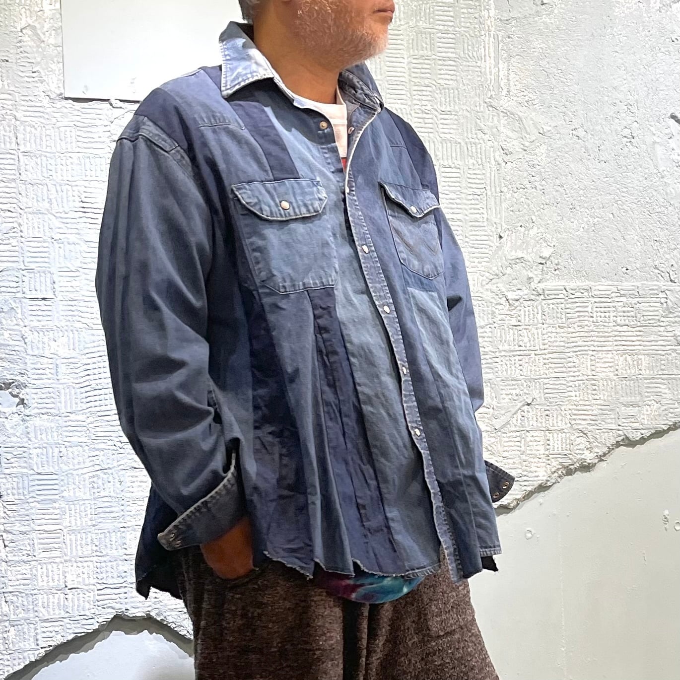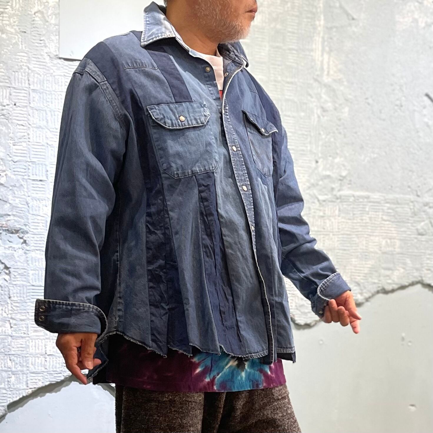 ユーズドのWrangler デニムウエスタンシャツを素材に作り込まれた横幅広めなシャツです。 ユーズドの経年変化の異なるデニムを縦にそして間にAラインのなるような生地使いによりダイナミックな立体感を醸し出しています。