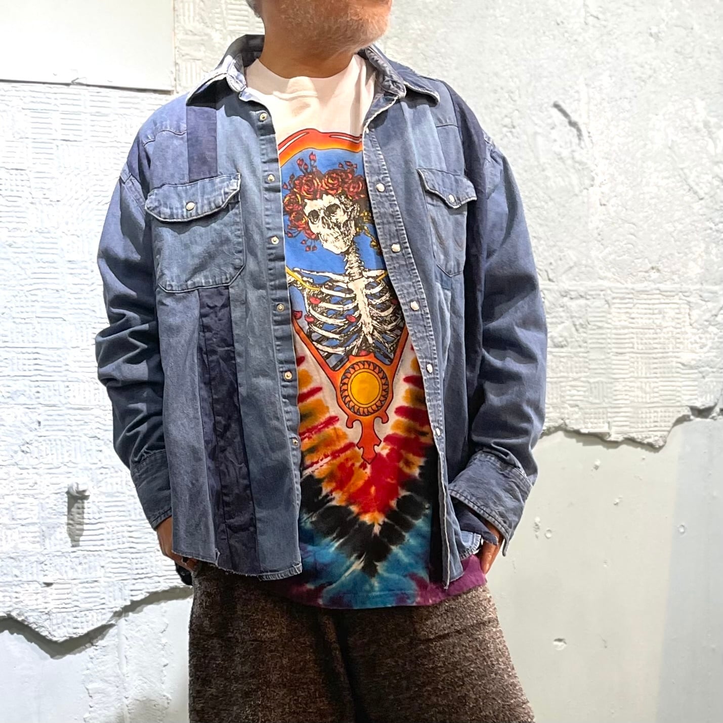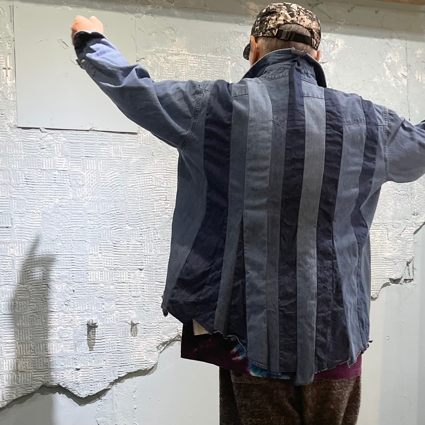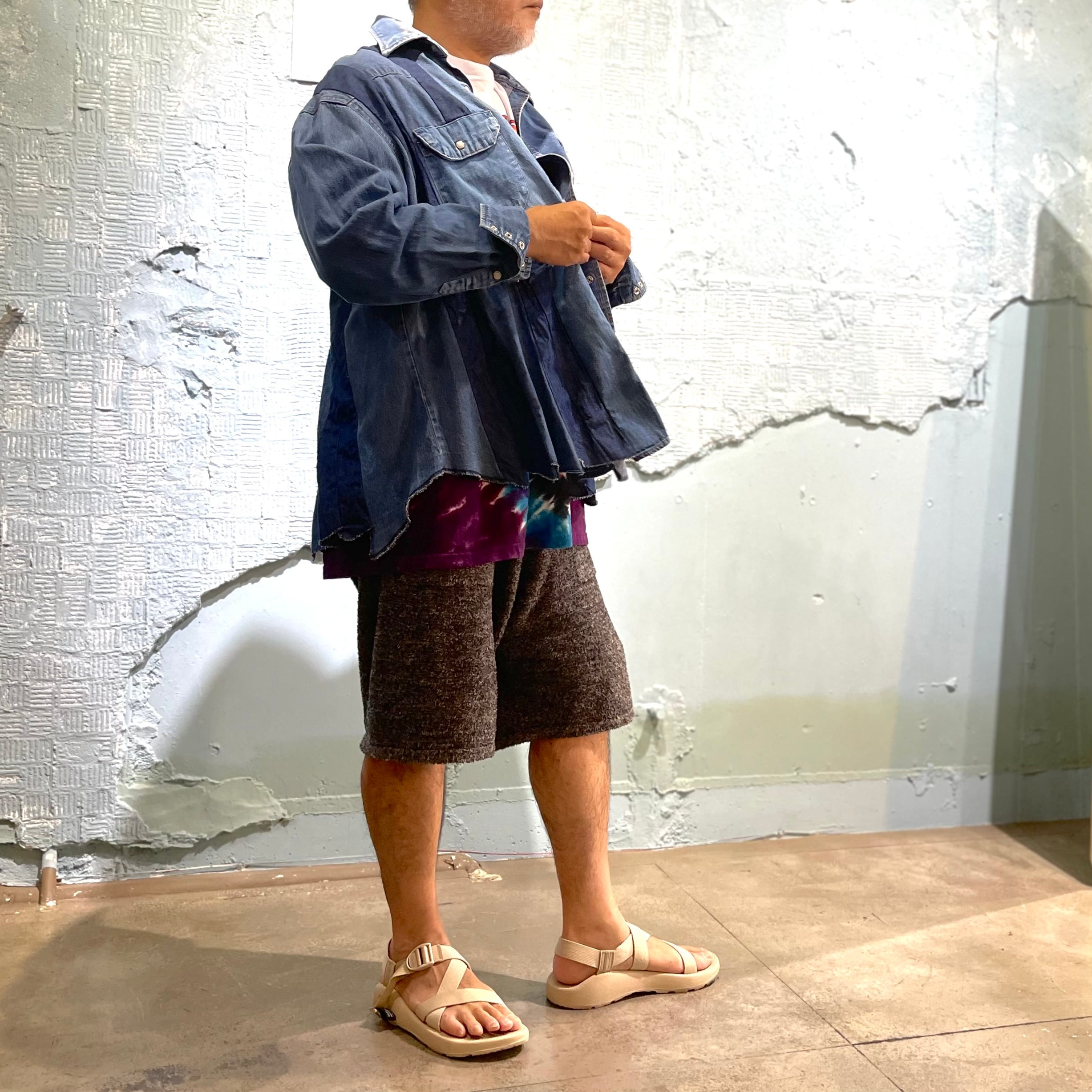 ユーズドのWrangler デニムウエスタンシャツを素材に作り込まれた横幅広めなシャツです。 ユーズドの経年変化の異なるデニムを縦にそして間にAラインのなるような生地使いによりダイナミックな立体感を醸し出しています。