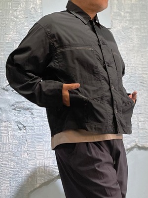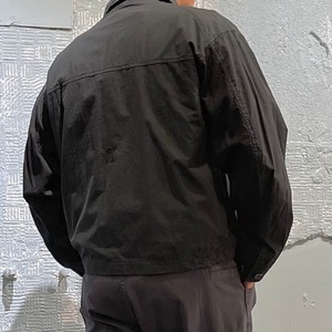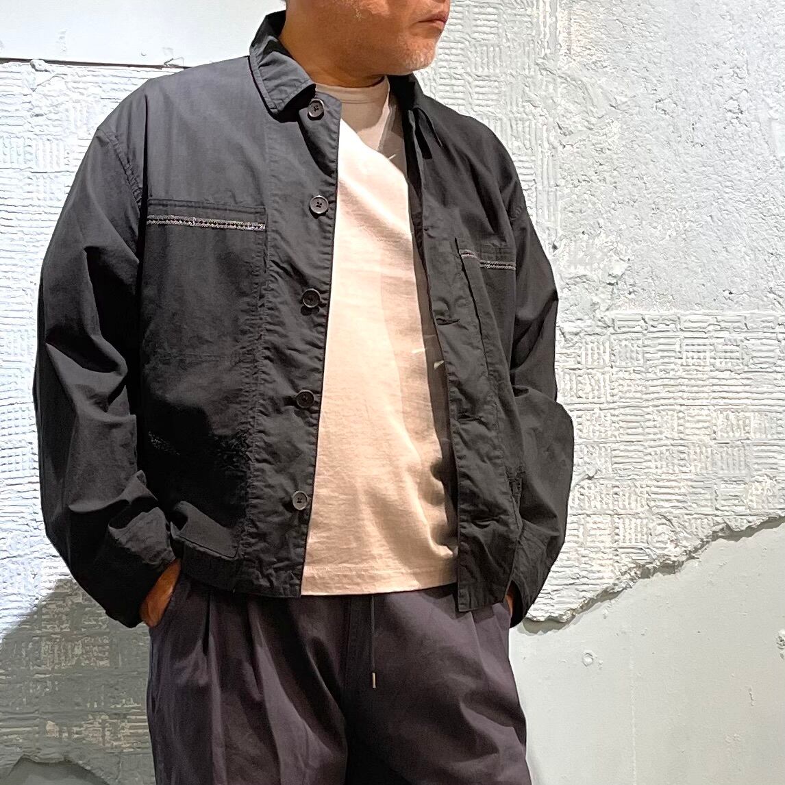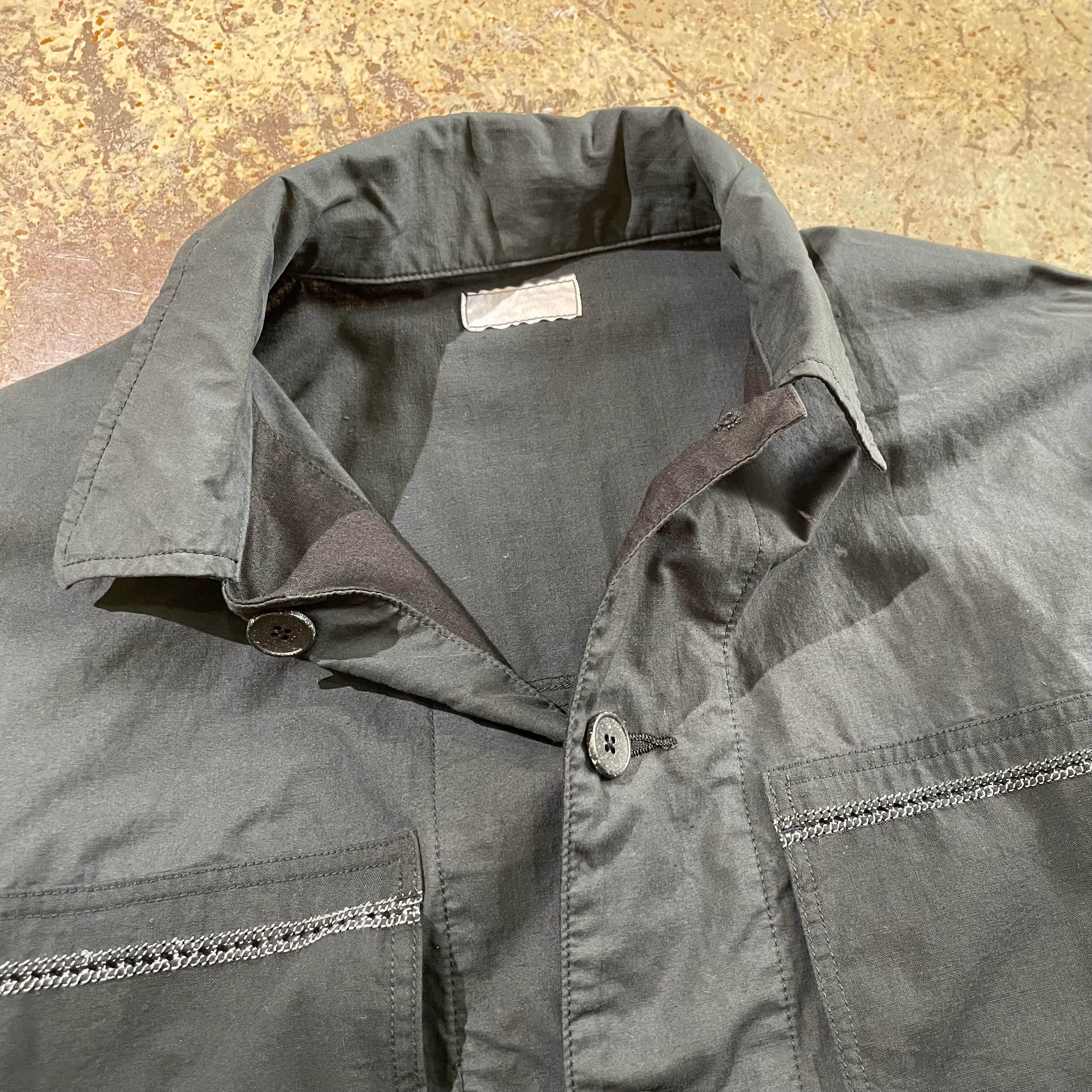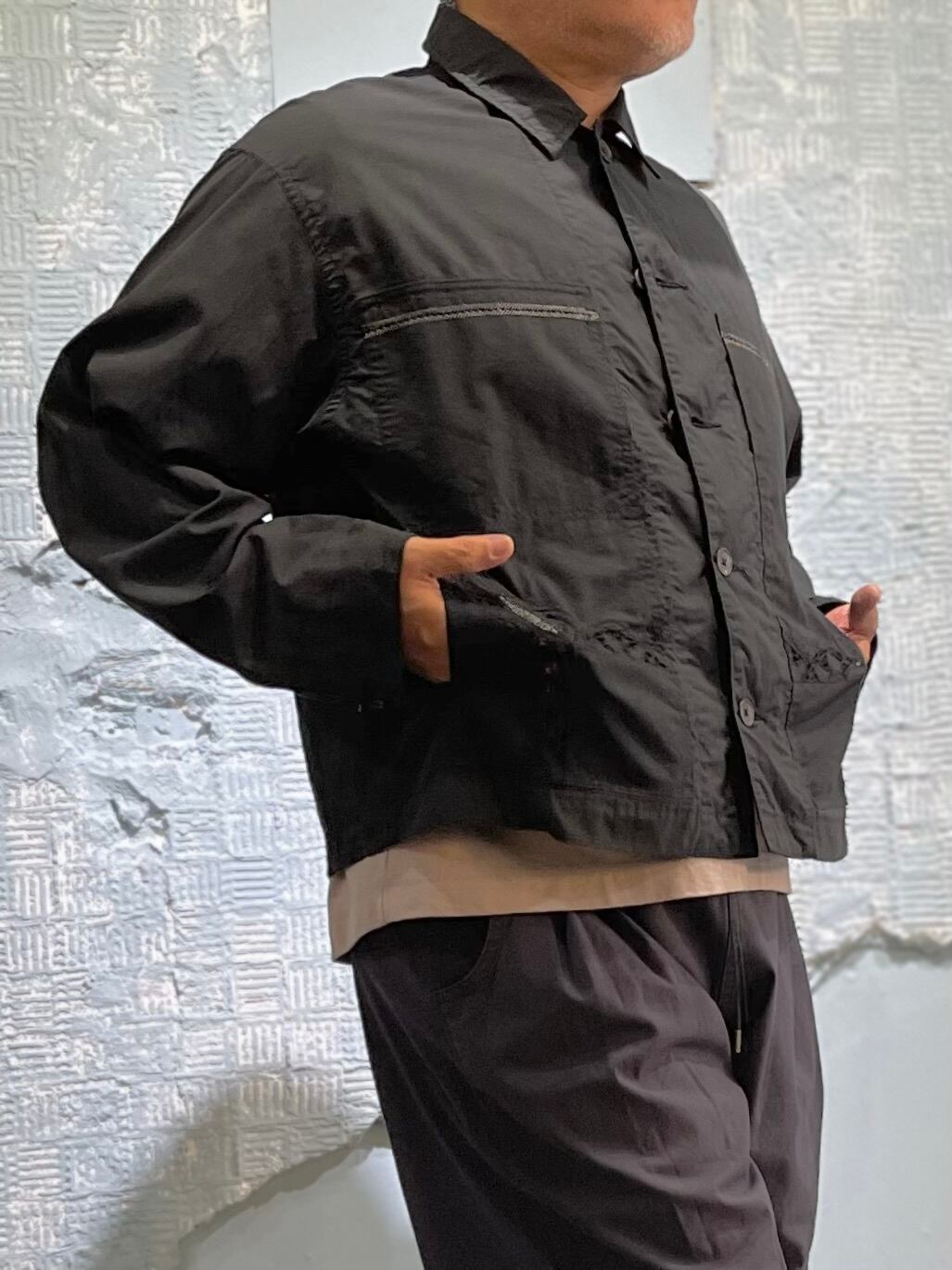 ユーズドのヨーロッパで集められた50、60年代のビンテージレースが特徴な薄手のアウターです。 その細かな刺繍は元々クッションカバー 生成色や白が中心であった物をリメイクしてからブラックに後染め、風合いを損なわずモードへと昇華した短丈シャツアウター