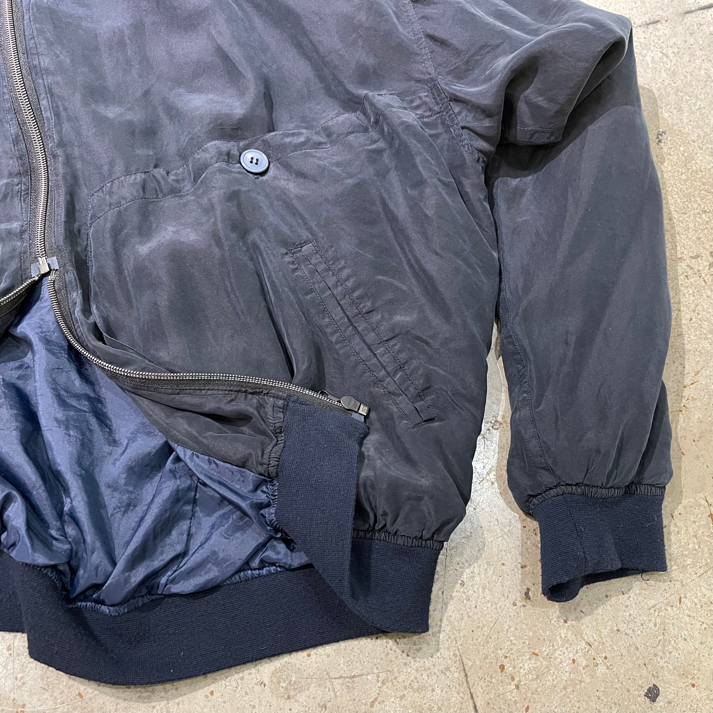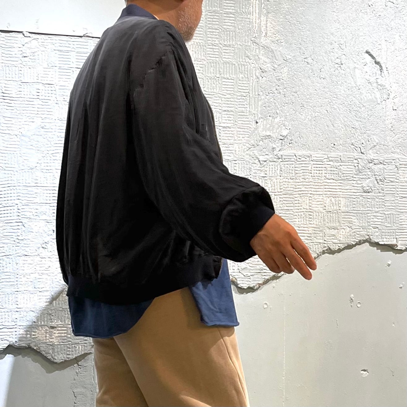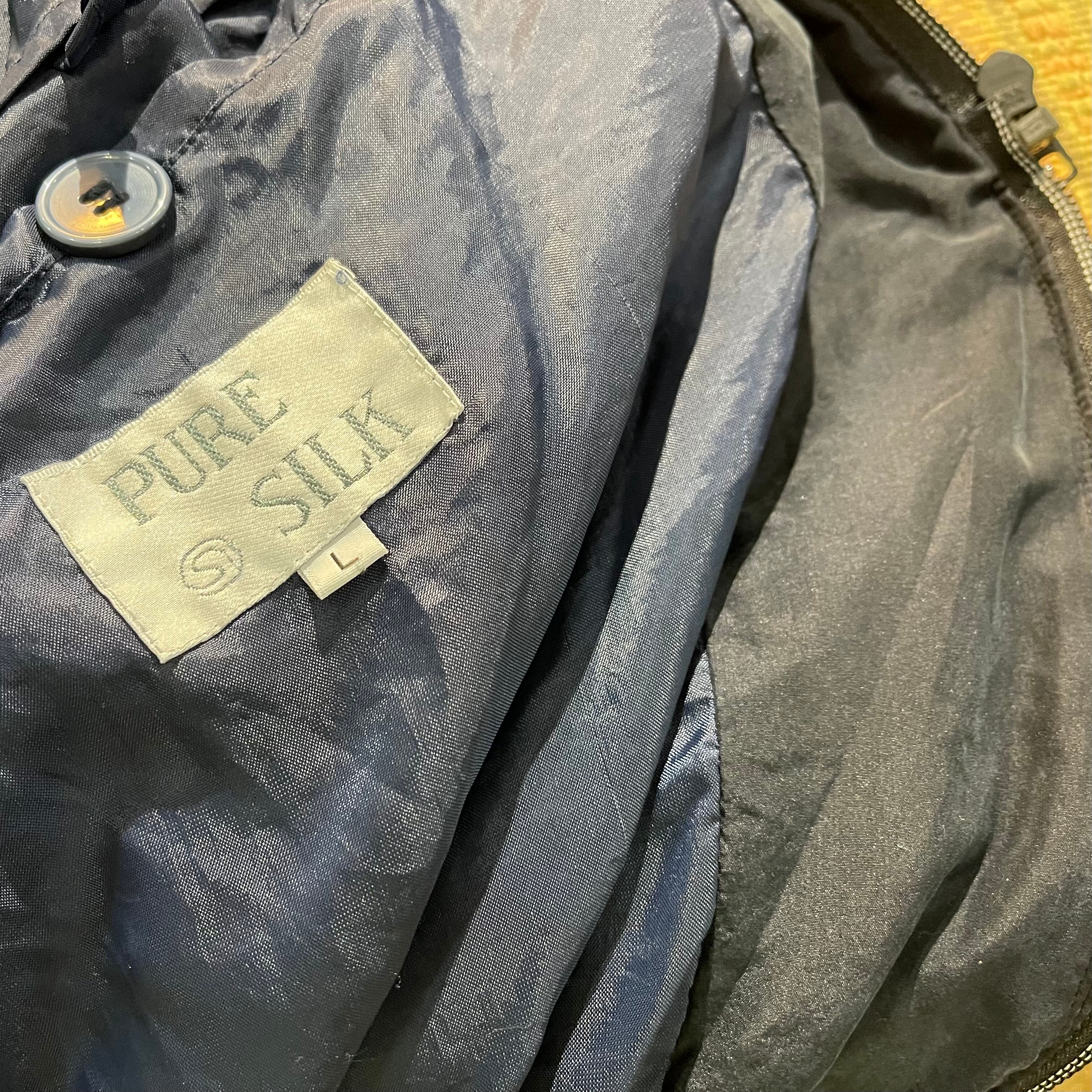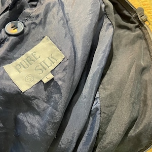ユーズドのシルクで作られたブルゾンを2つのジップで開閉するようにリメイクされたアウターです。 肌触りの良いシルク とても軽く羽織れます、裏地の付いたものですので適度なボリューム感も魅力。 さらに黒で製品染をすることで元の色目のナイロン糸などがステッチとして表れていたり、