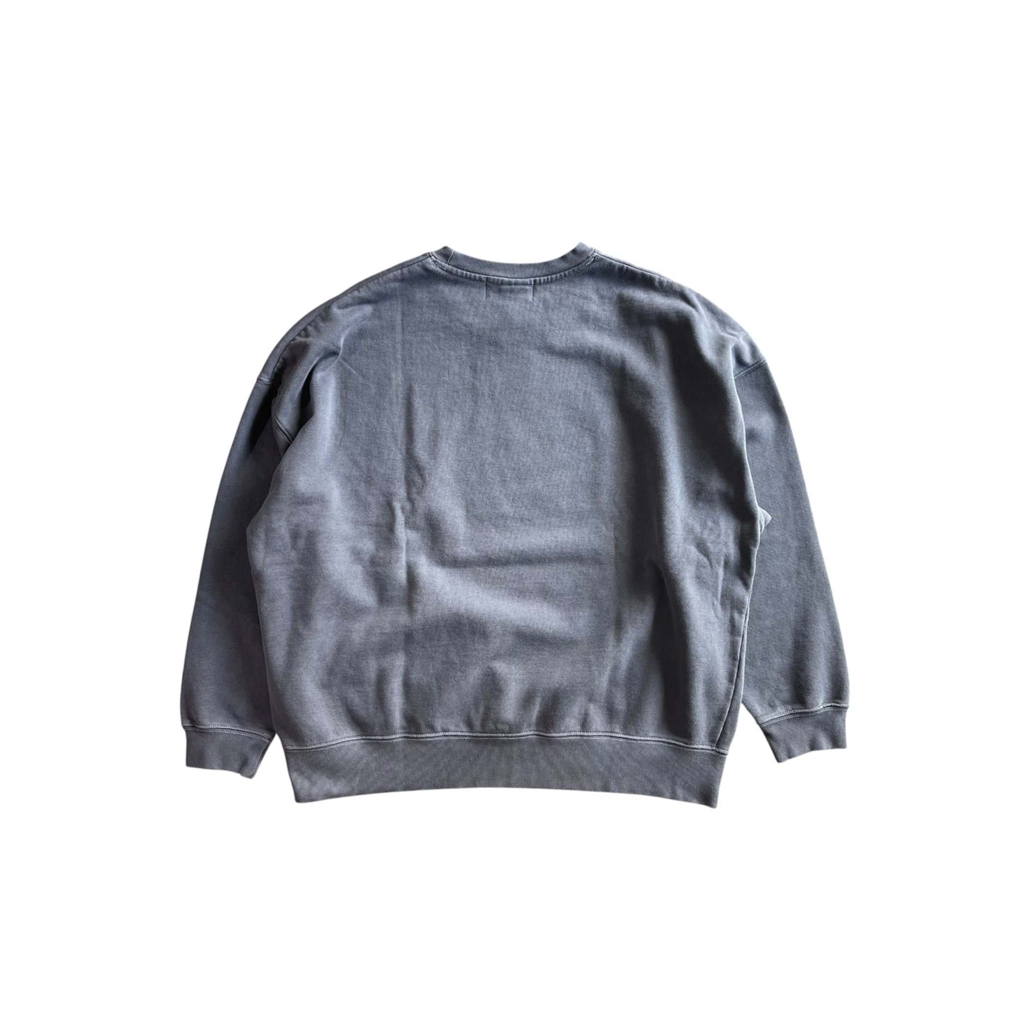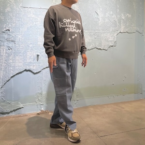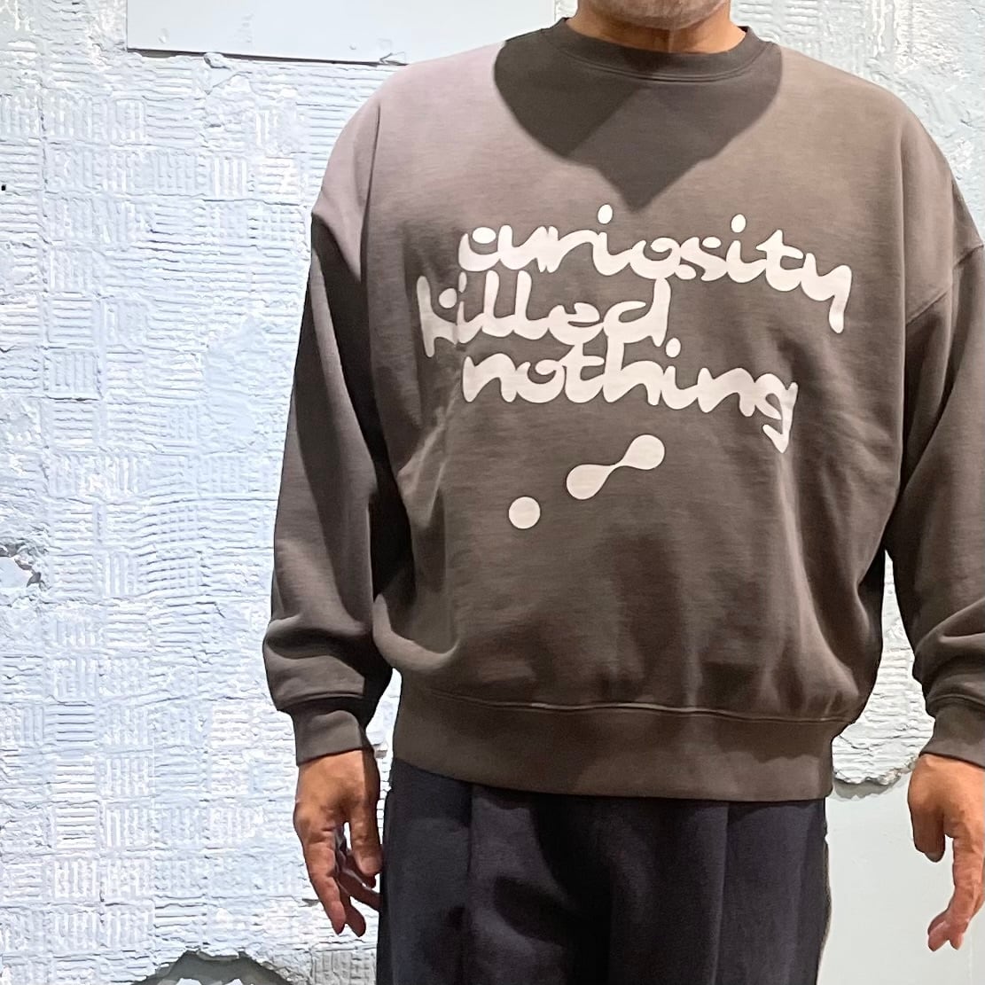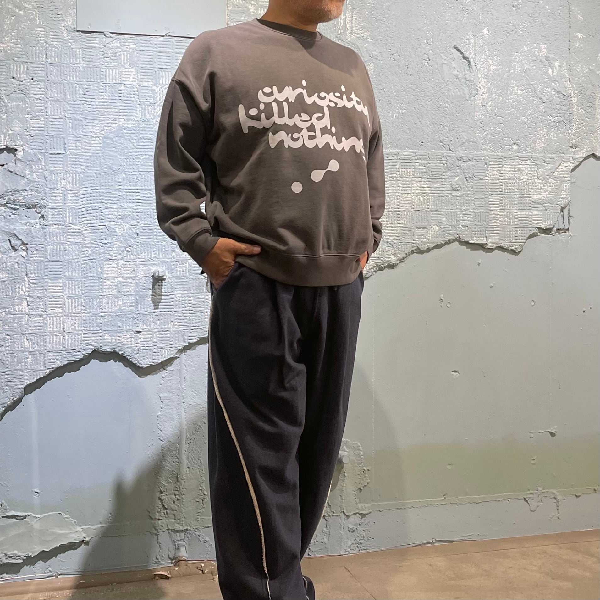 音楽からインスピレーションを得たグラフィックが特徴のプリントスウェット テクノの名盤、ケミカルブラザーズのジャケットへのオマージュ的なフォントです。プリントの色が白ではなく燻んだサックスというところもお洒落ですね、ボックスシルエットながらコンパクトなサイジング、素材は薄手のスウェット素材 かしっと腰のあるスウェットです。
