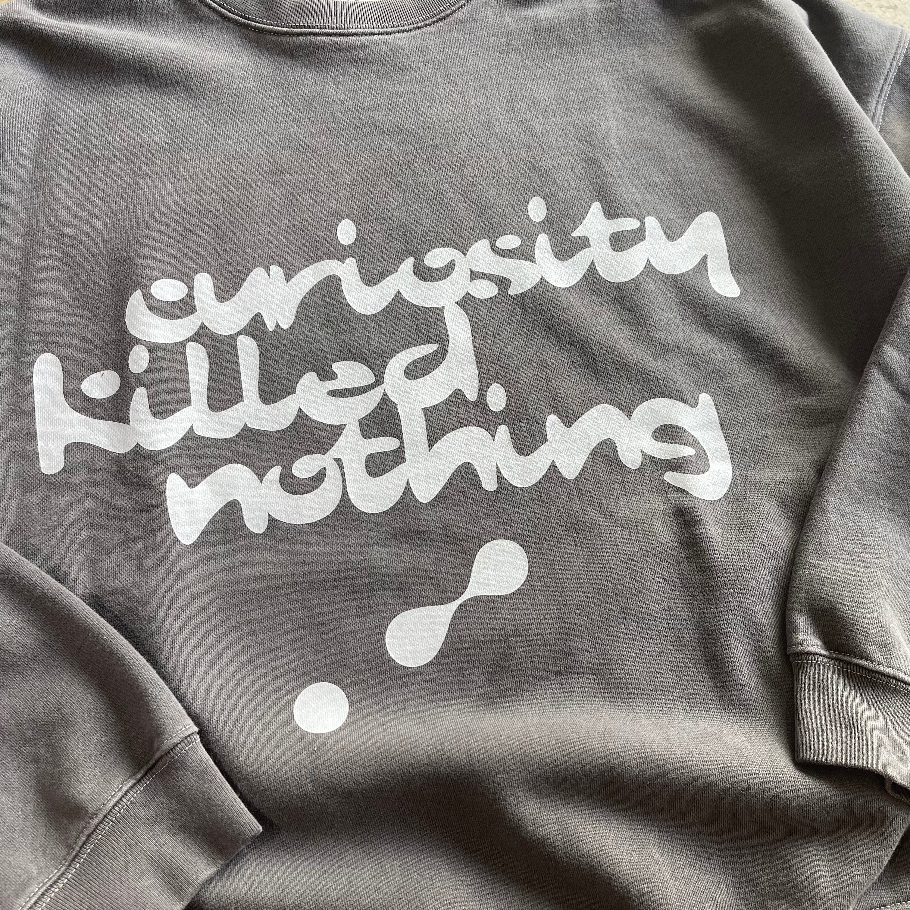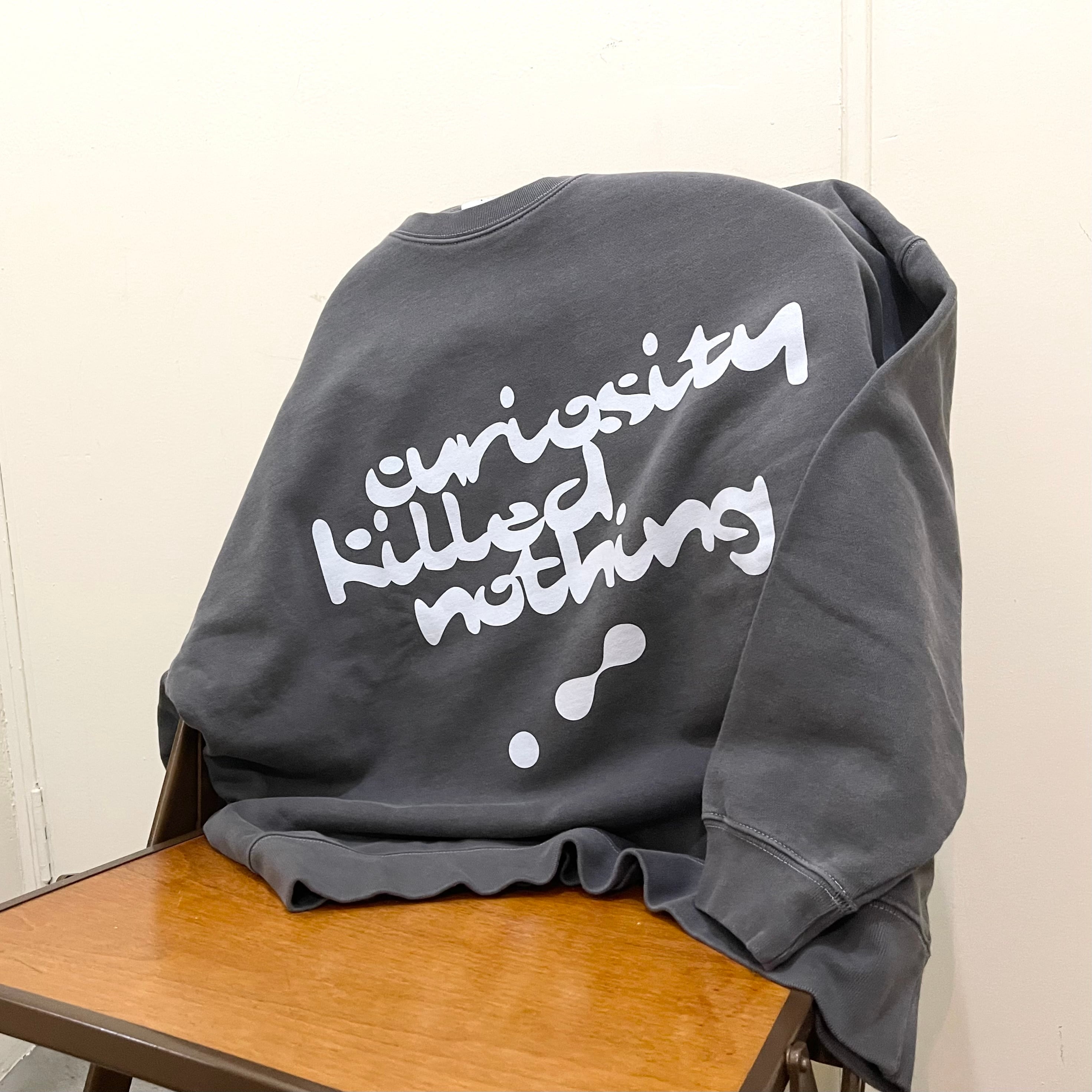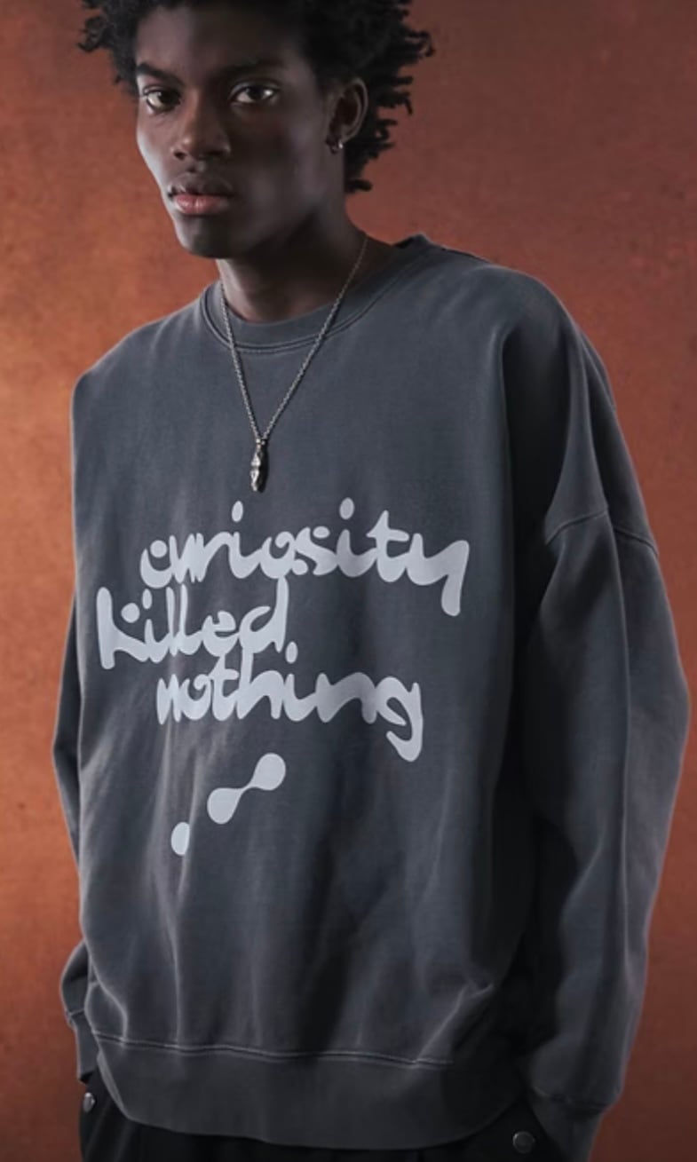 音楽からインスピレーションを得たグラフィックが特徴のプリントスウェット テクノの名盤、ケミカルブラザーズのジャケットへのオマージュ的なフォントです。プリントの色が白ではなく燻んだサックスというところもお洒落ですね、ボックスシルエットながらコンパクトなサイジング、素材は薄手のスウェット素材 かしっと腰のあるスウェットです。