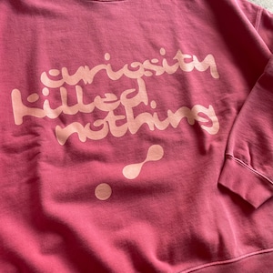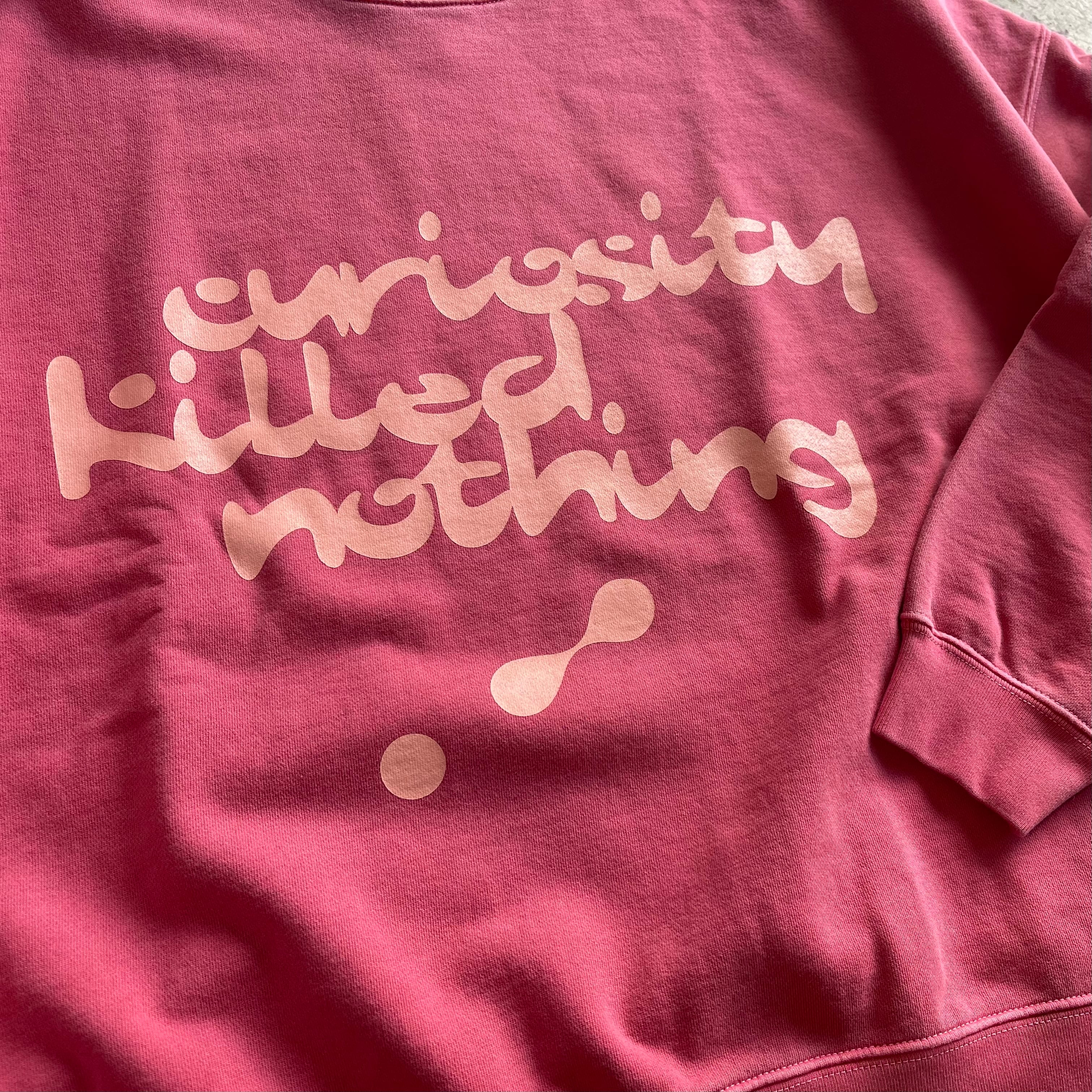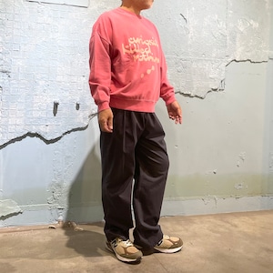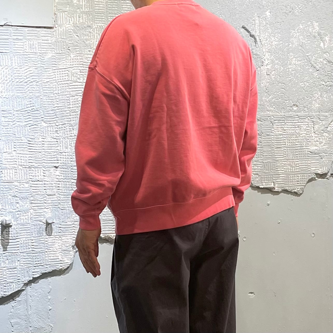 音楽からインスピレーションを得たグラフィックが特徴のプリントスウェット テクノの名盤、ケミカルブラザーズのジャケットへのオマージュ的なフォントです。プリントの色が白ではなく淡いピンクというところもお洒落ですね、ボックスシルエットながらコンパクトなサイジング、素材は薄手のスウェット素材 かしっと腰のあるスウェットです。