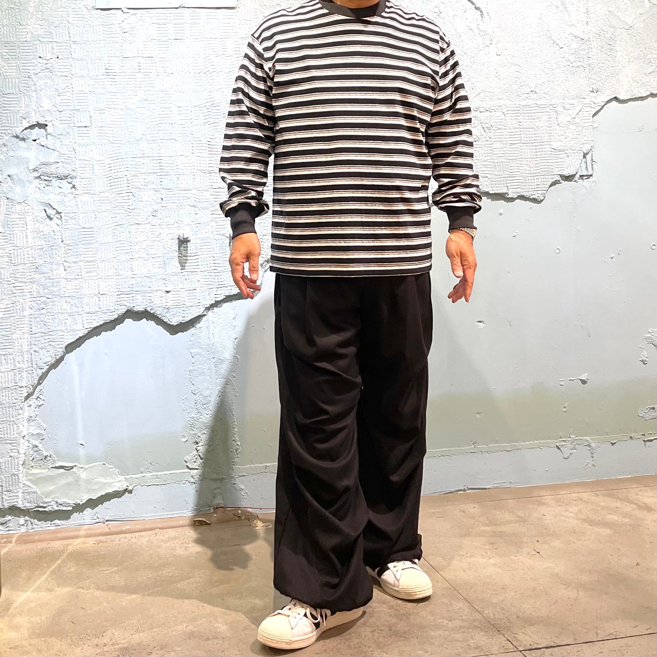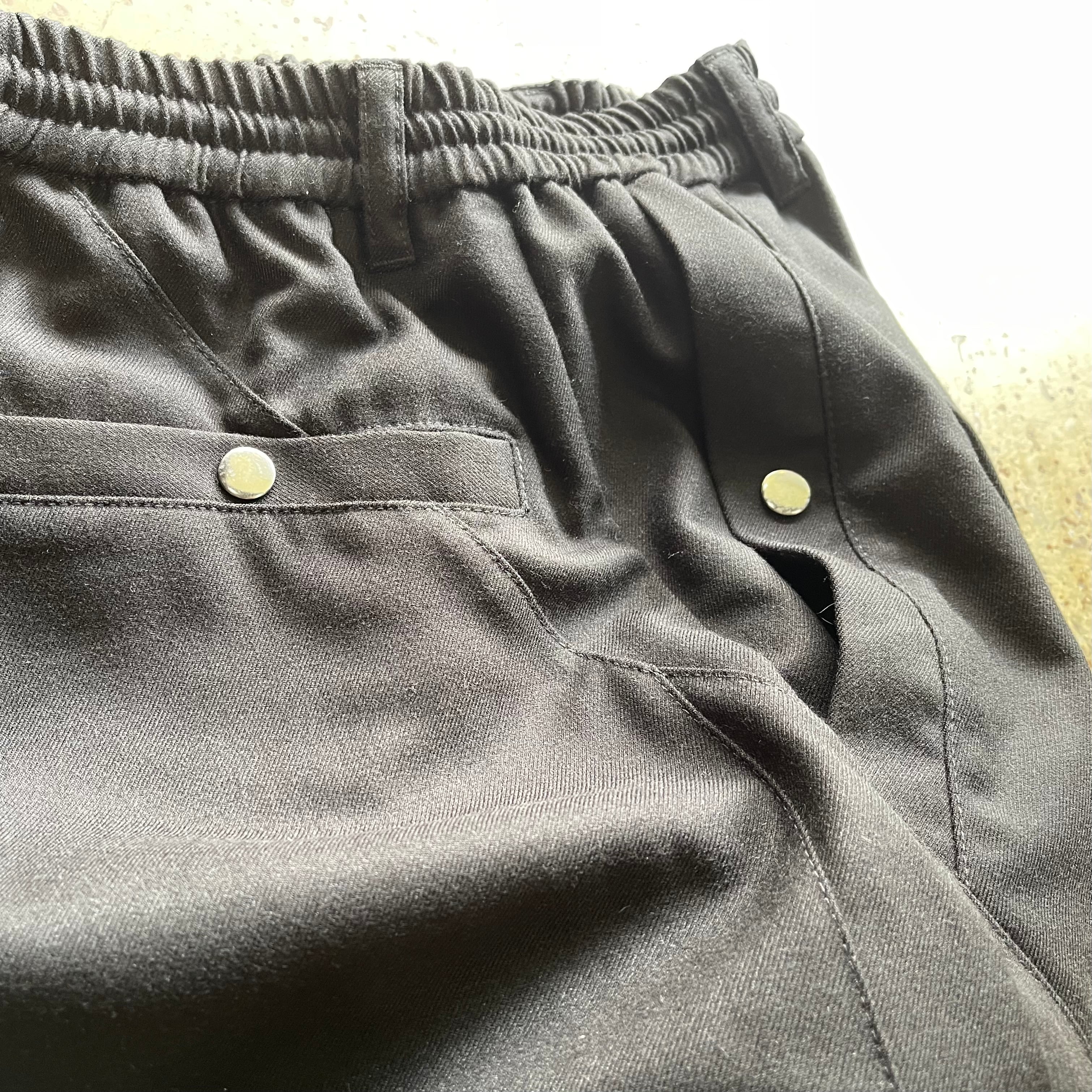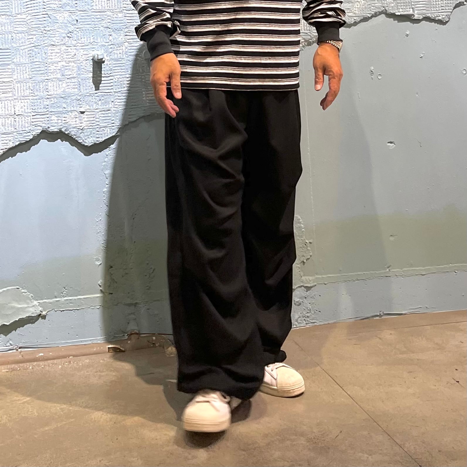 トープのスタッズを加えたワイドなイージーパンツです。 ポリエステル73% レーヨン24% ポリウレタン3%のしっとり厚みのある化繊の質感 伸縮性もあり履きやすい素材です。 ダーツやタックを多用したデザインですが的確な位置関係なので膝の部分など着やすさに反映されております。