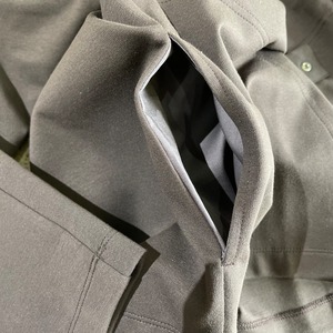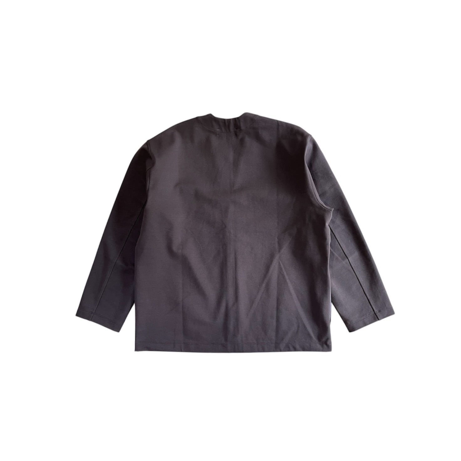 ストレッチ性の高いカットソー素材が特徴の「パースプロジェクツ」のノーカラータイプのジャケットです。 スナップボタンでサラッと羽織れる軽アウター、全体的な印象はミニマルですっきりしています。