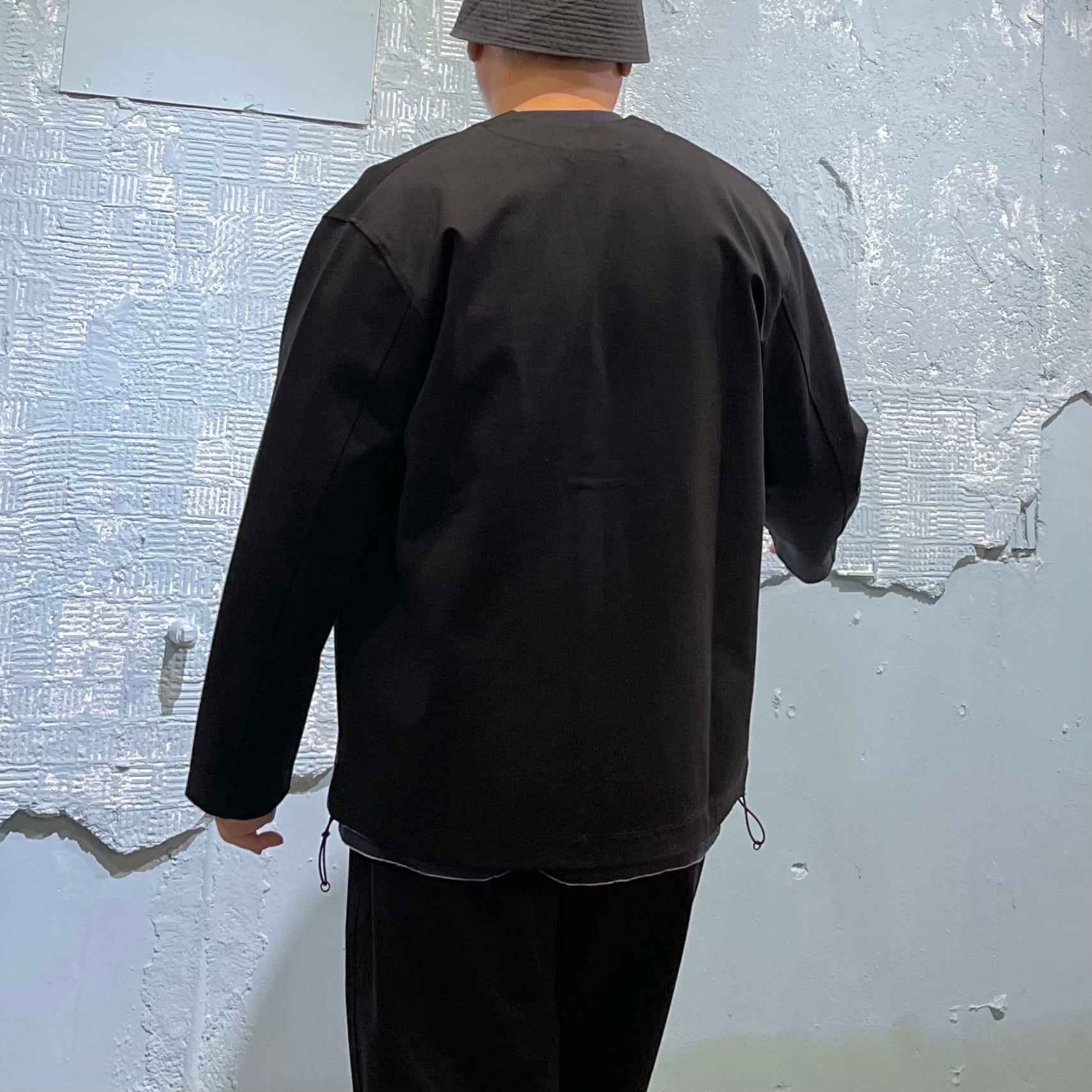 ストレッチ性の高いカットソー素材が特徴の「パースプロジェクツ」のノーカラータイプのジャケットです。 スナップボタンでサラッと羽織れる軽アウター、全体的な印象はミニマルですっきりしています。
