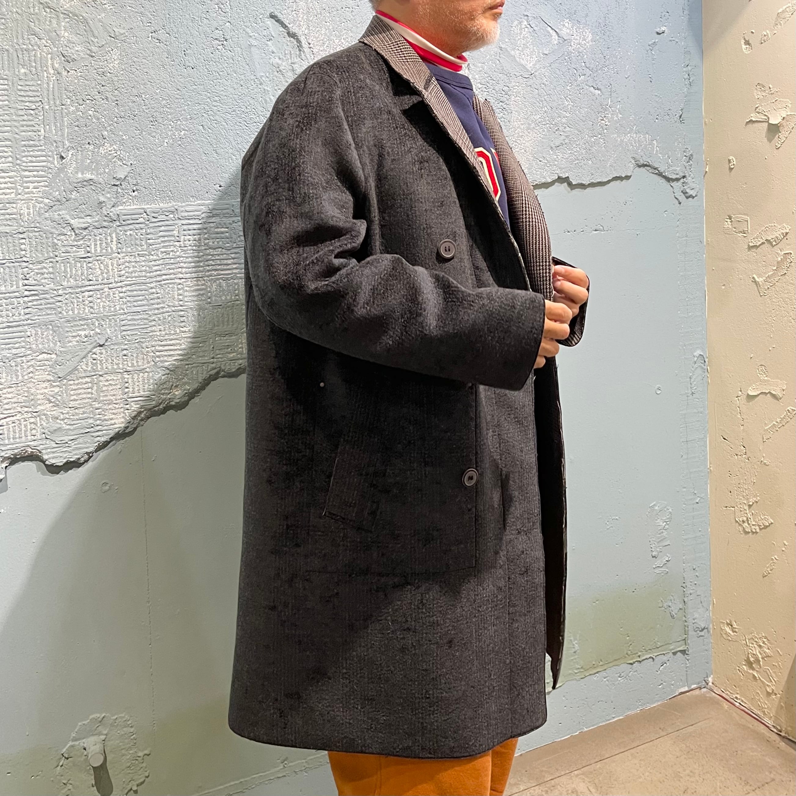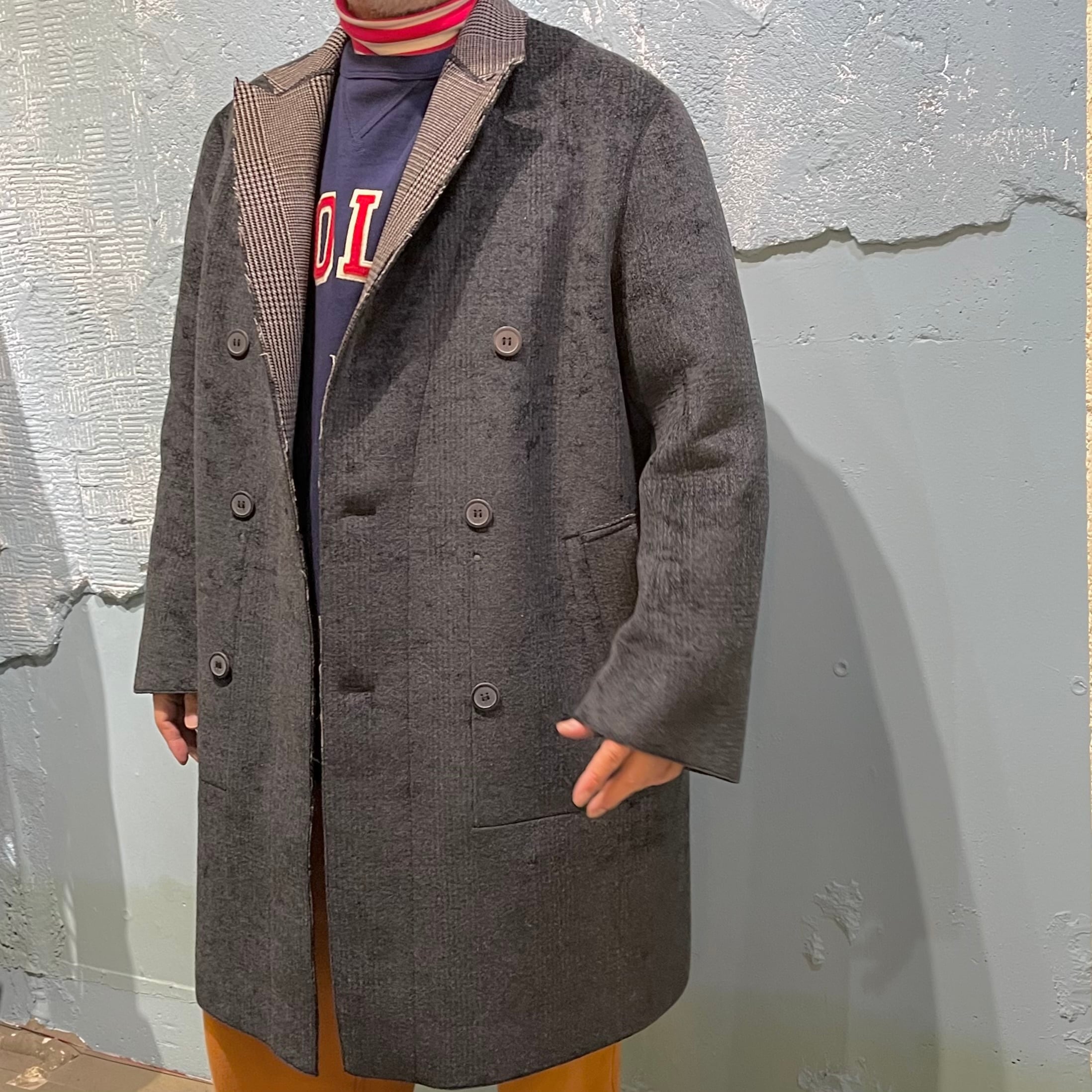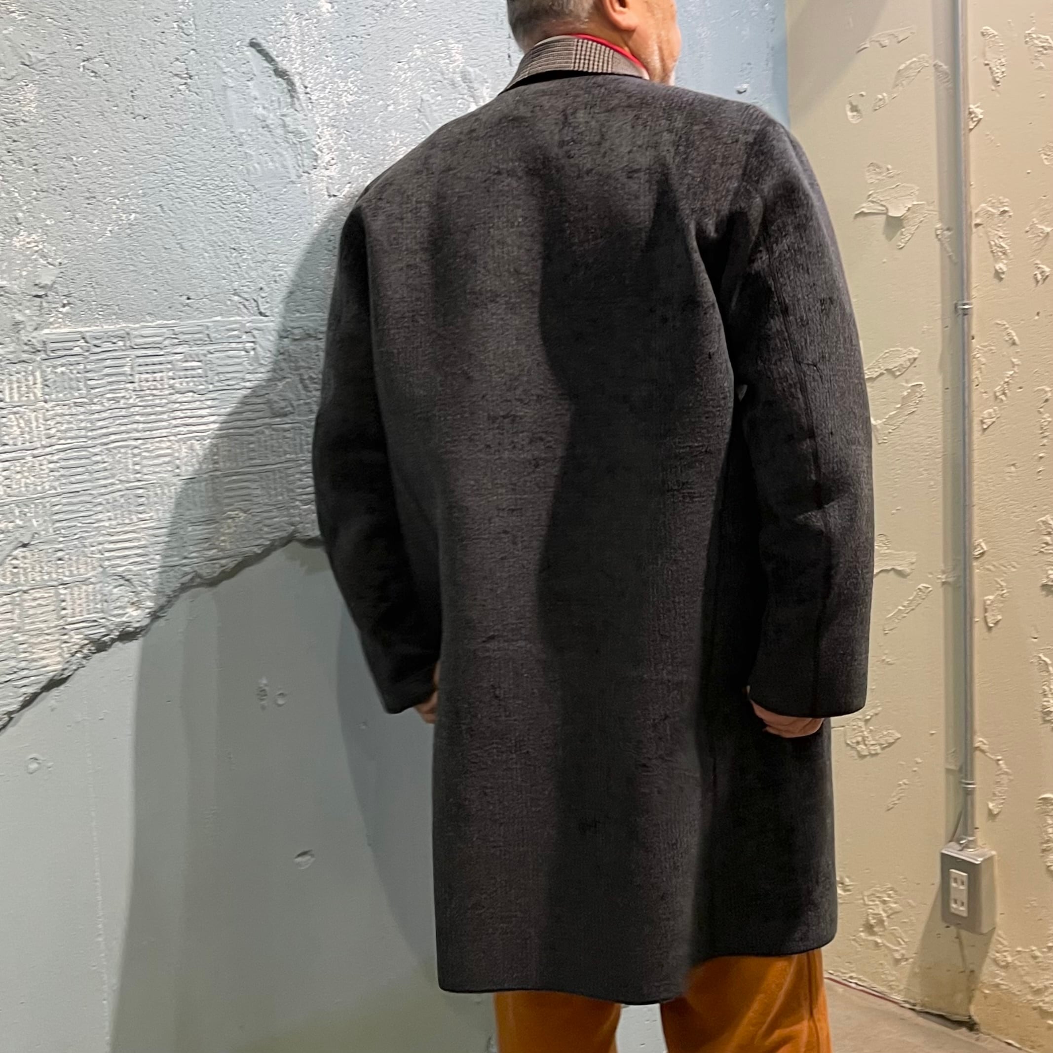 『サバイ』のスタイリッシュなチェスターコートです。そしてリバーシブルブルです。 弾力性のあるダブルフェイスな素材感が特徴です、刺繍機を使い糸で縫わずに貼り合わせるとい凝ったオリジナル素材。