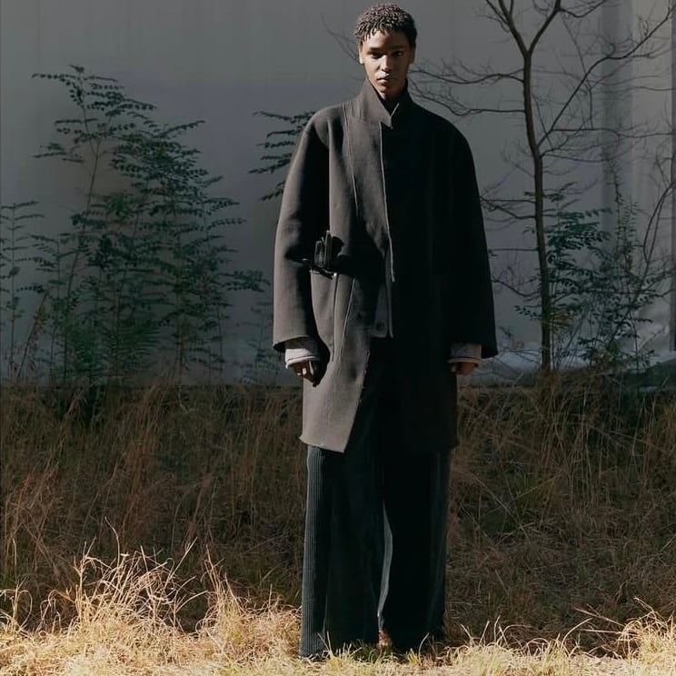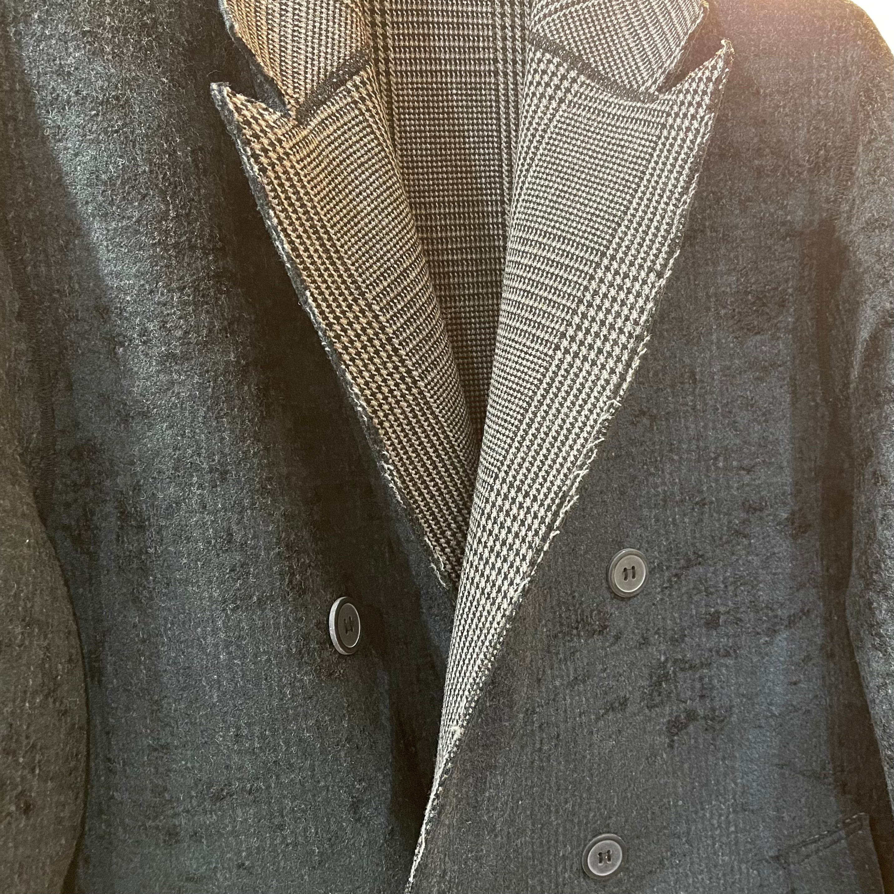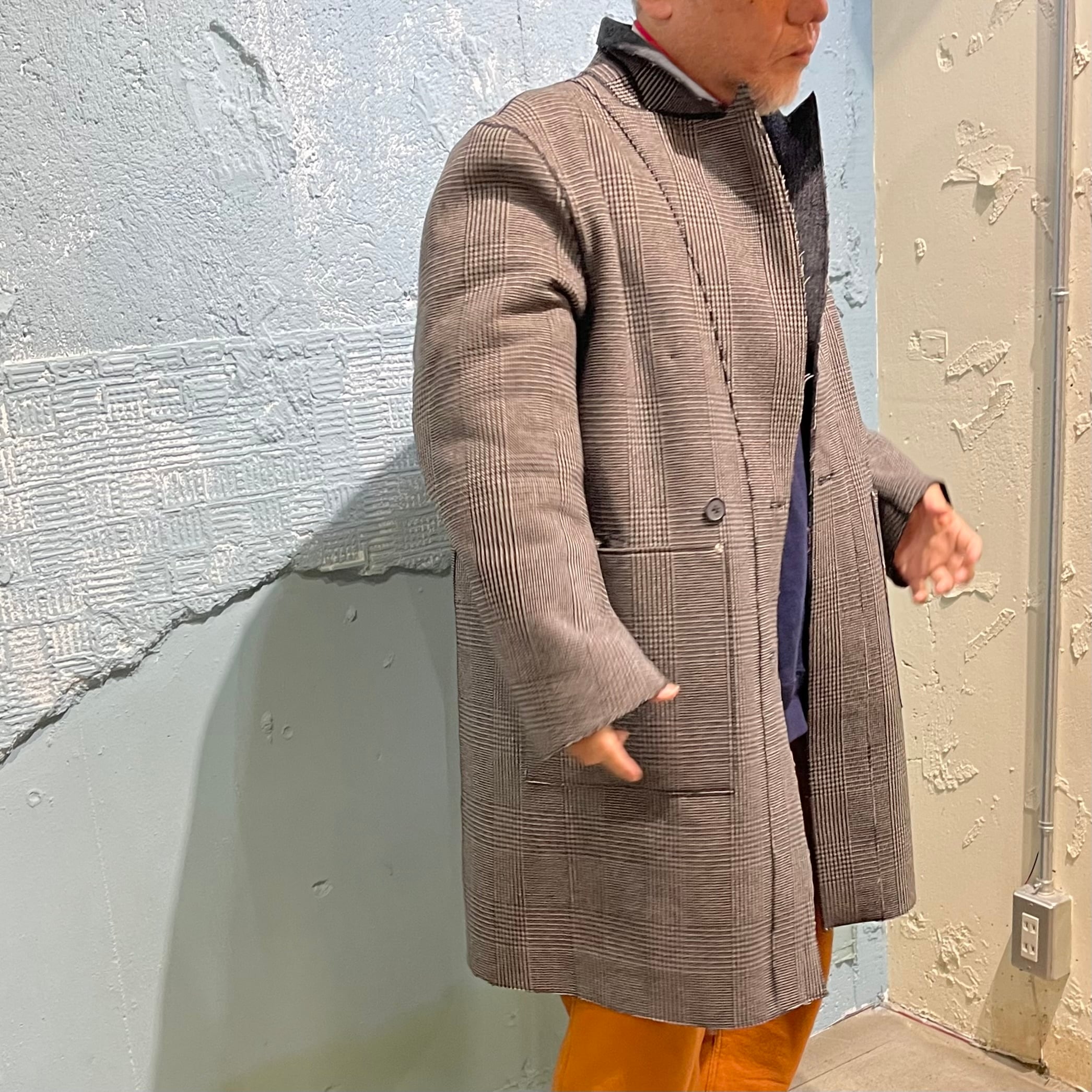 『サバイ』のスタイリッシュなチェスターコートです。そしてリバーシブルブルです。 弾力性のあるダブルフェイスな素材感が特徴です、刺繍機を使い糸で縫わずに貼り合わせるとい凝ったオリジナル素材。