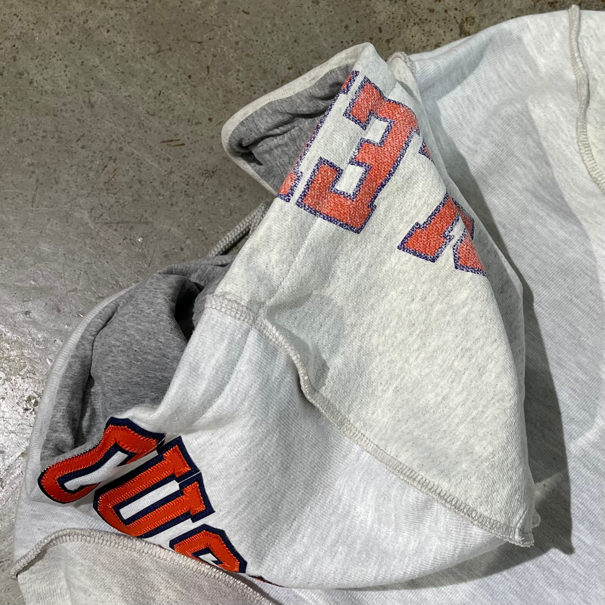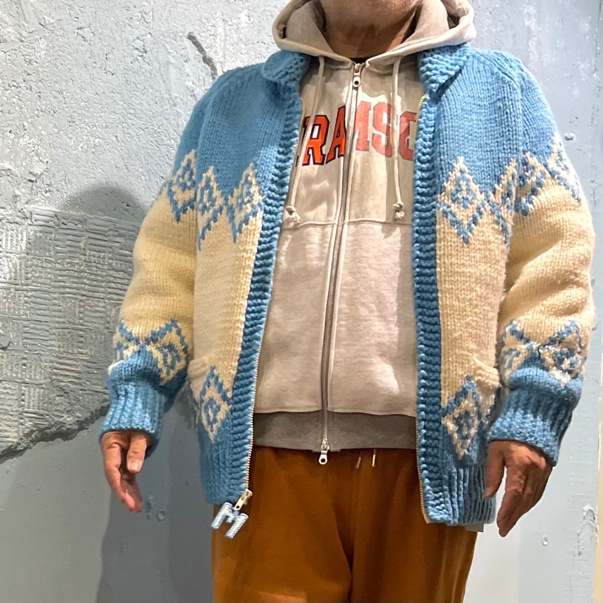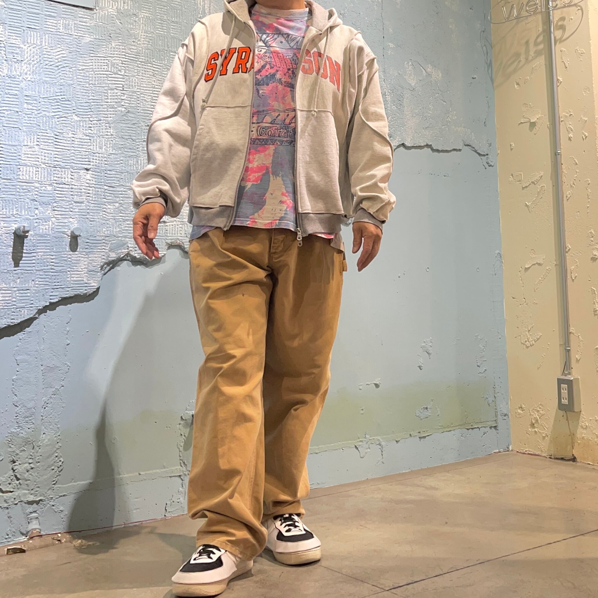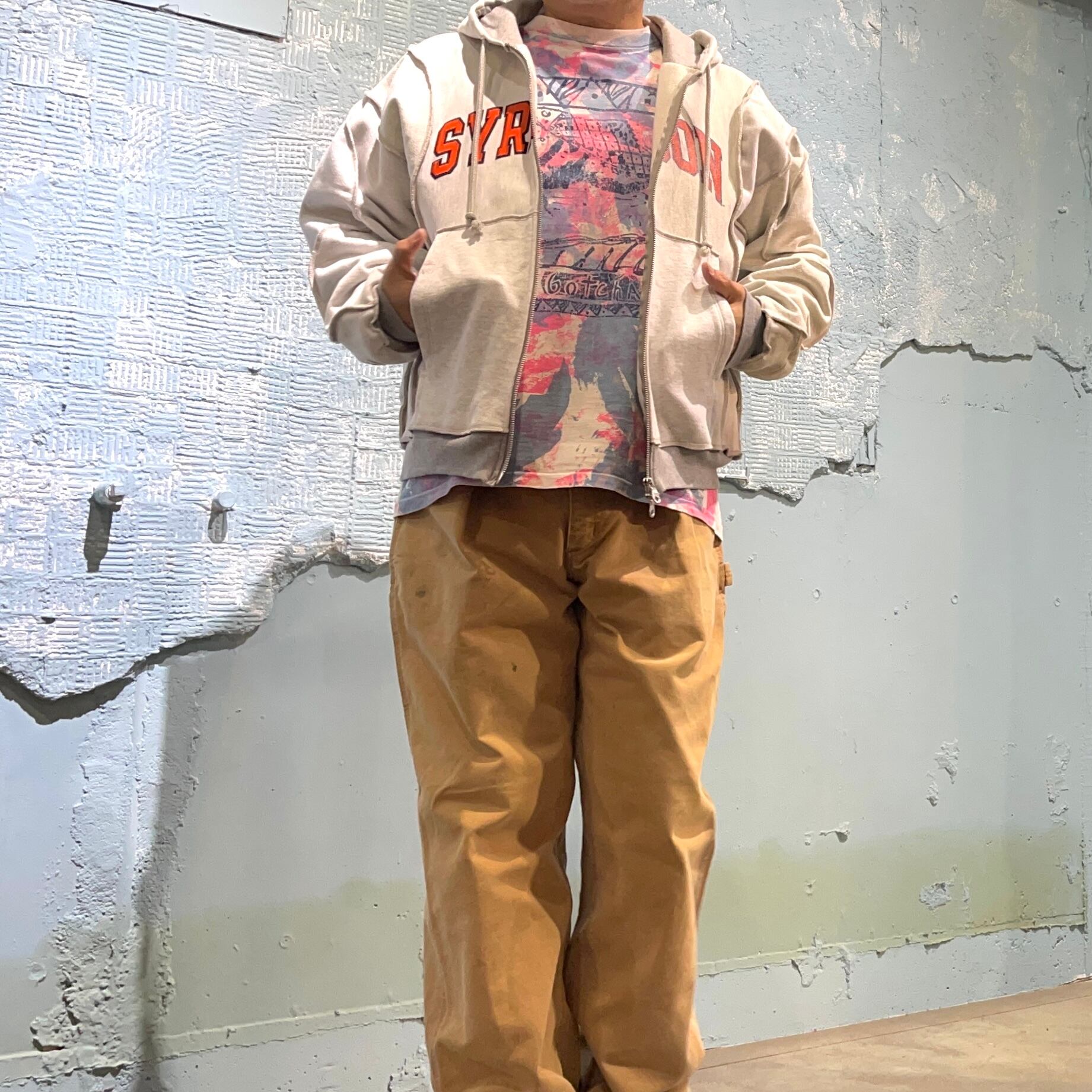 ユーズドの2種類のスウェットを使用したジップアップパーカー 柄の出方などがとても斬新、