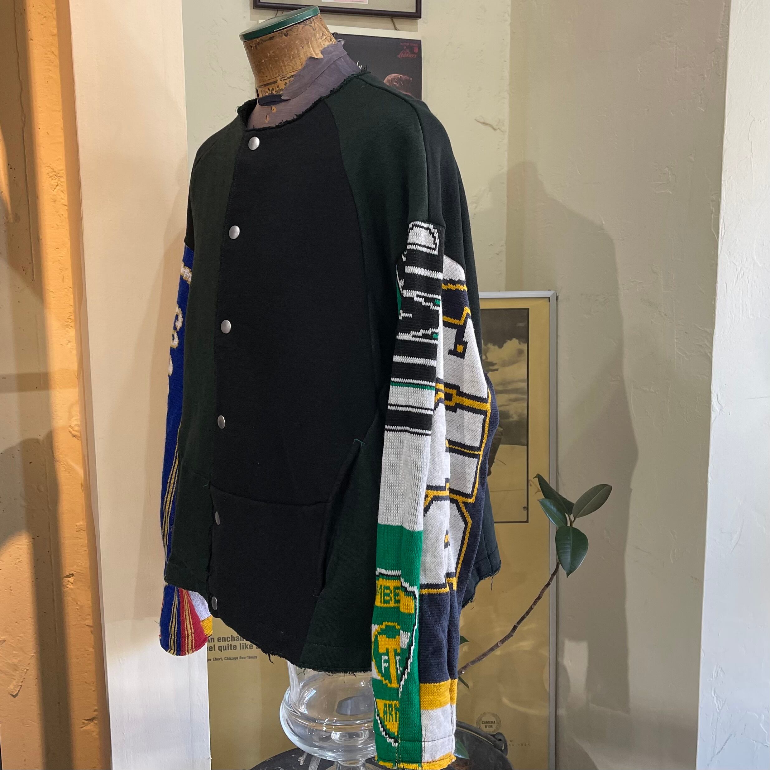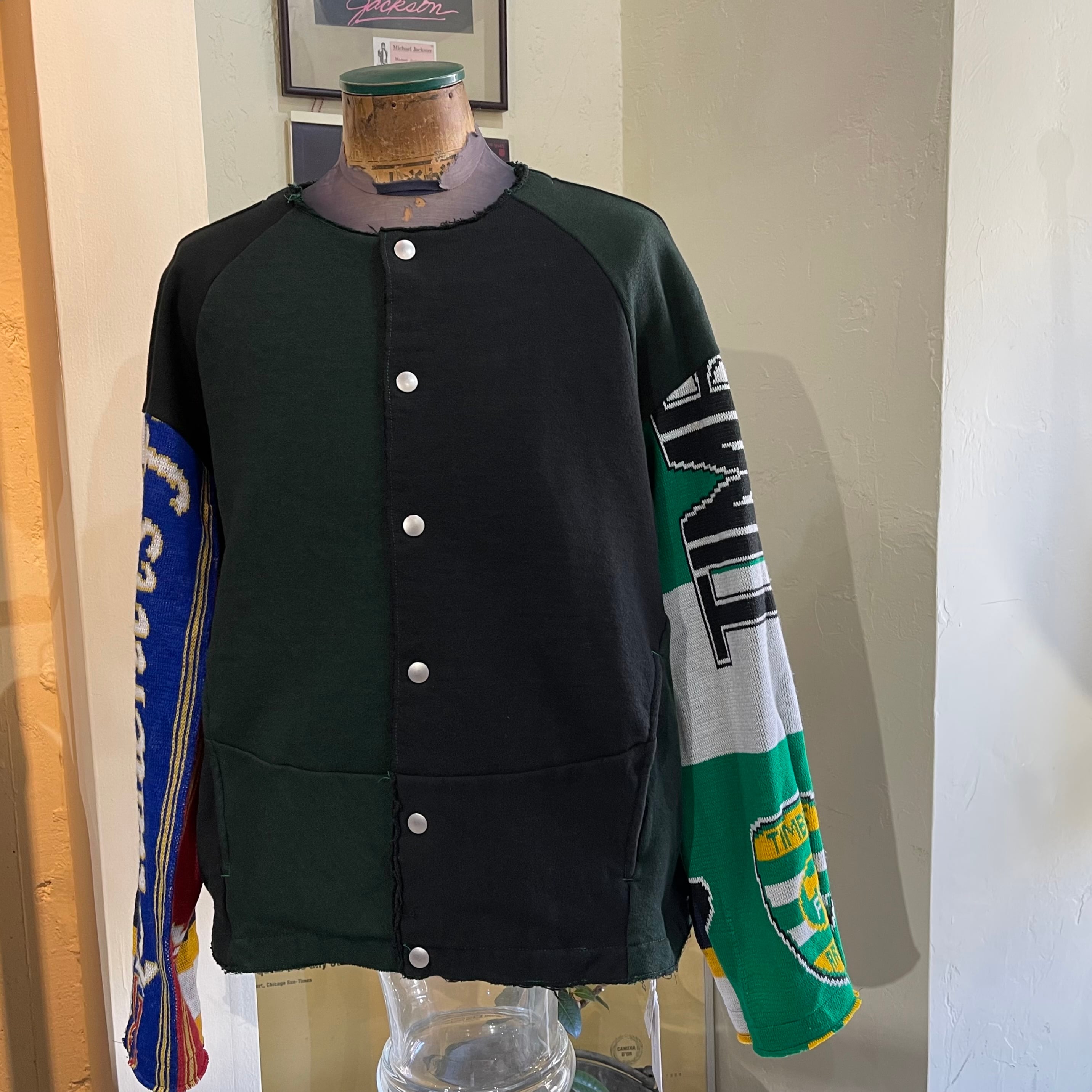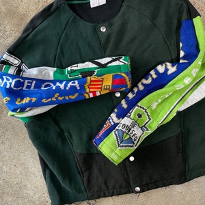 ユーズドのスウェットとサッカーのチーム名などを施したマフラーを素材にしたのノーカラースウェットブルゾンです。 ビンテージな洗い込まれた風合いを楽しみながら着ていただけます。