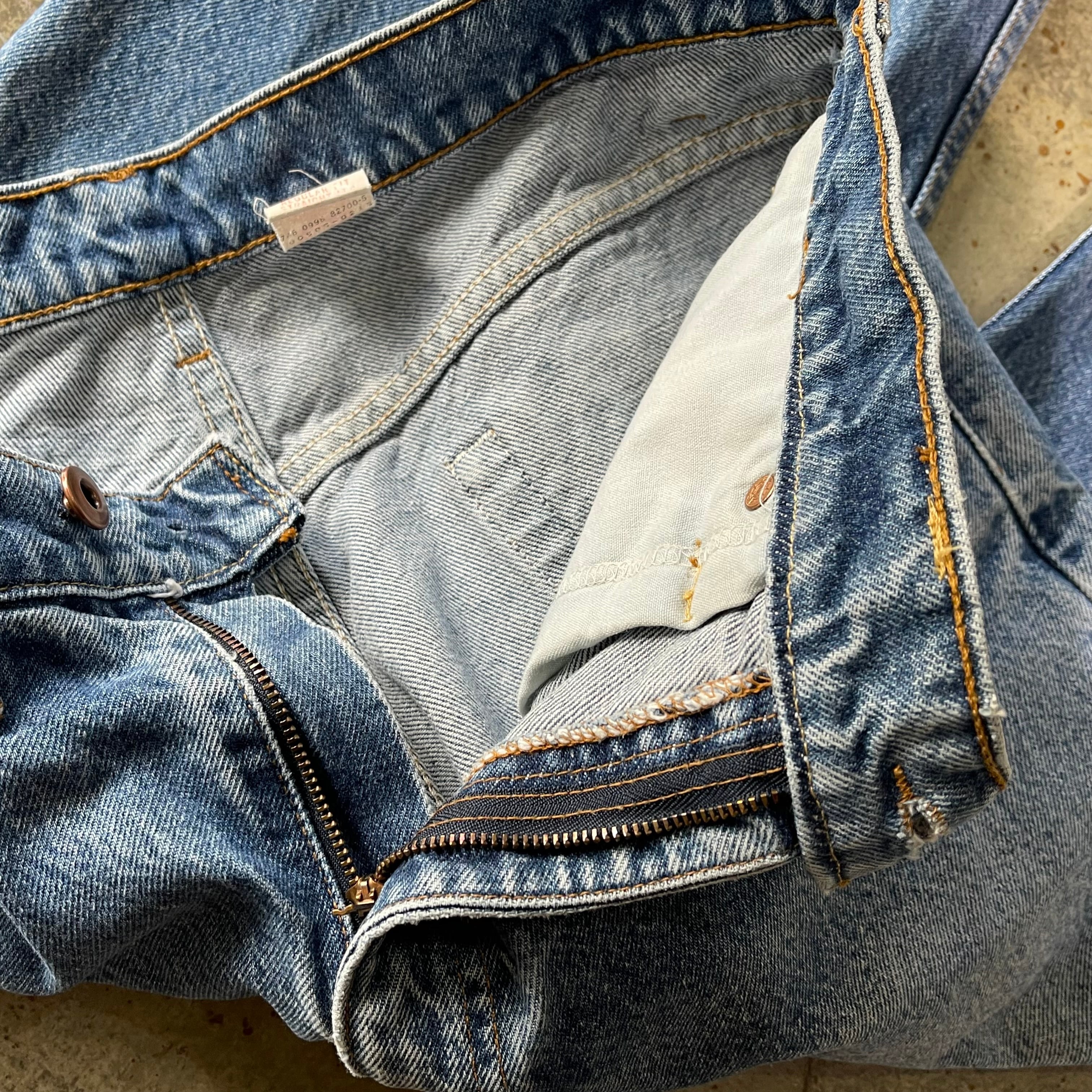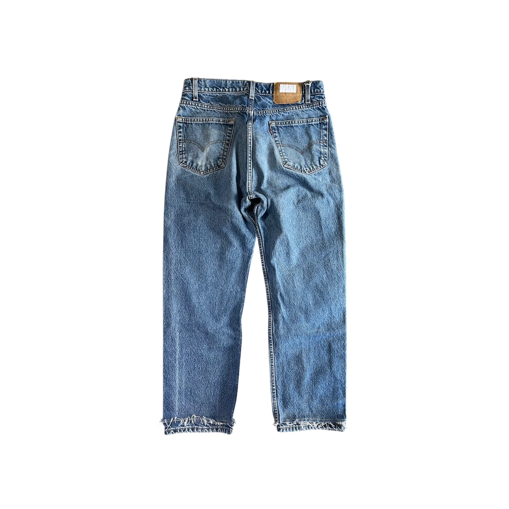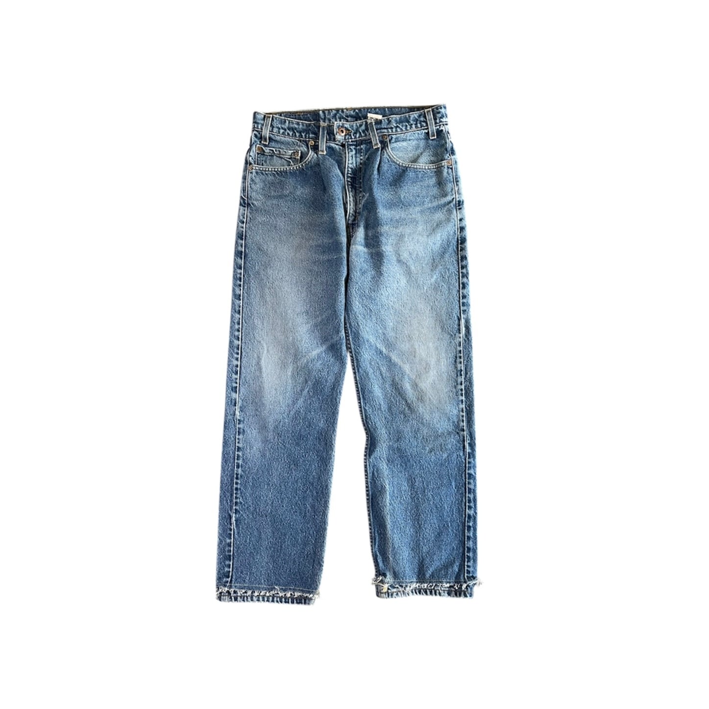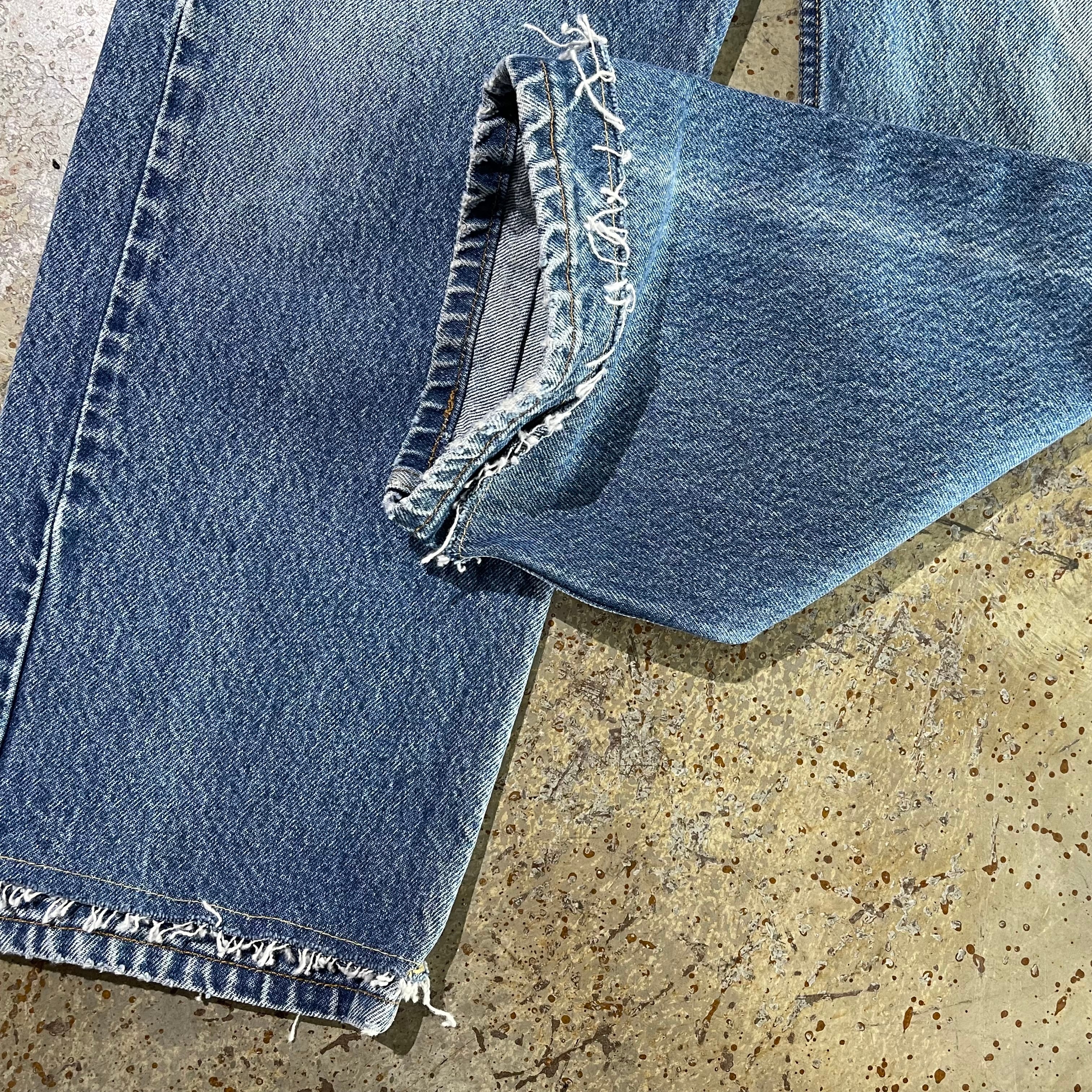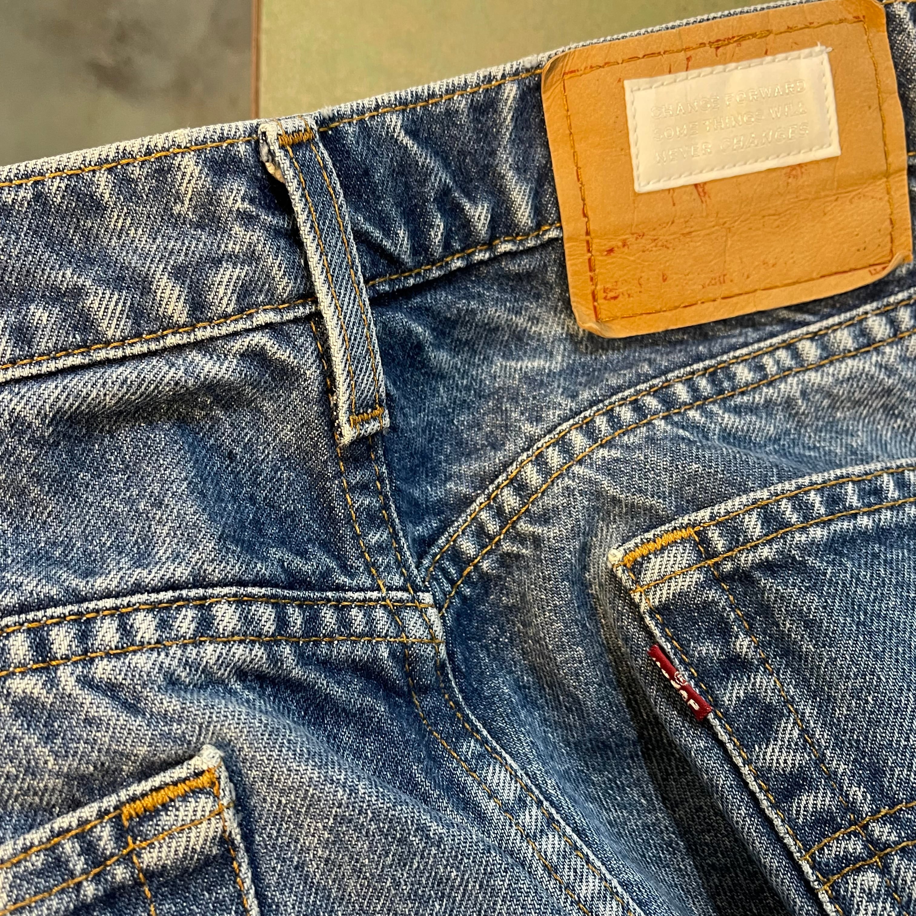 程よく履き込まれた levi'sの505 36インチを使いワンタック加えるようなあっさりリメイクを施した太めボトムス 34incほどにウエストを修正 さらに裾を付け替えたカフス仕上げにしています、あえて2段になるようなパンキッシュな加工。