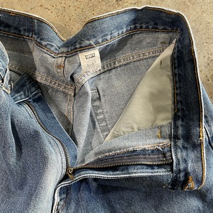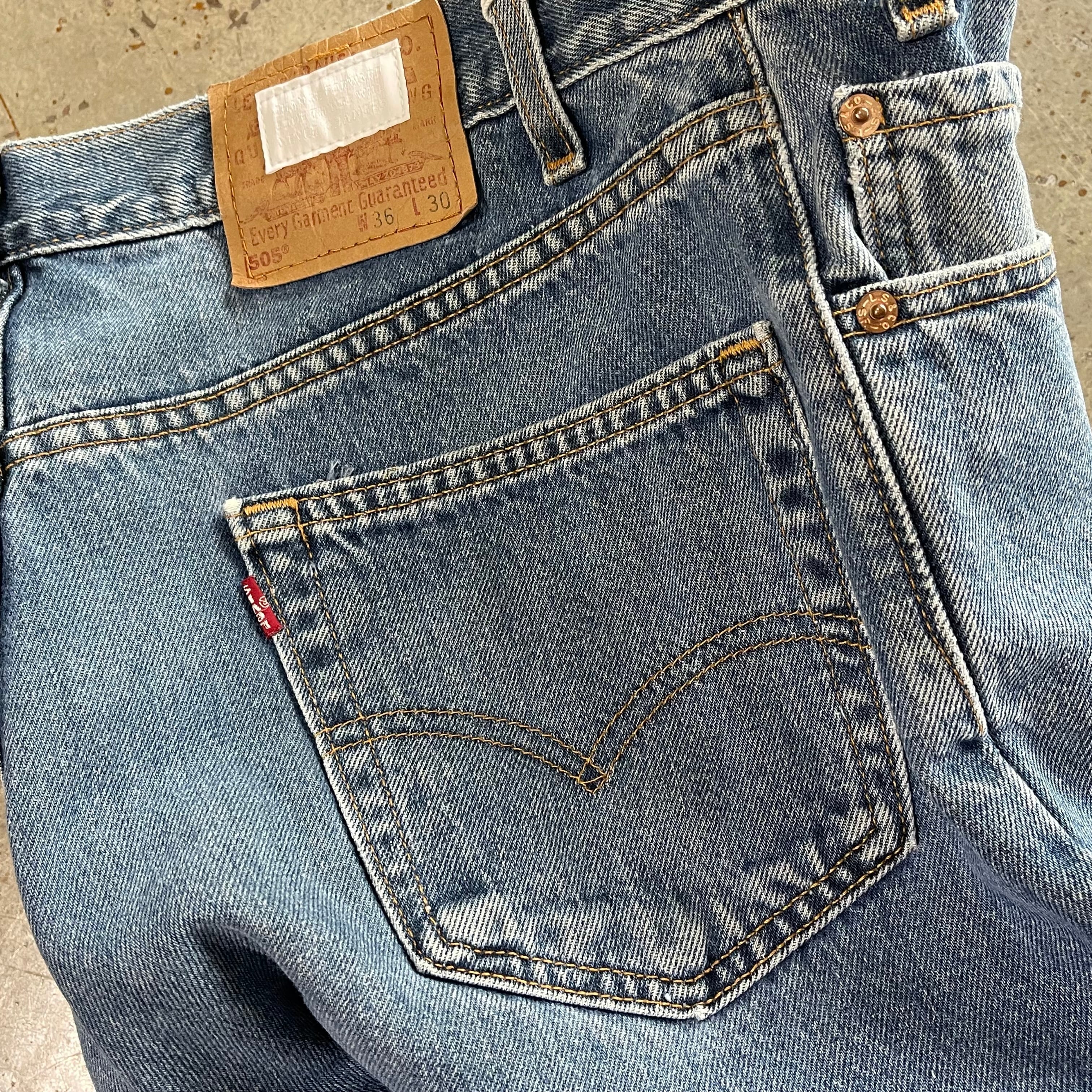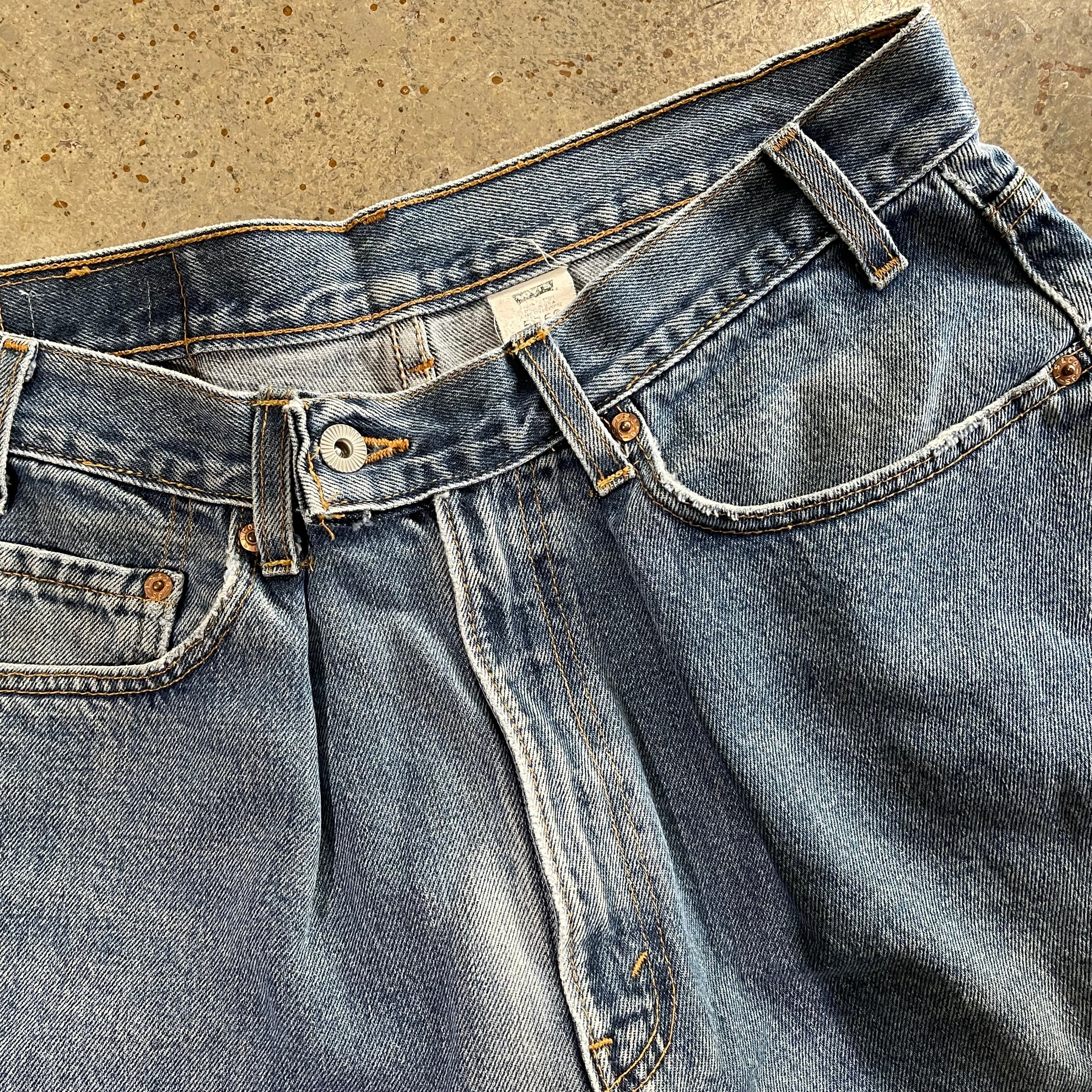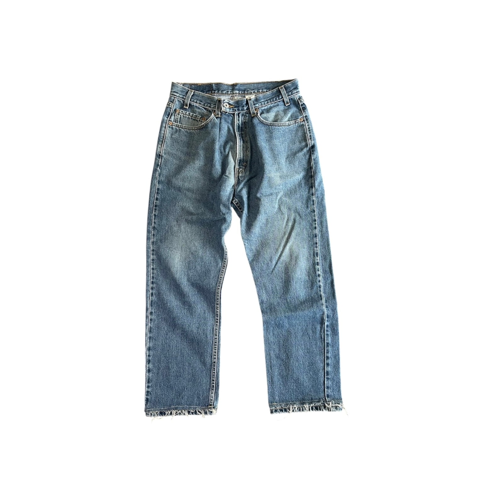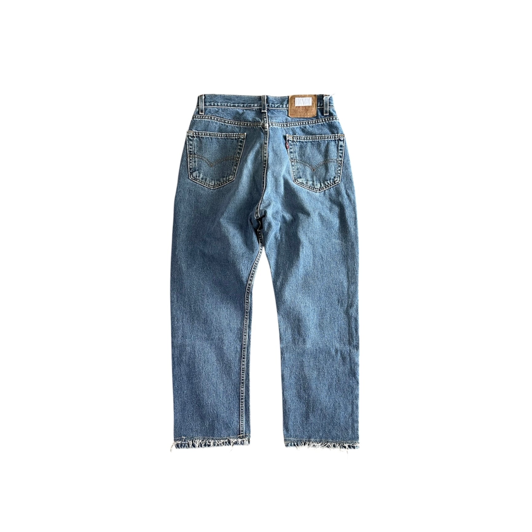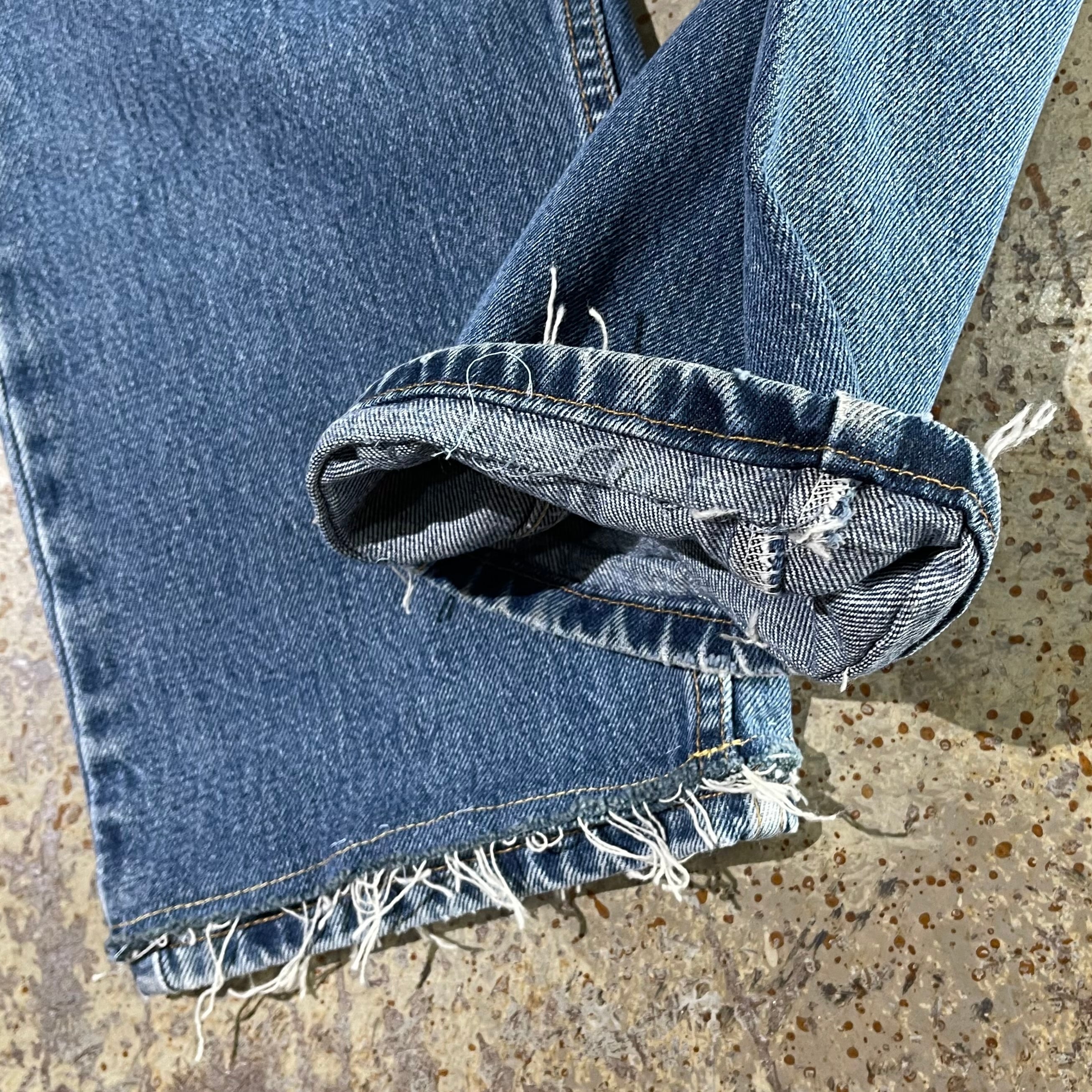 程よく履き込まれた levi'sの505 36インチを使いワンタック加えるようなあっさりリメイクを施した太めボトムス 34incほどにウエストを修正 さらに裾を付け替えたカフス仕上げにしています、あえて2段になるようなパンキッシュな加工。