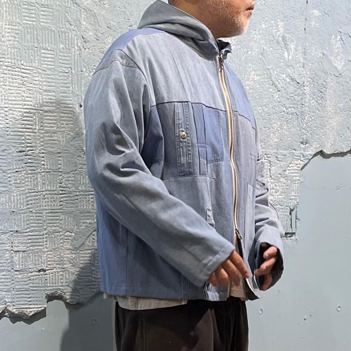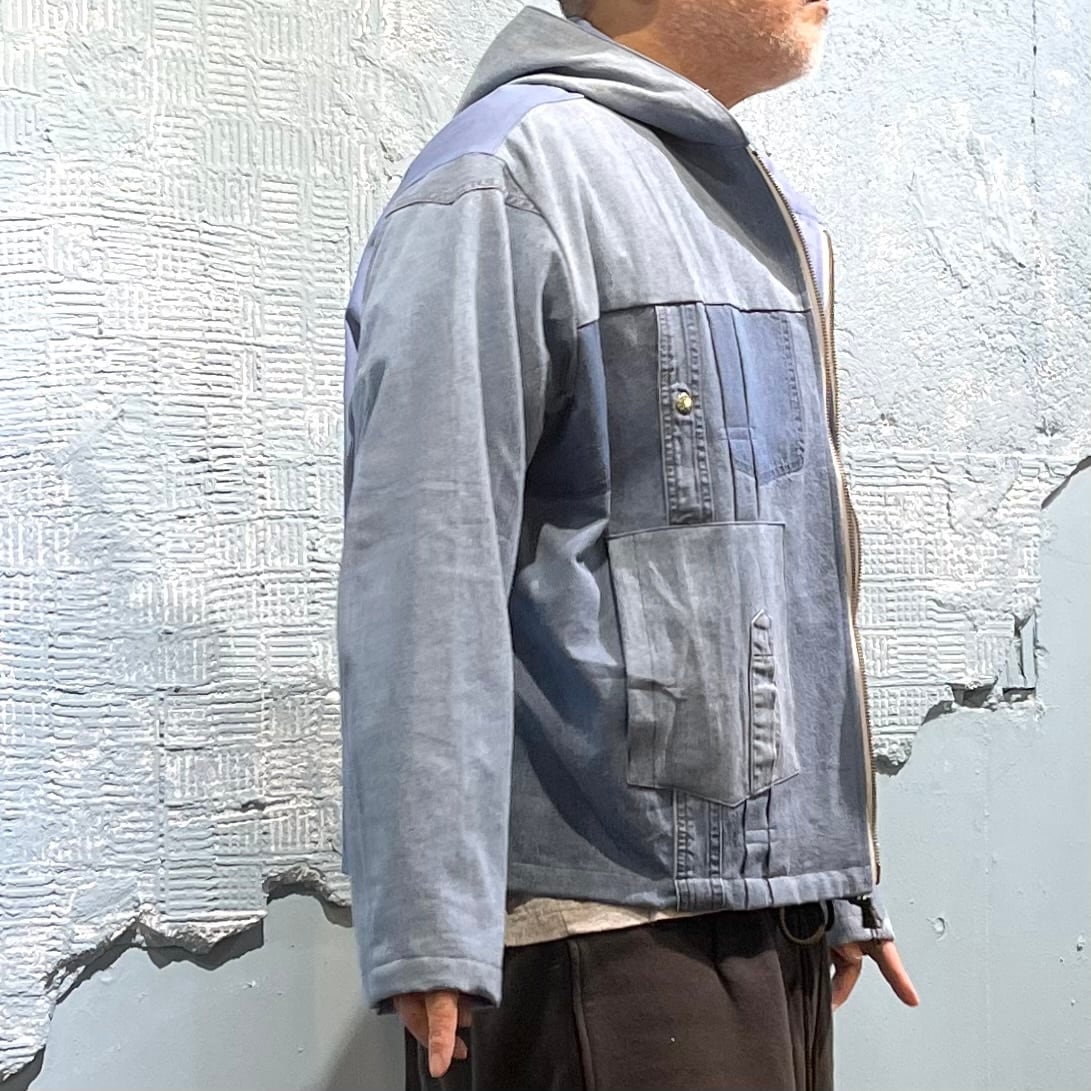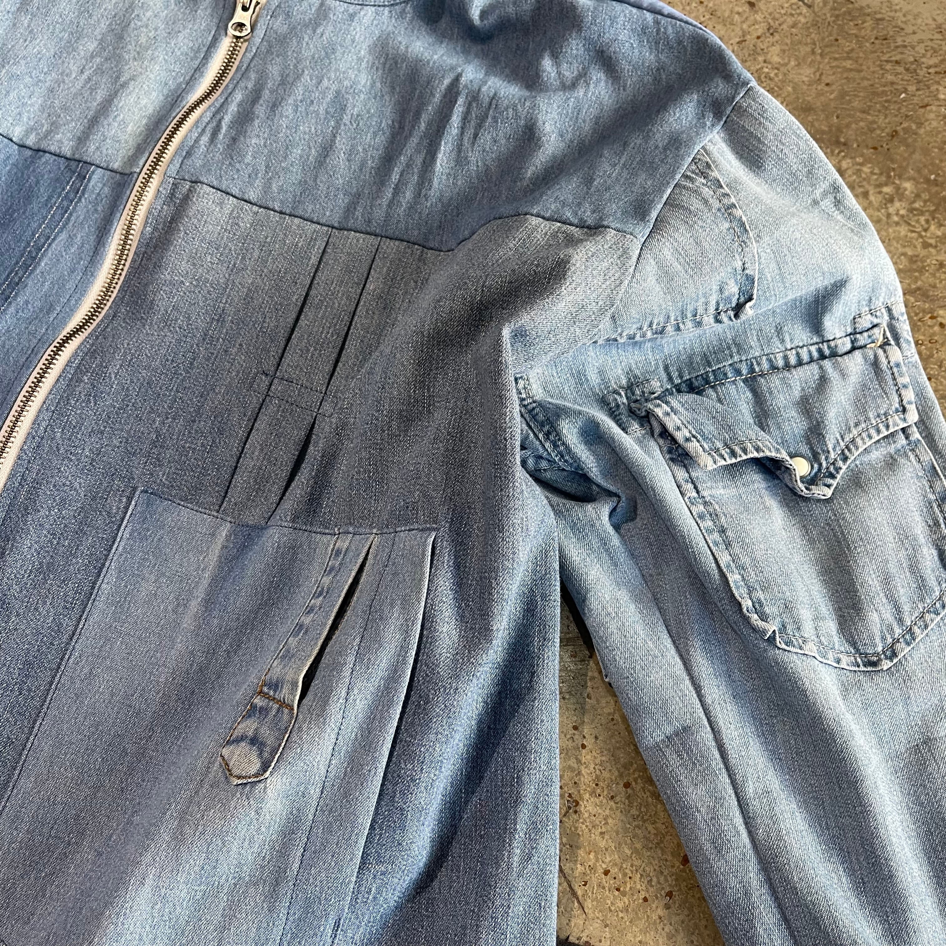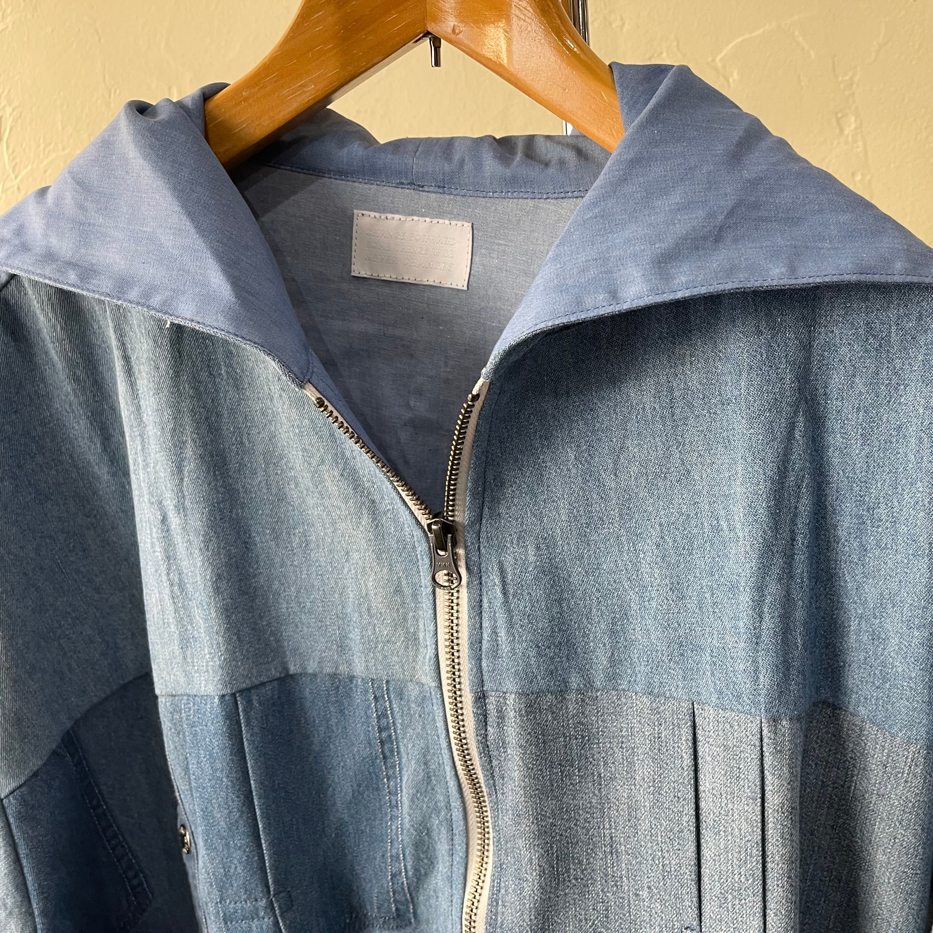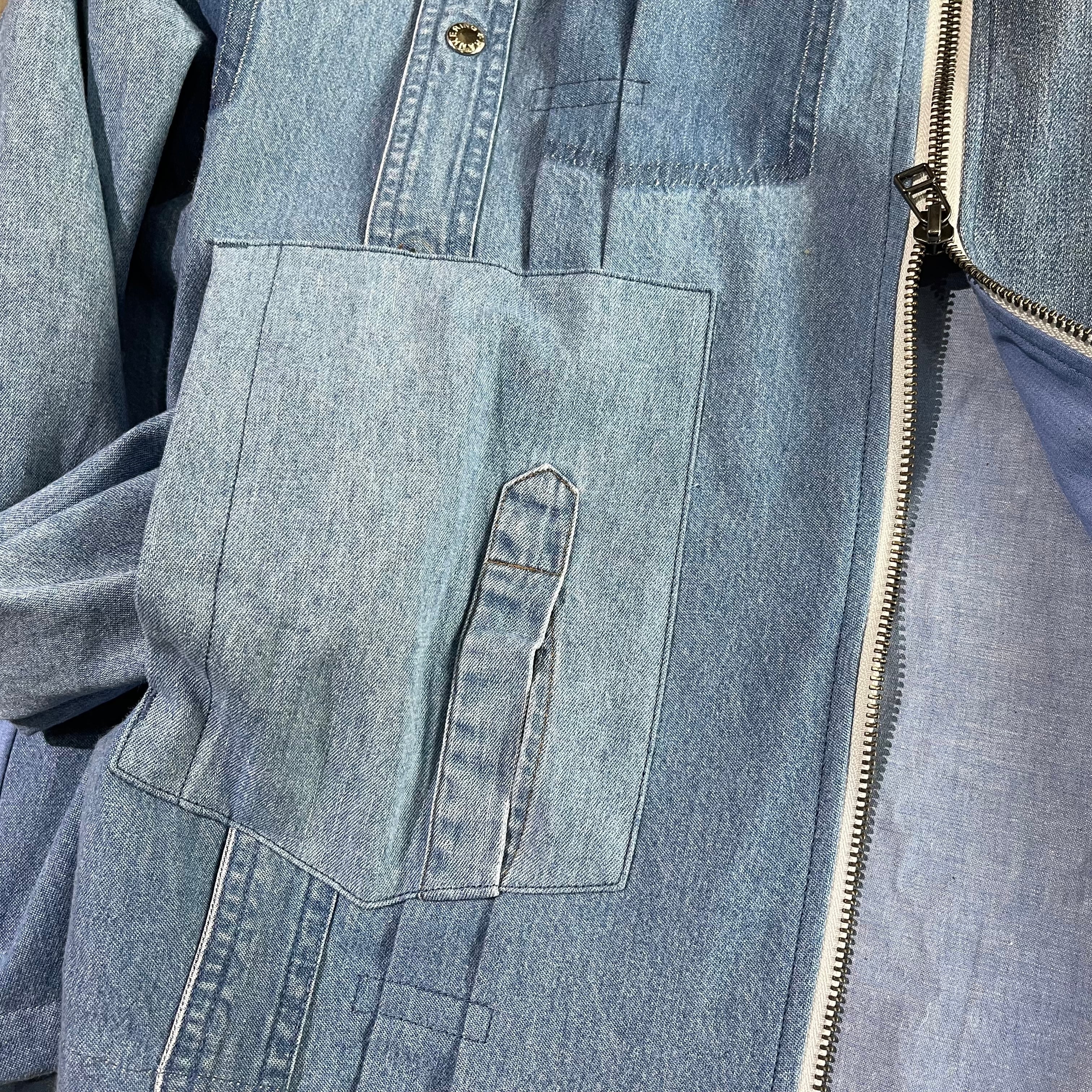 ユーズドのデニムシャツを素材に作り込まれジップアップシャツジャケットです。 ユーズドの経年変化の異なるデニムを袖にポケットを配置したりフロント部分を袖にしたり、自由度の高いリメイクを施しております。