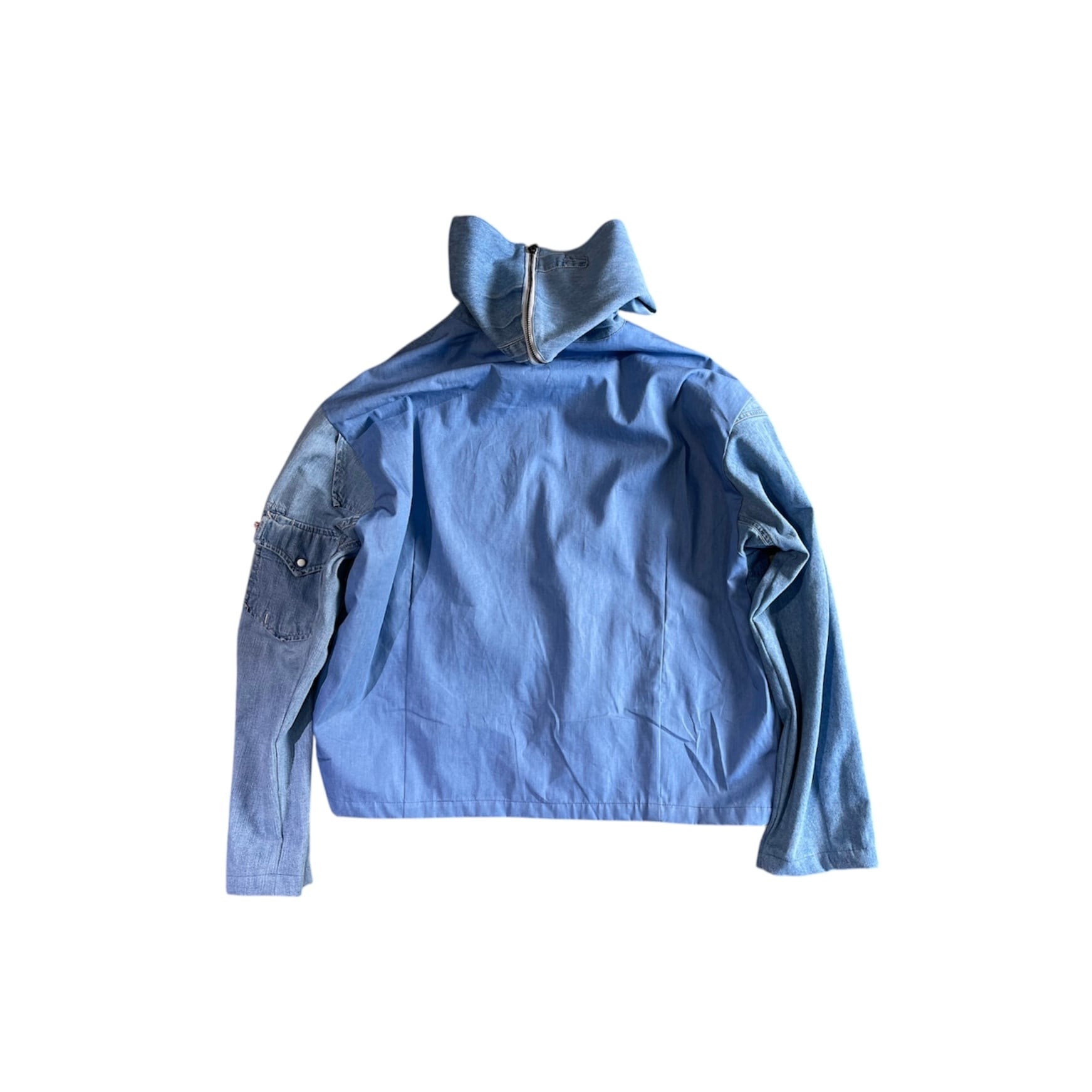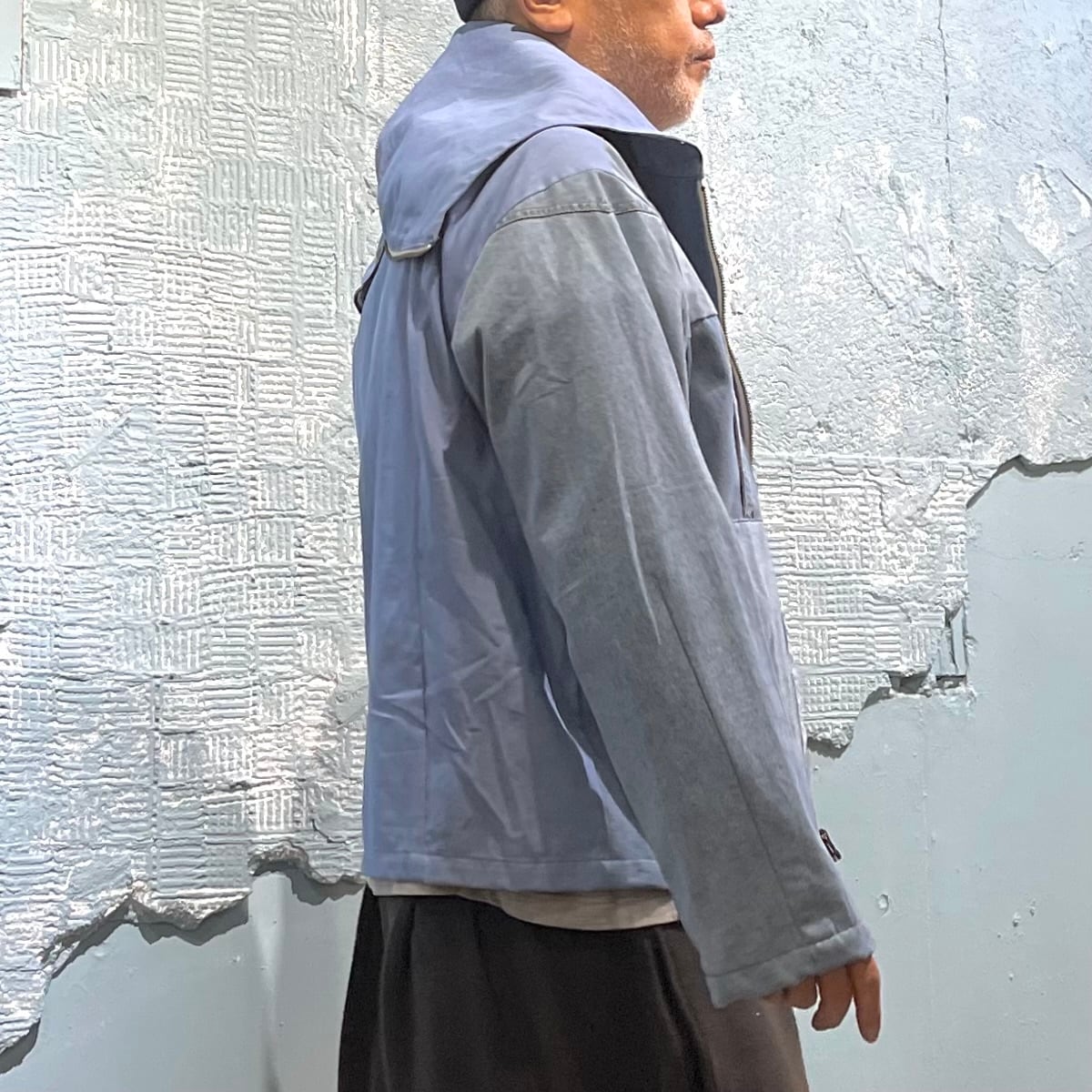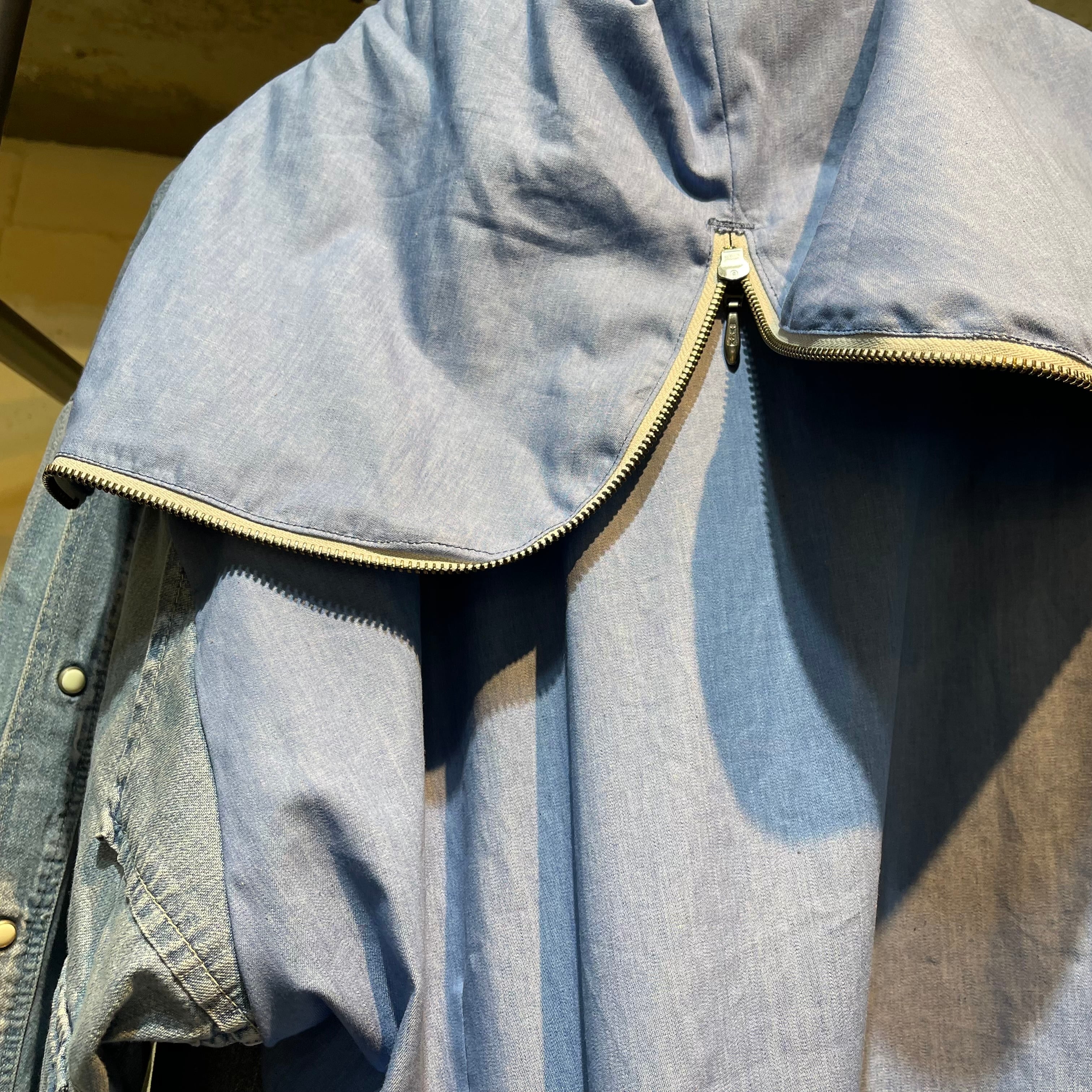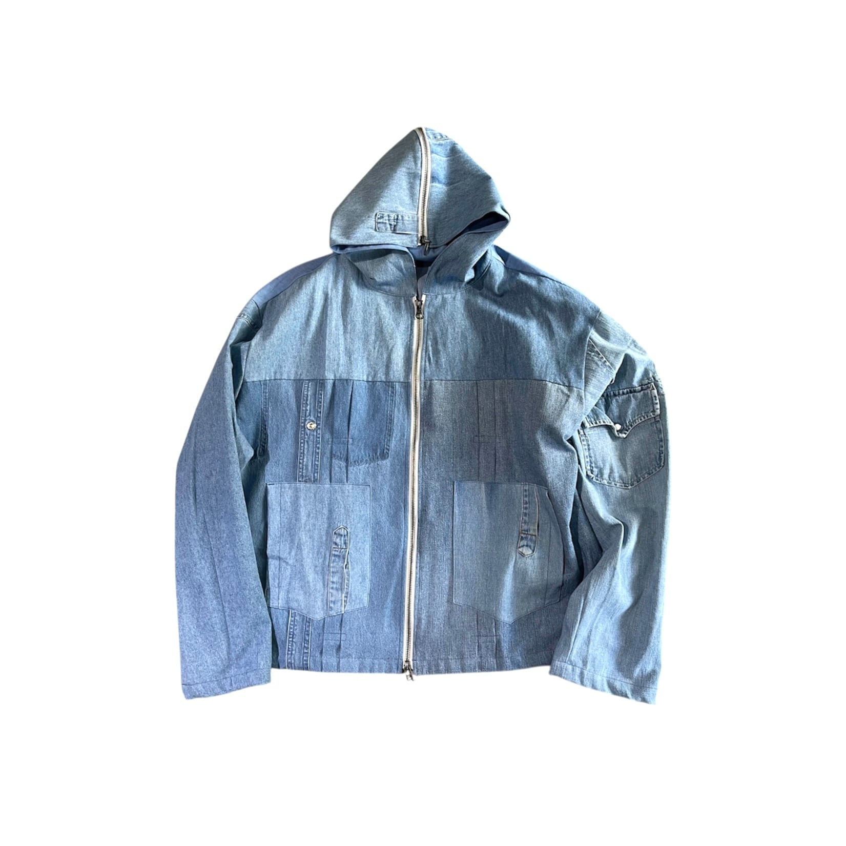 ユーズドのデニムシャツを素材に作り込まれジップアップシャツジャケットです。 ユーズドの経年変化の異なるデニムを袖にポケットを配置したりフロント部分を袖にしたり、自由度の高いリメイクを施しております。