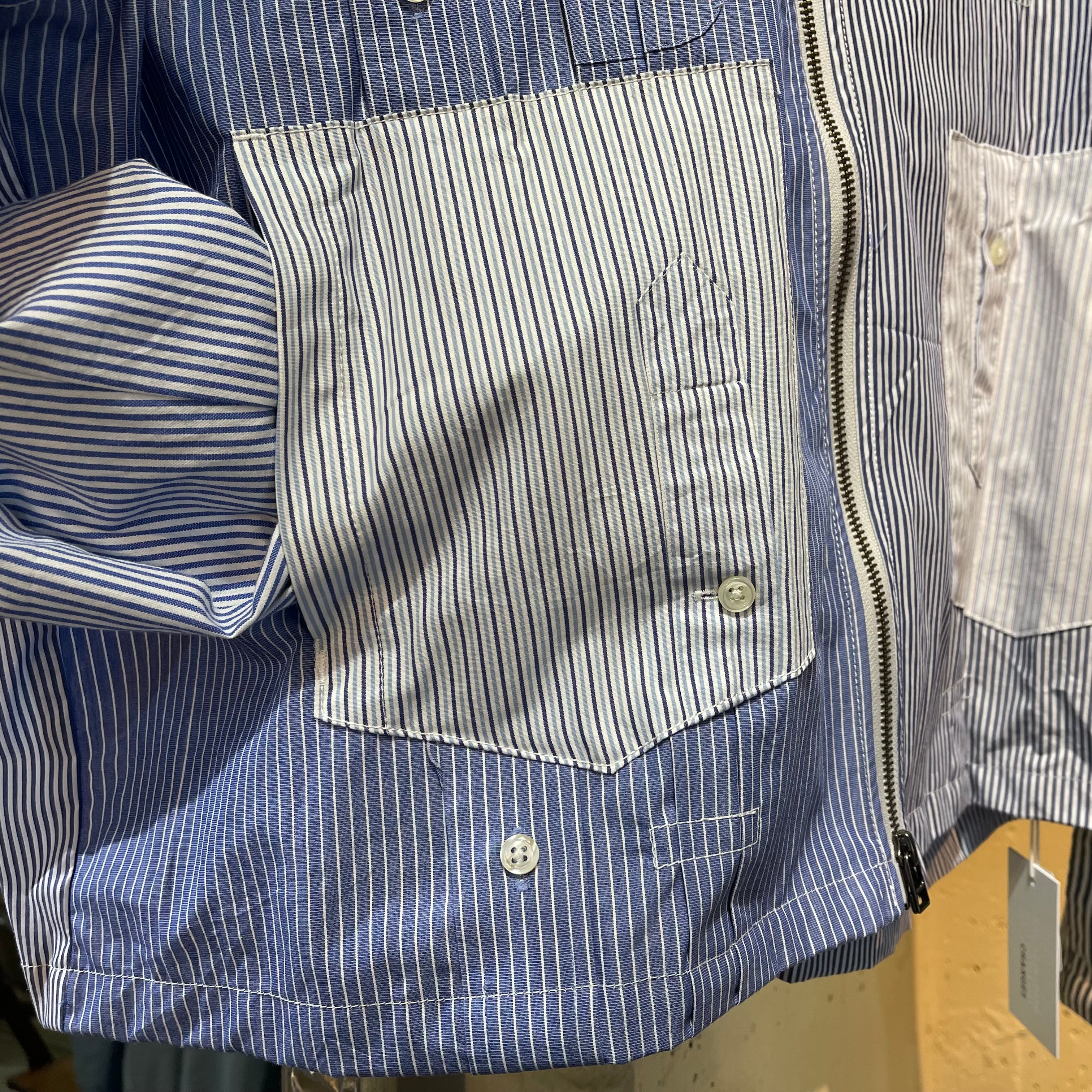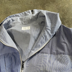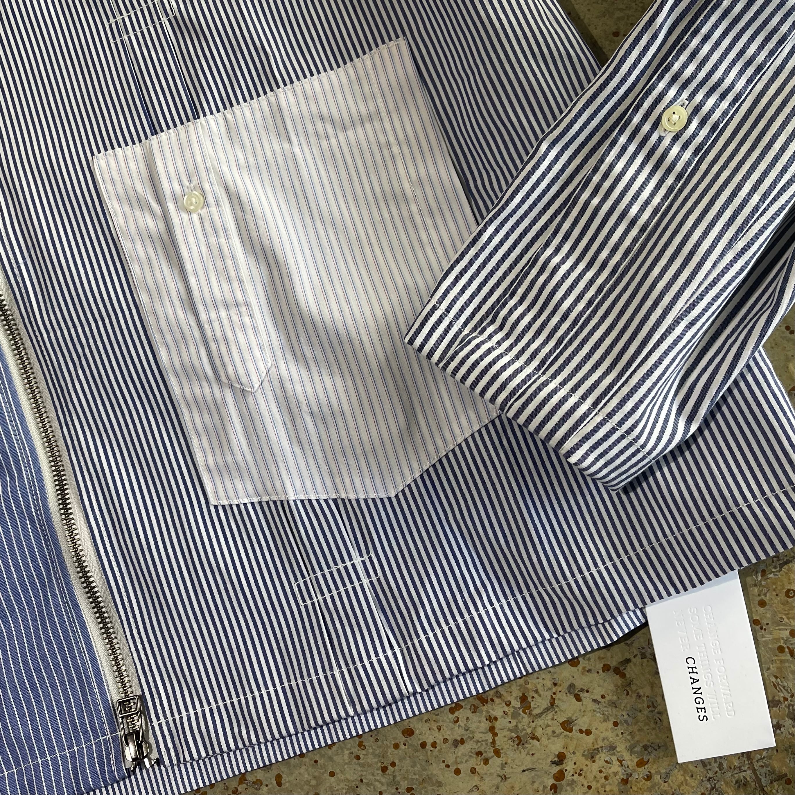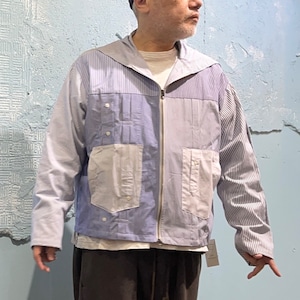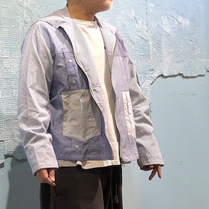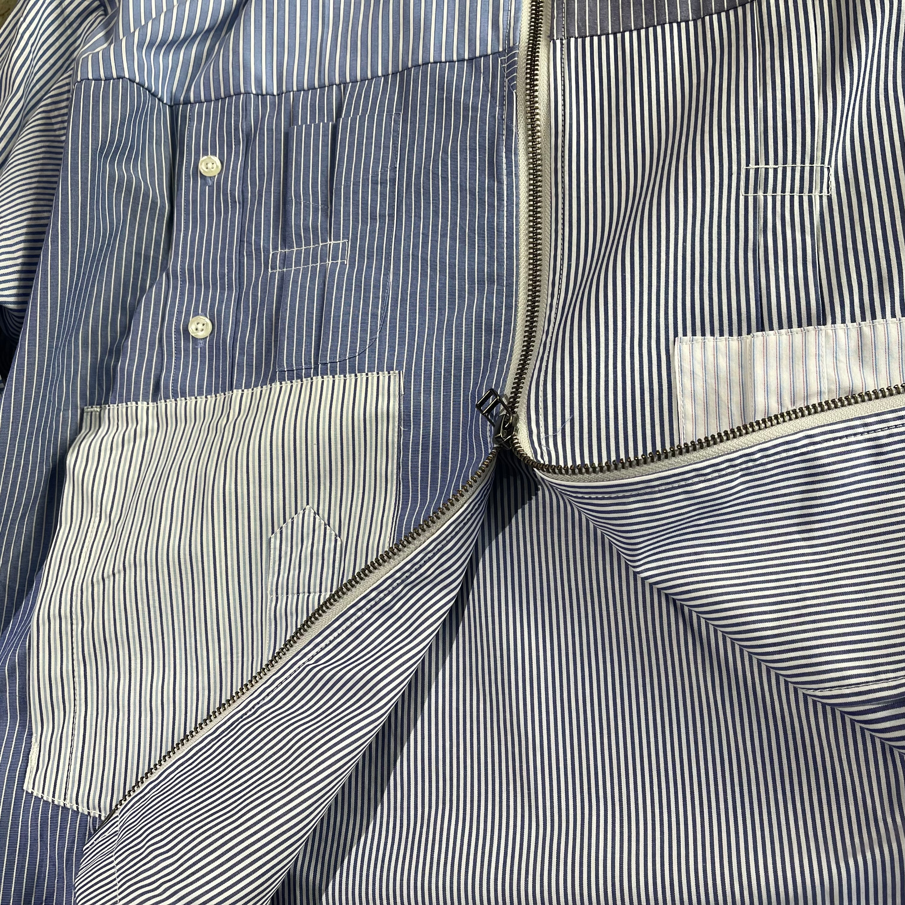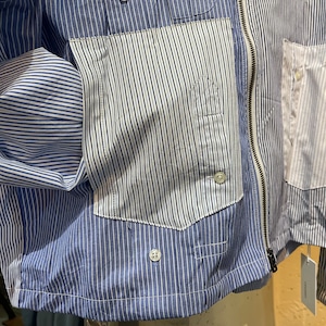 ユーズドのブロードのドレスシャツを素材に作り込まれジップアップシャツジャケットです。 ユーズドのストライプがことなる素材のシャツ、袖にポケットを配置したりフロント部分を袖にしたり、自由度の高いリメイクを施しております。