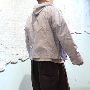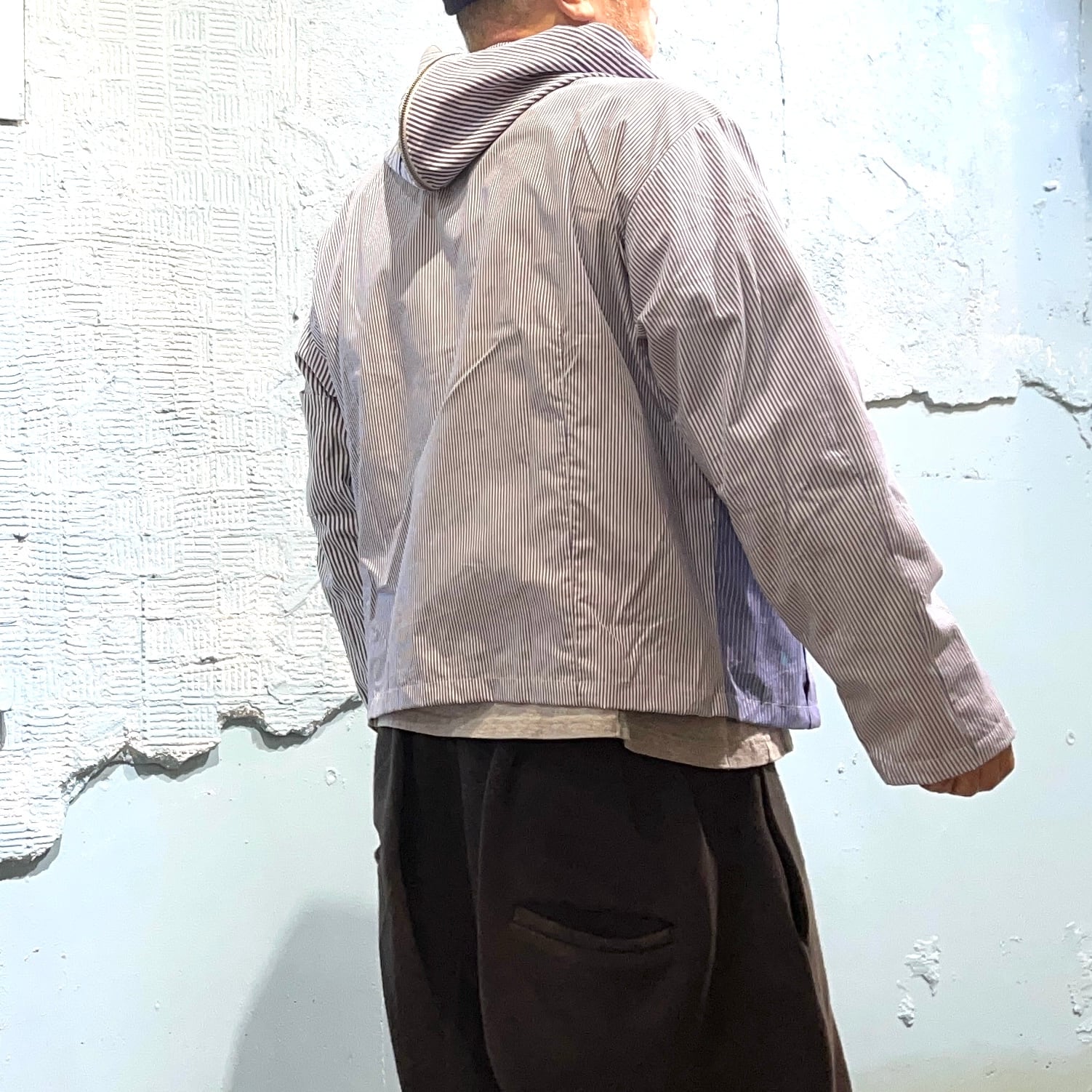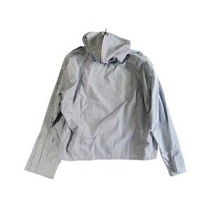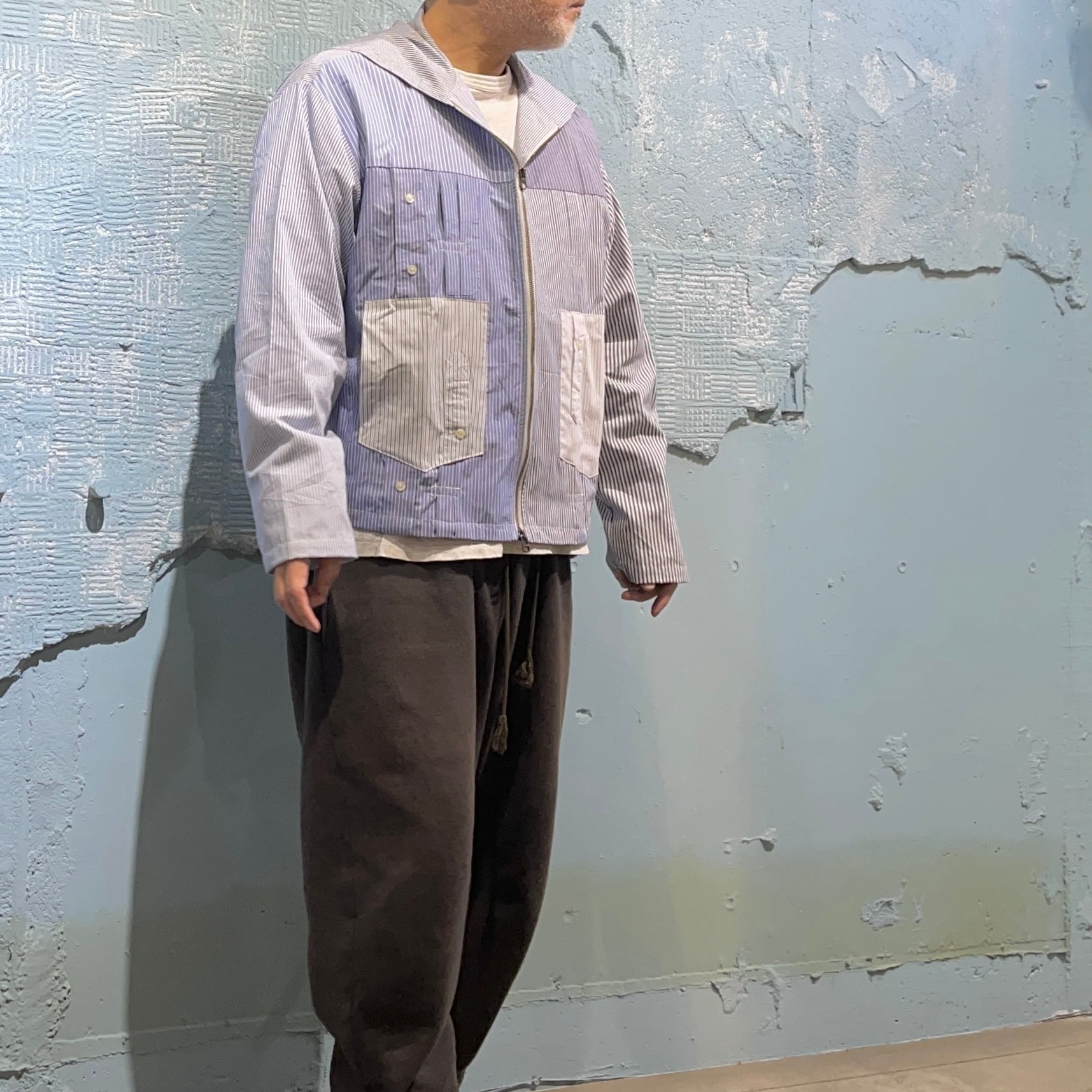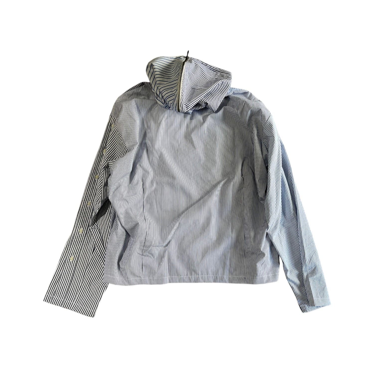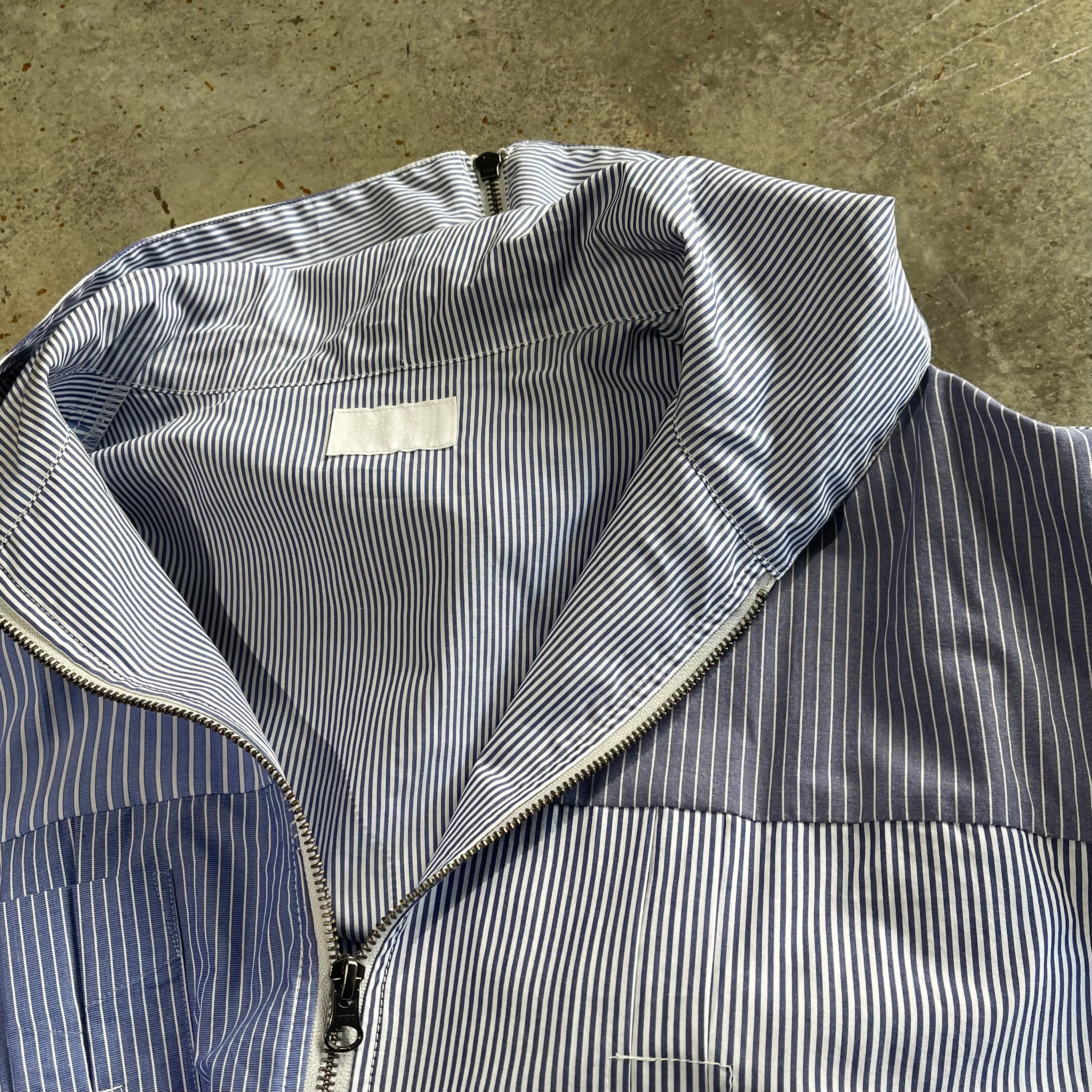 ユーズドのブロードのドレスシャツを素材に作り込まれジップアップシャツジャケットです。 ユーズドのストライプがことなる素材のシャツ、袖にポケットを配置したりフロント部分を袖にしたり、自由度の高いリメイクを施しております。