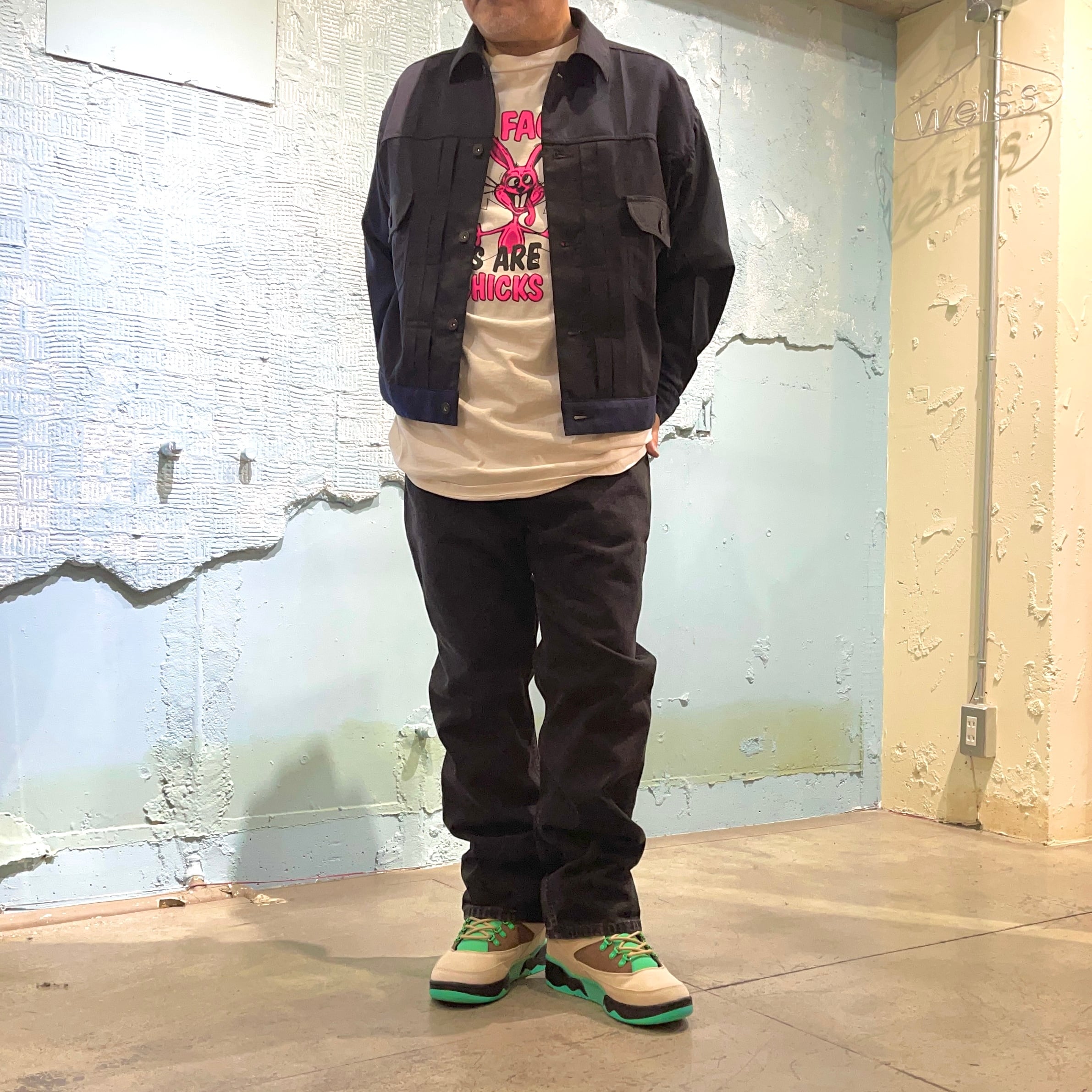 USEDのスラックスやスーツを使用して作られた薄手アウター シルエットは2ndといわれ親しまれるリーバイスのデニムジャケットをサンプリングしています。 実際の物より横幅広くしてすっきり着れるようなシルエットバランスにモディファイ