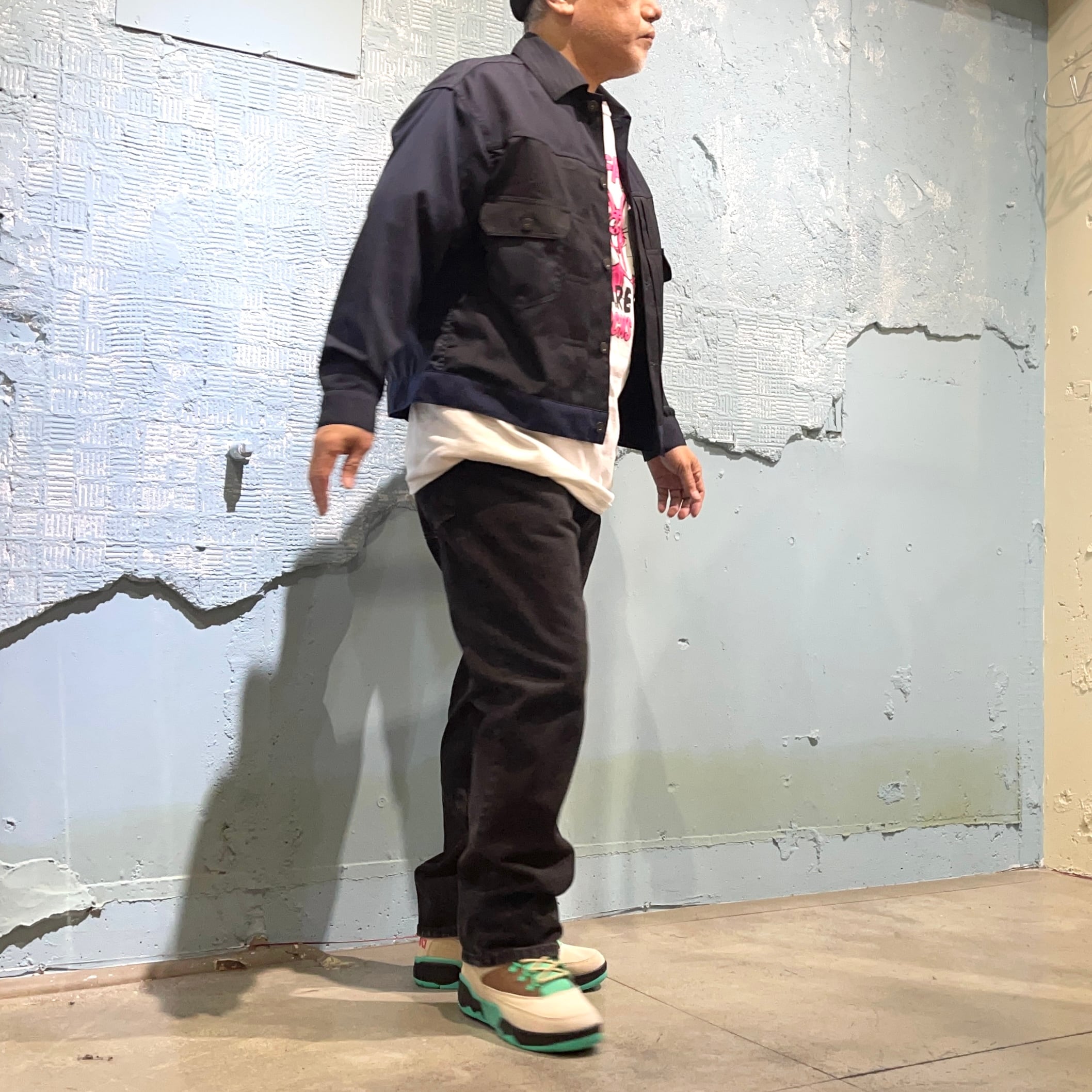 色々な素材が混じり合うので 手持ちのスラックスに合わせてセットアップのように着るのもお洒落 デニムパンツやスウェットパンツなどなど 色々なボトムスに合わせてお楽しみください。