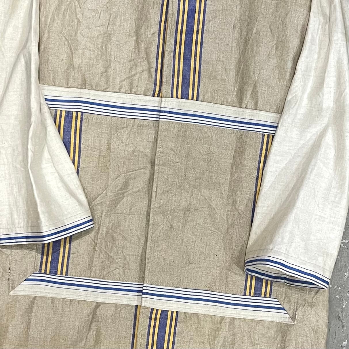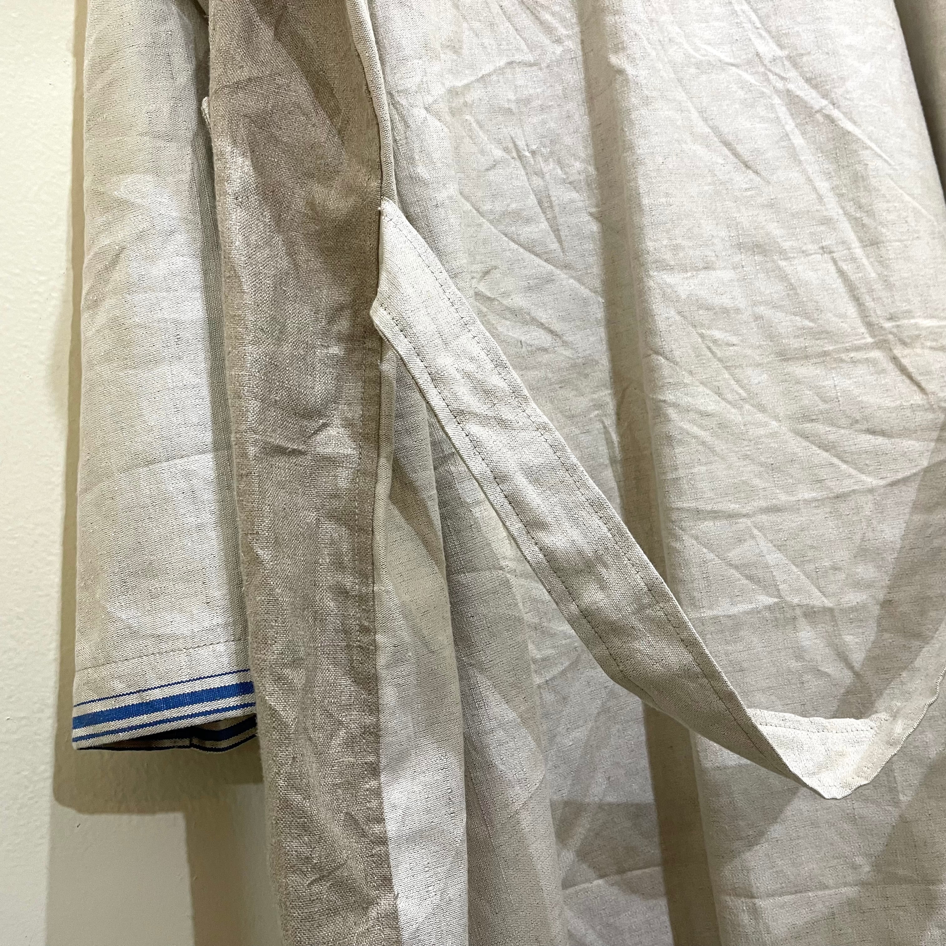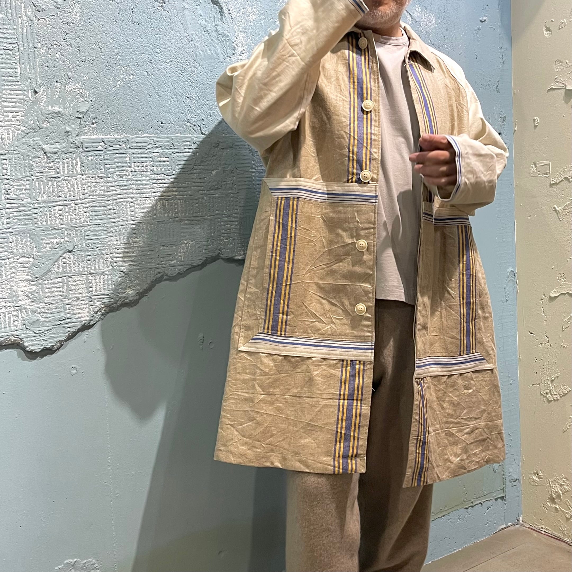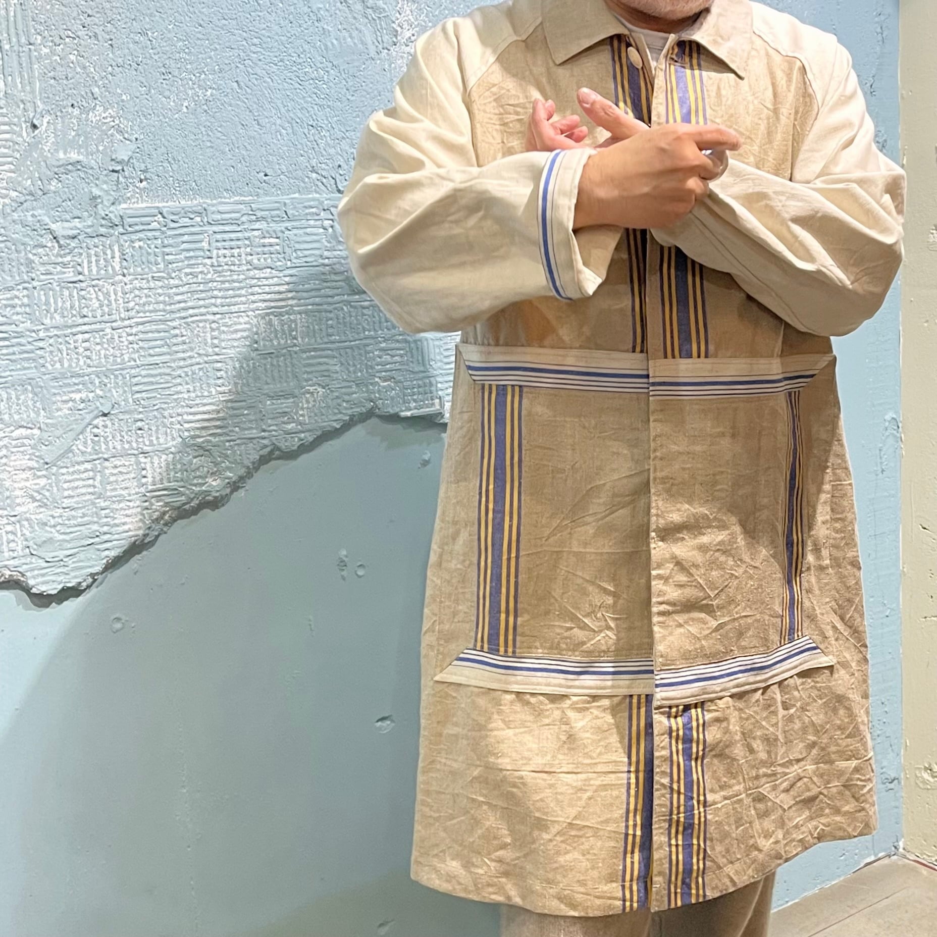 およそ100年前のビンテージの使われていない麻布を素材に仕立てたコートです。 ドイツに多く見られたアイロンをかける時に使われた伝統的なストライプが入ったリネン生地 とても耐久性のある素材感です、デッドストックの生地のため洗いをしっかりかけた上で製品にしております。