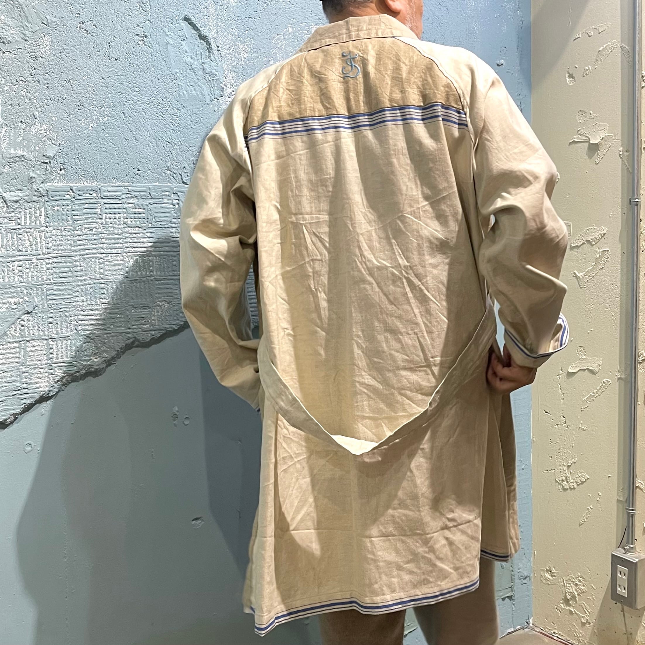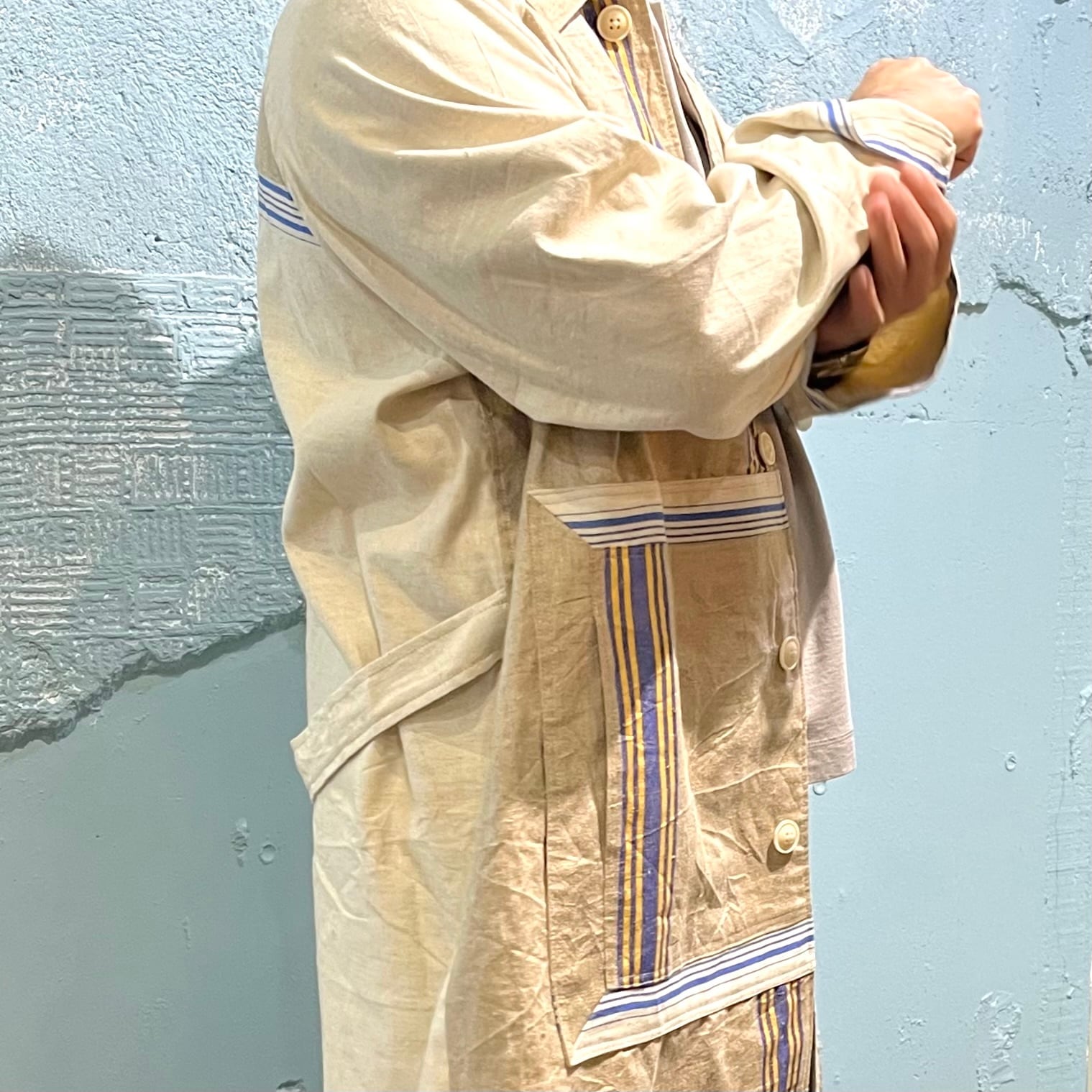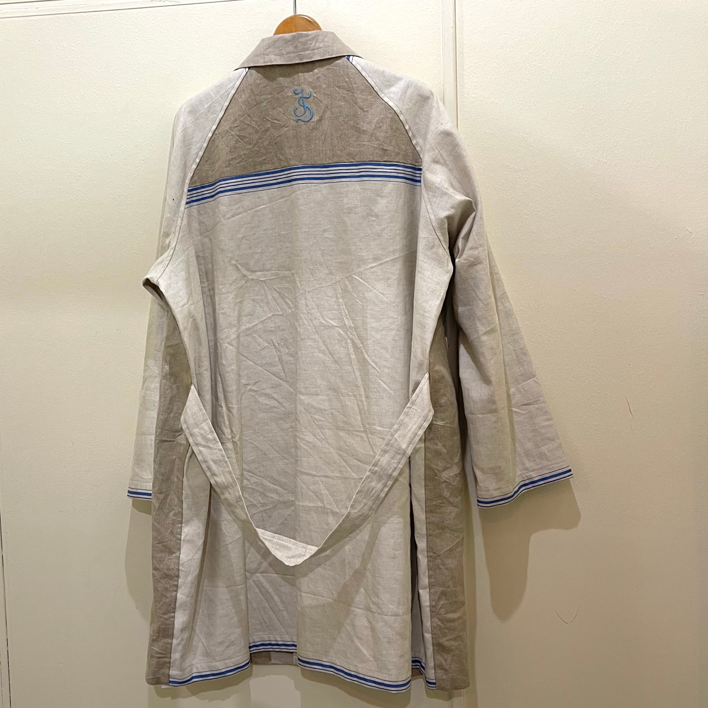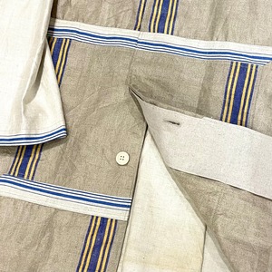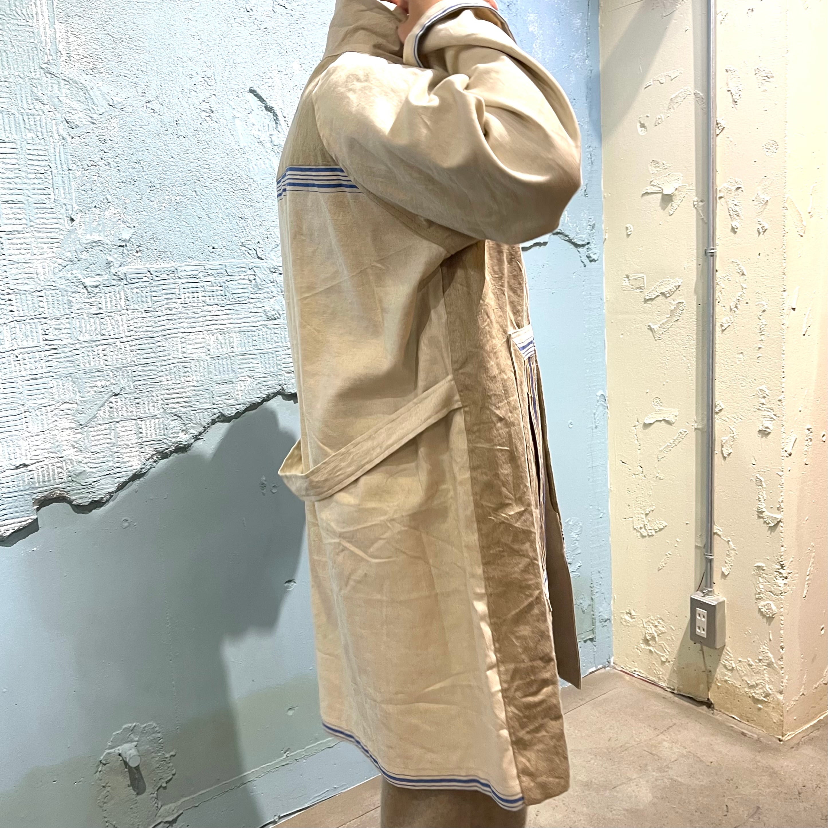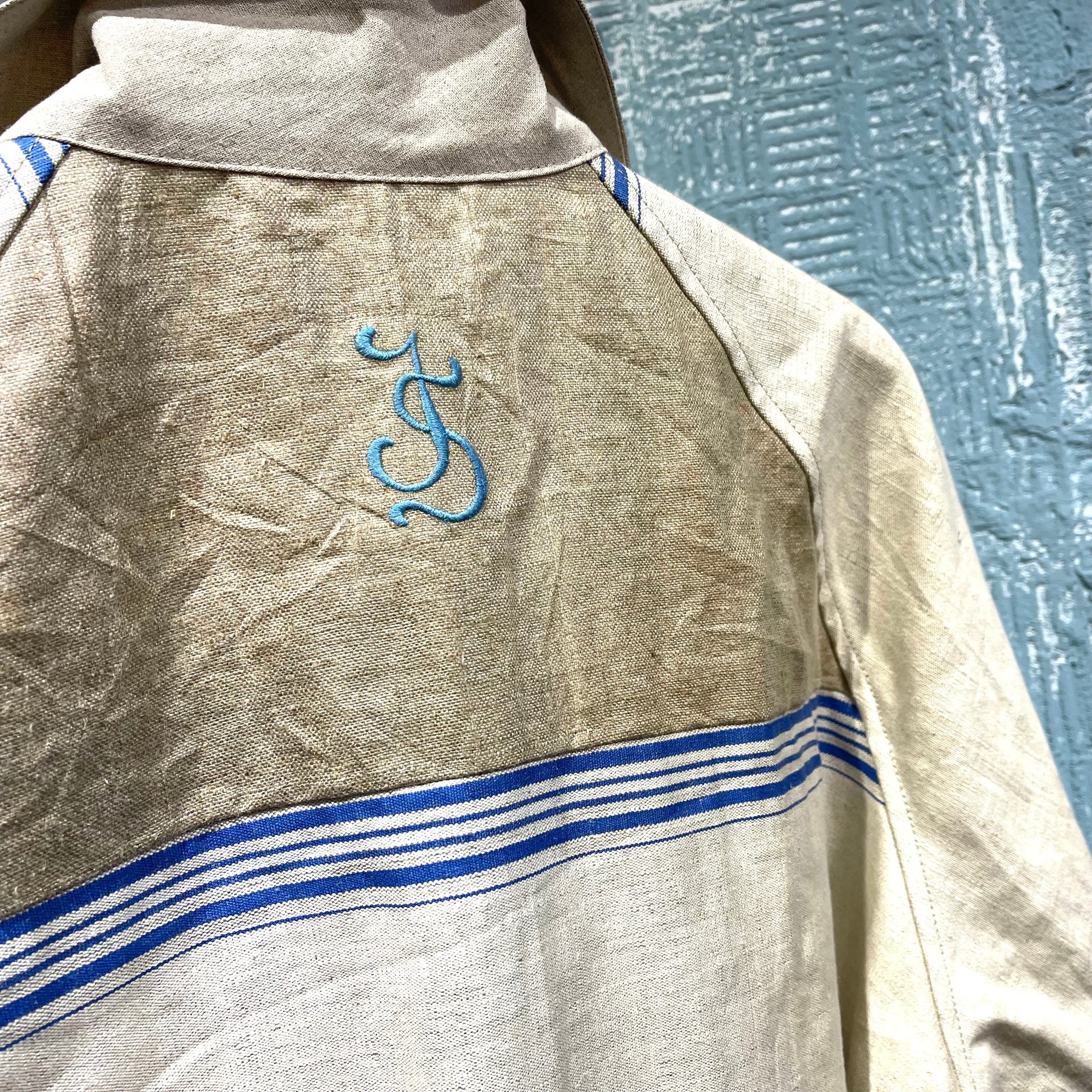 およそ100年前のビンテージの使われていない麻布を素材に仕立てたコートです。 ドイツに多く見られたアイロンをかける時に使われた伝統的なストライプが入ったリネン生地 とても耐久性のある素材感です、デッドストックの生地のため洗いをしっかりかけた上で製品にしております。