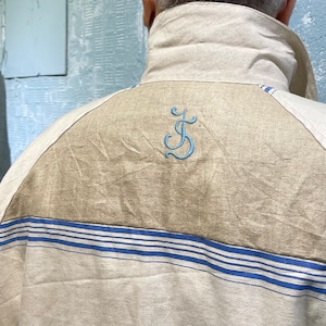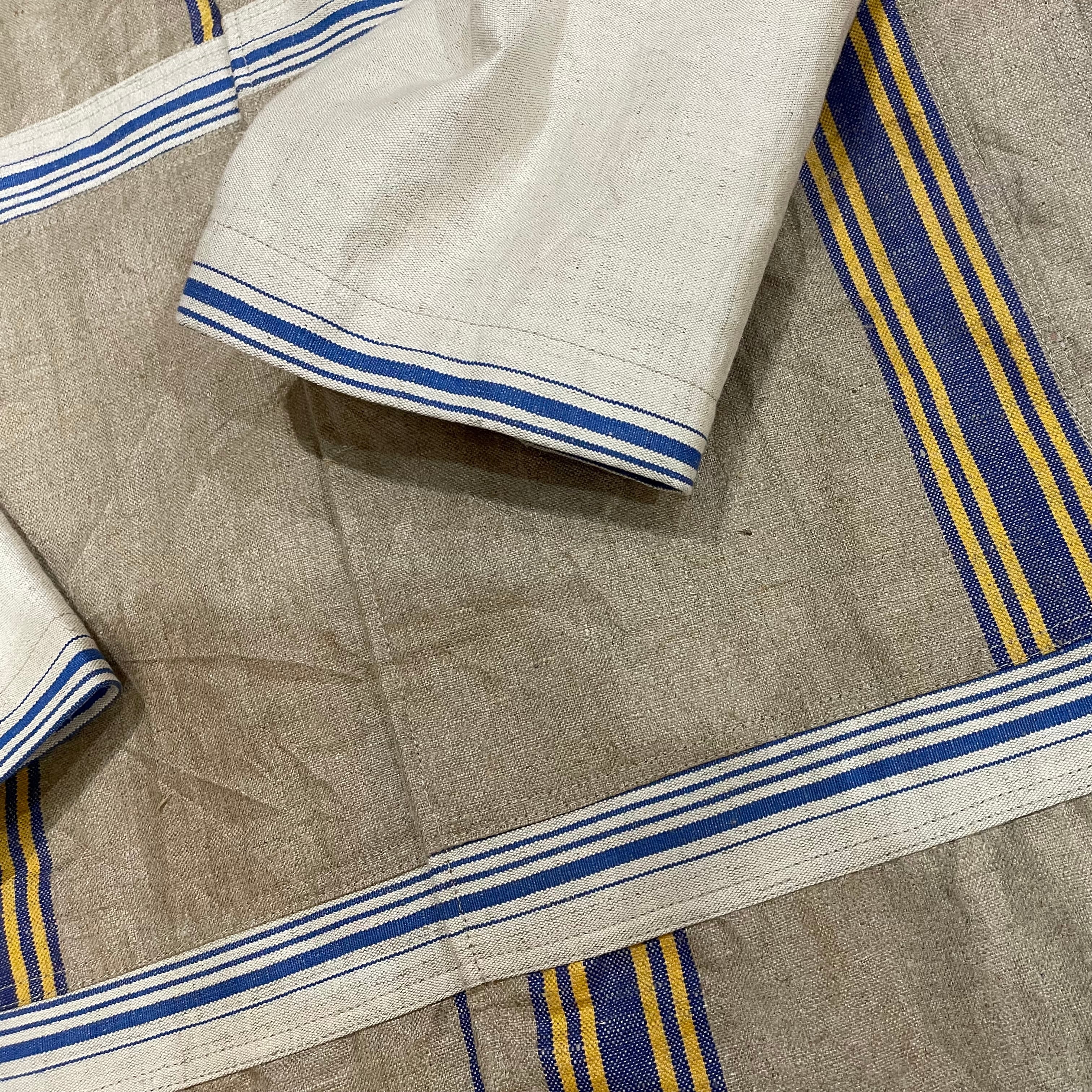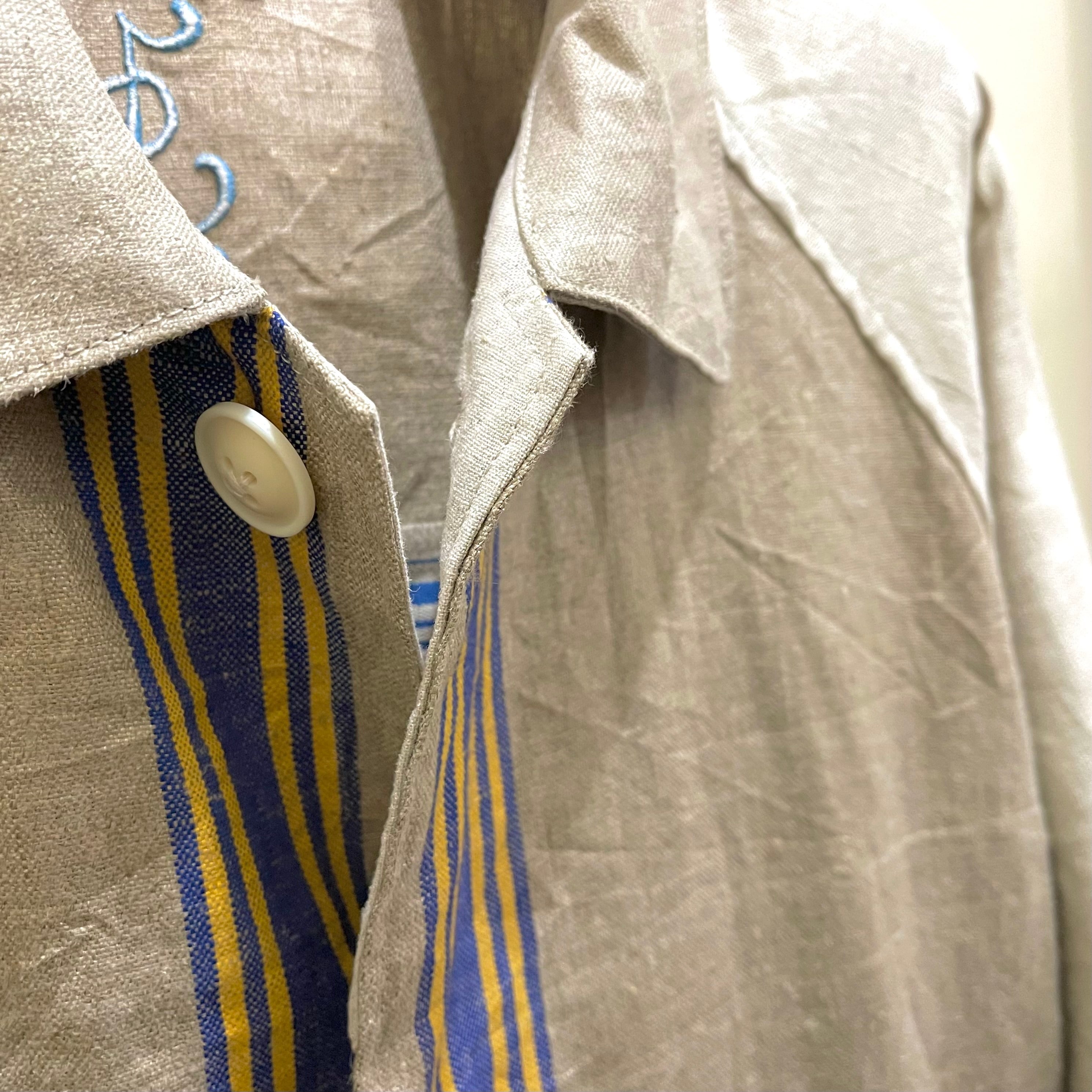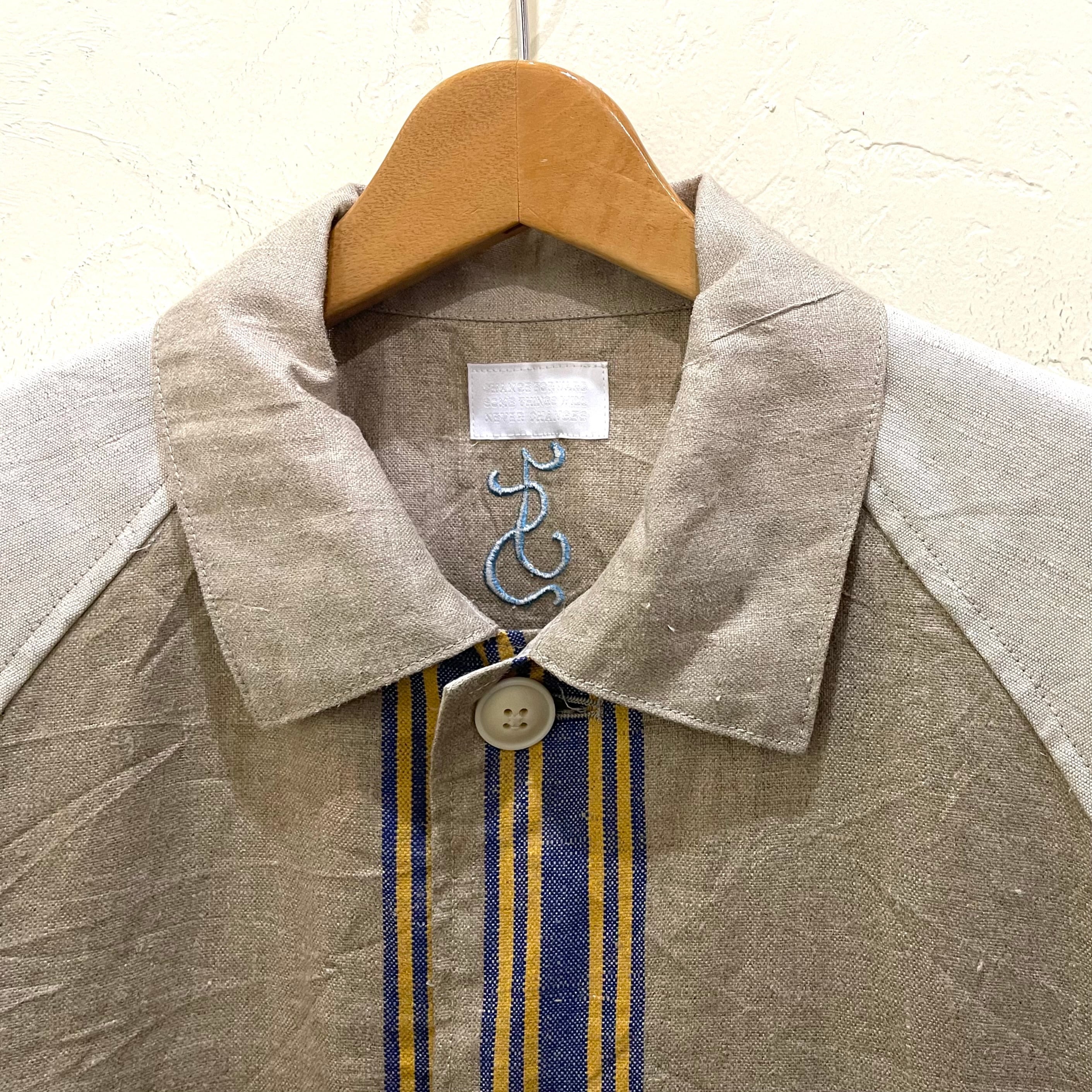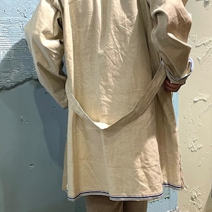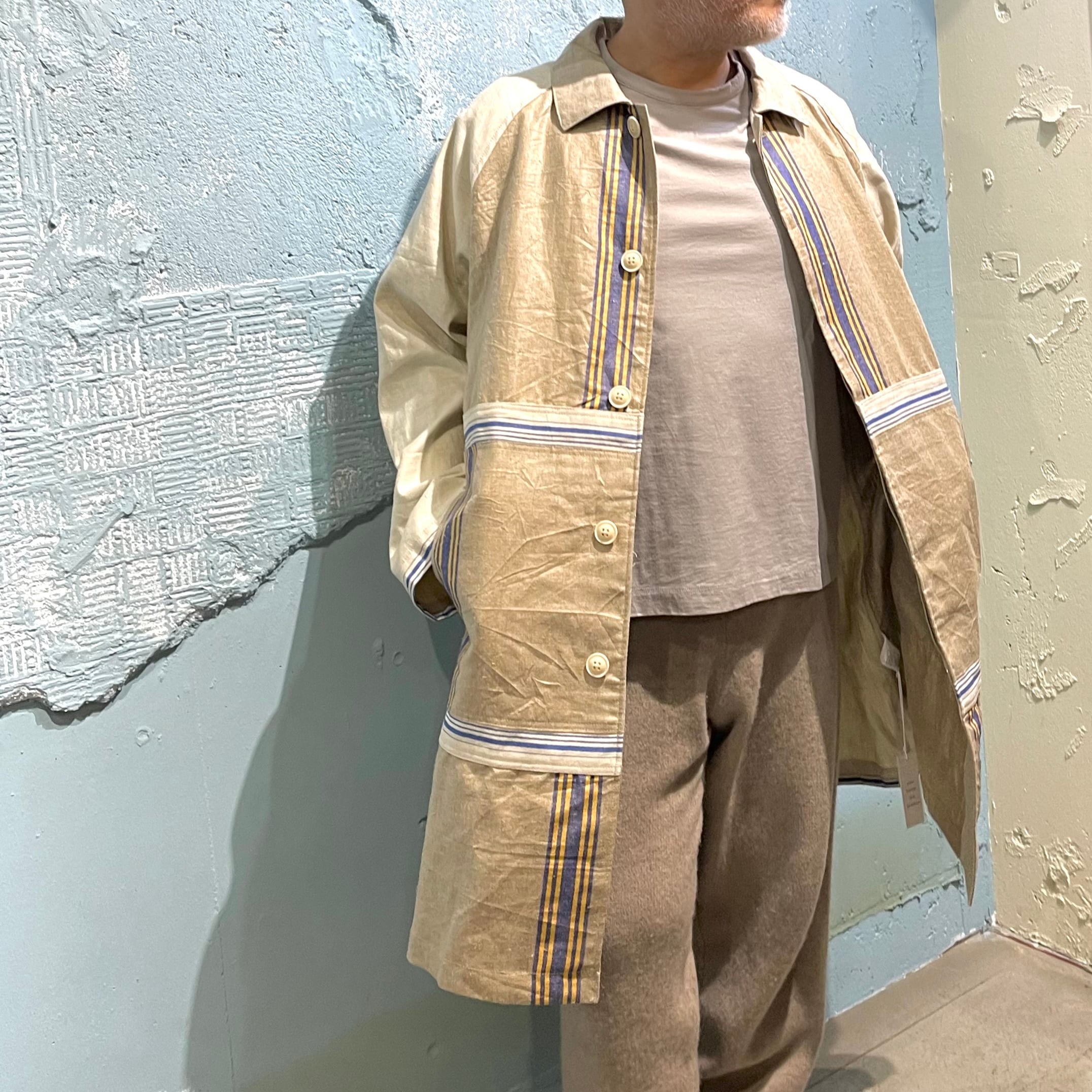 およそ100年前のビンテージの使われていない麻布を素材に仕立てたコートです。 ドイツに多く見られたアイロンをかける時に使われた伝統的なストライプが入ったリネン生地 とても耐久性のある素材感です、デッドストックの生地のため洗いをしっかりかけた上で製品にしております。
