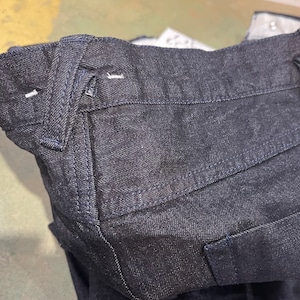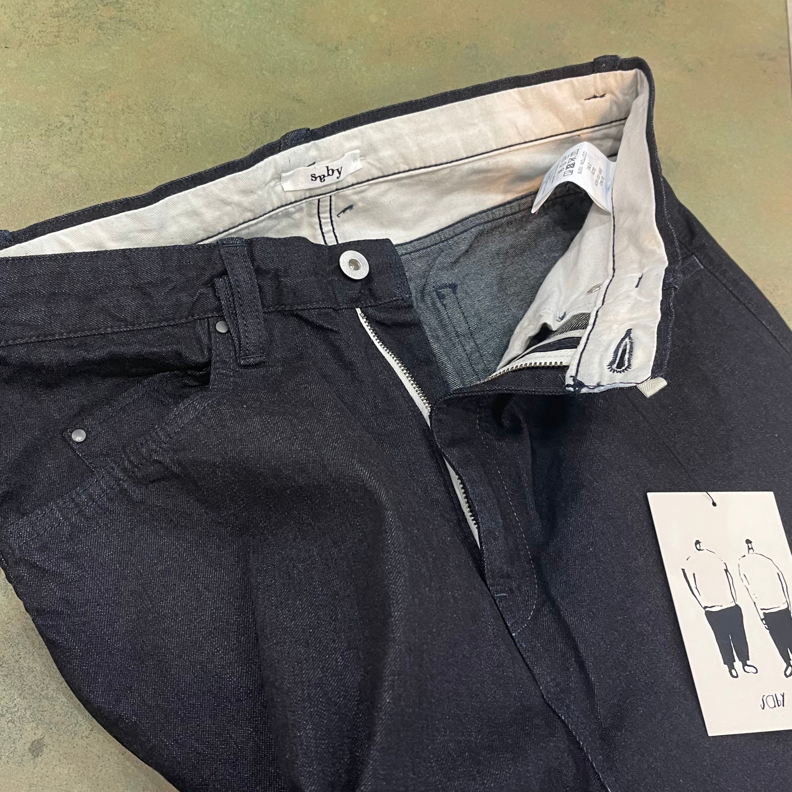 『サバイ』の11oz デニムを素材に作られたバギーパンツです。 通常のデニムよりもライトな印象。 児島で織られたビンテージライクな質感です。 経年変化を楽しめる、アタリのしっかり出やすい素材感に仕上がりました。