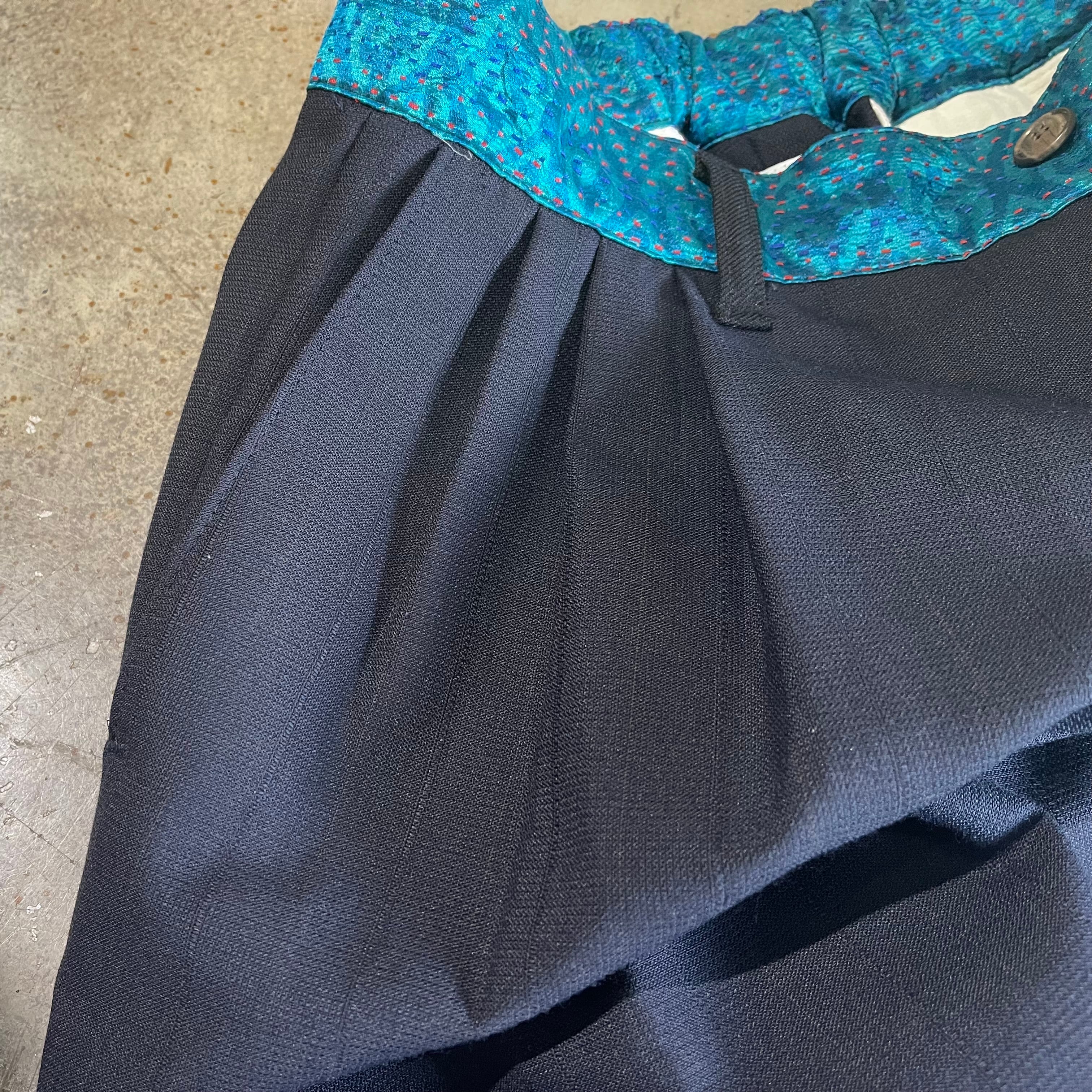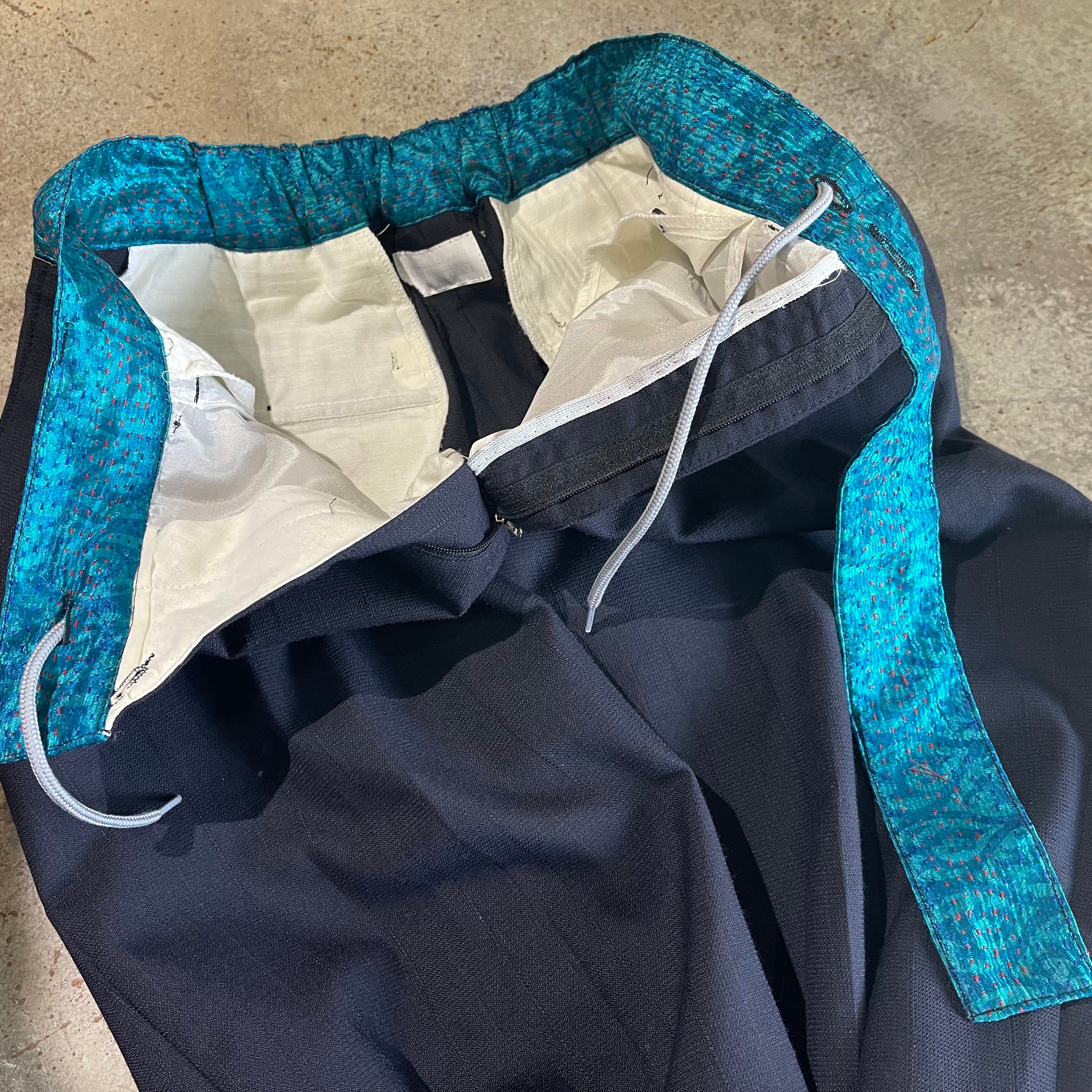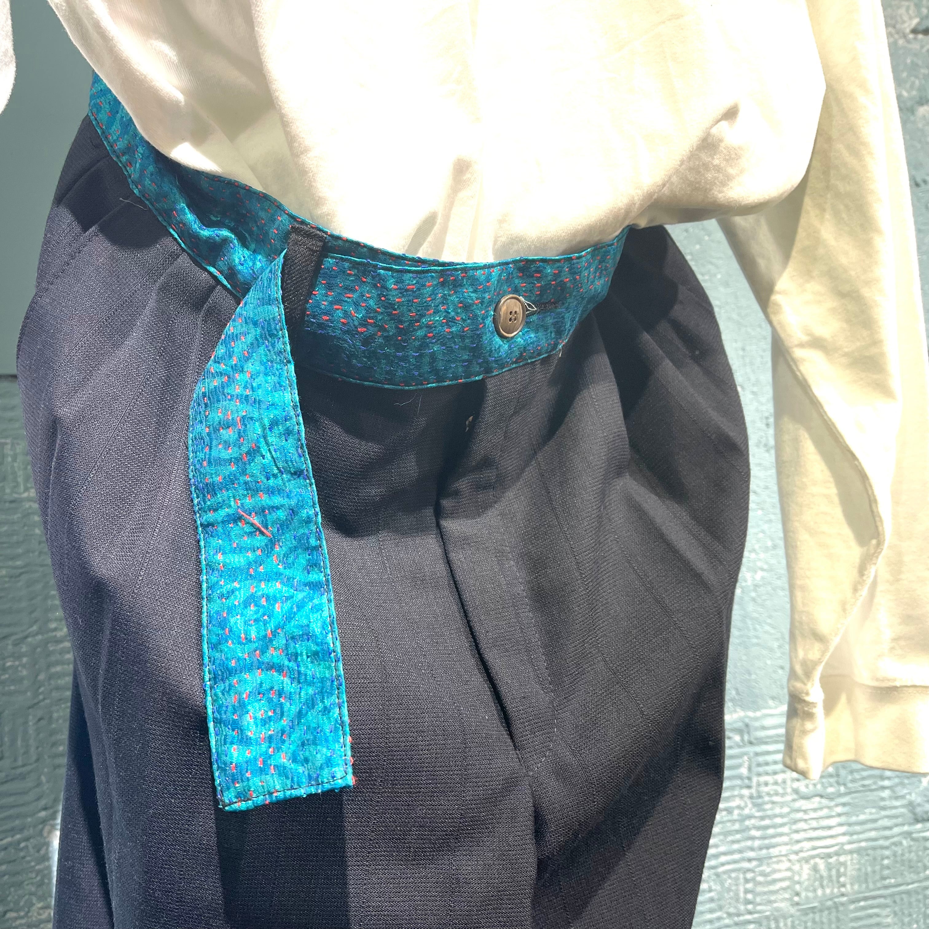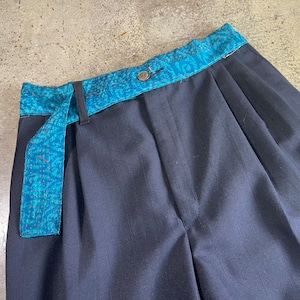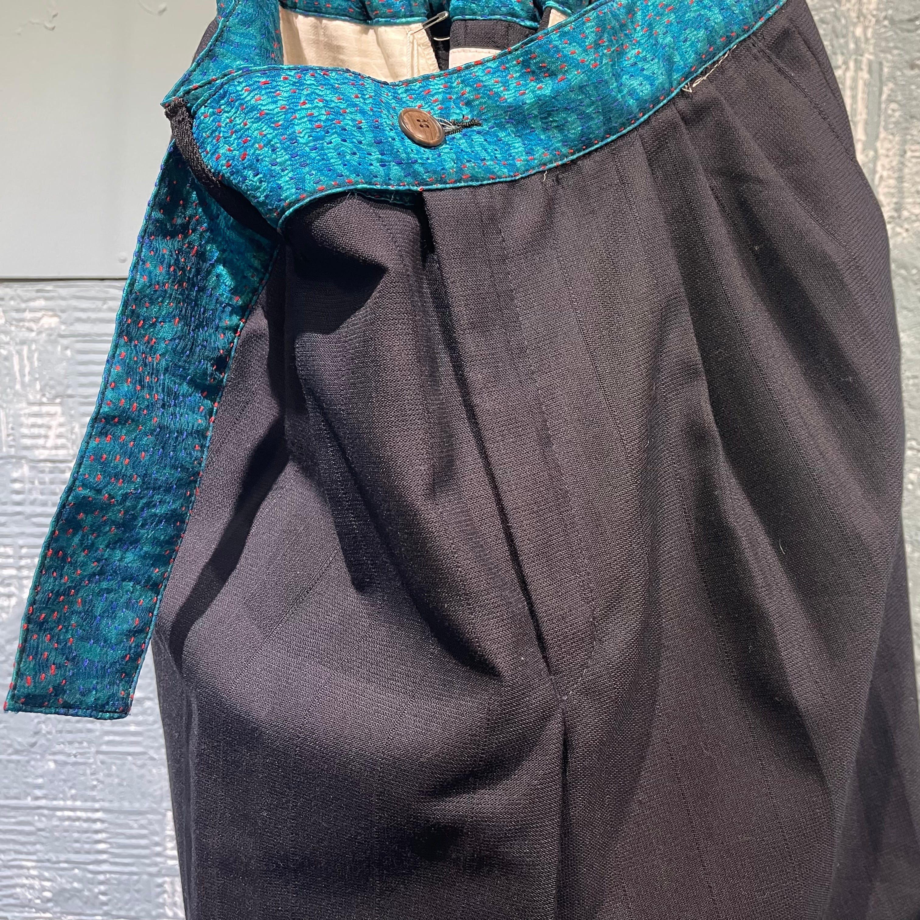 チェンジズのリメイクイージースラックスです。 古来から伝わる刺し子のビンテージ生地をウエスト部分に使用したコントラストを効かせた一本。 ウエストは後ろ側のみ入れていてフロントはすっきりと腰巻きのように見えるようにしています。 ベルトループも1箇所のみ。