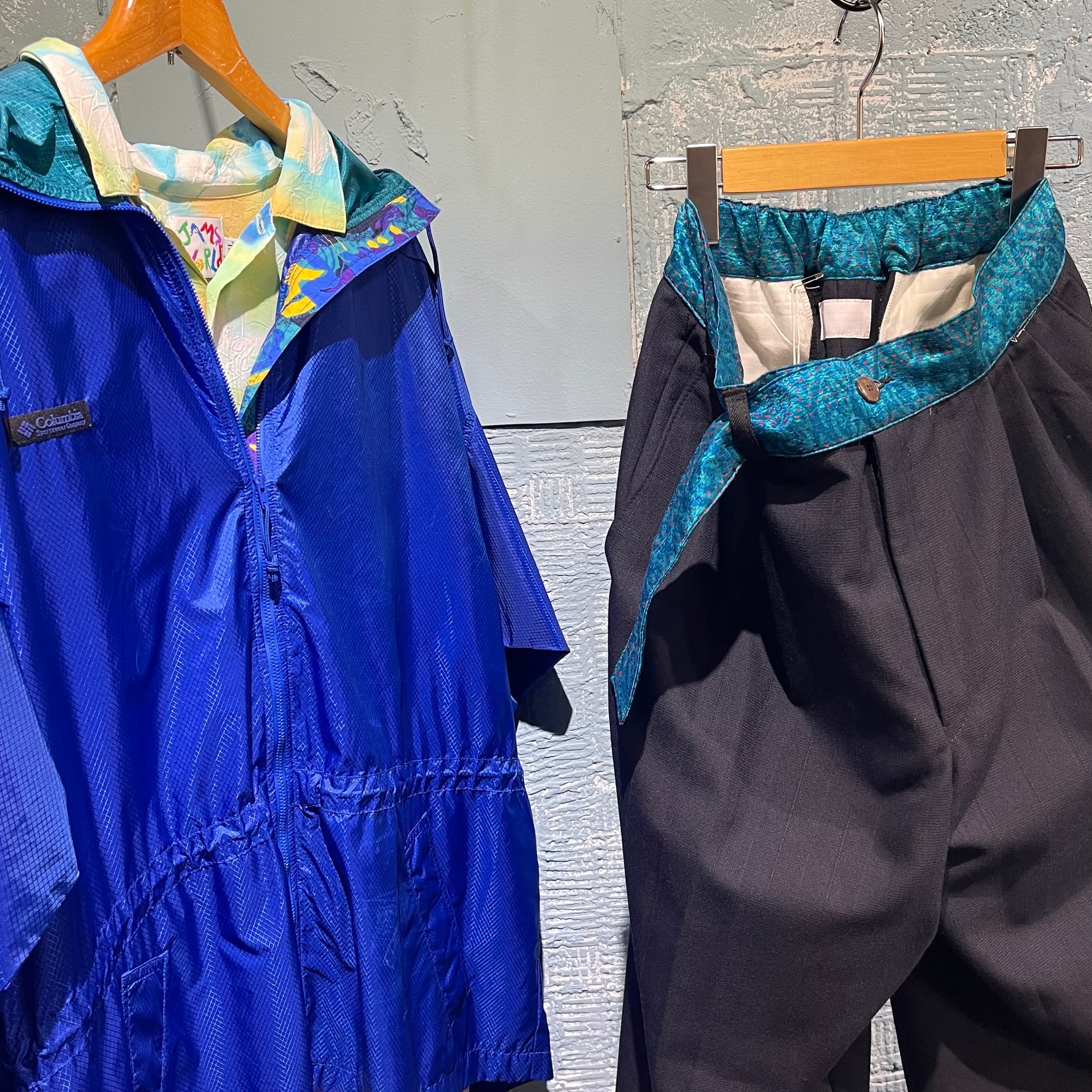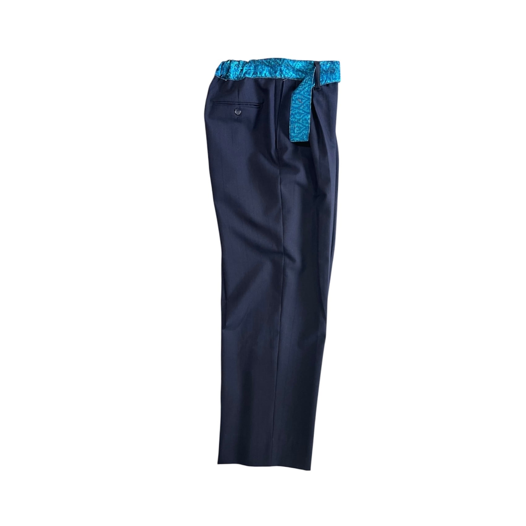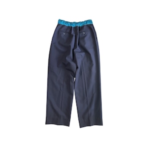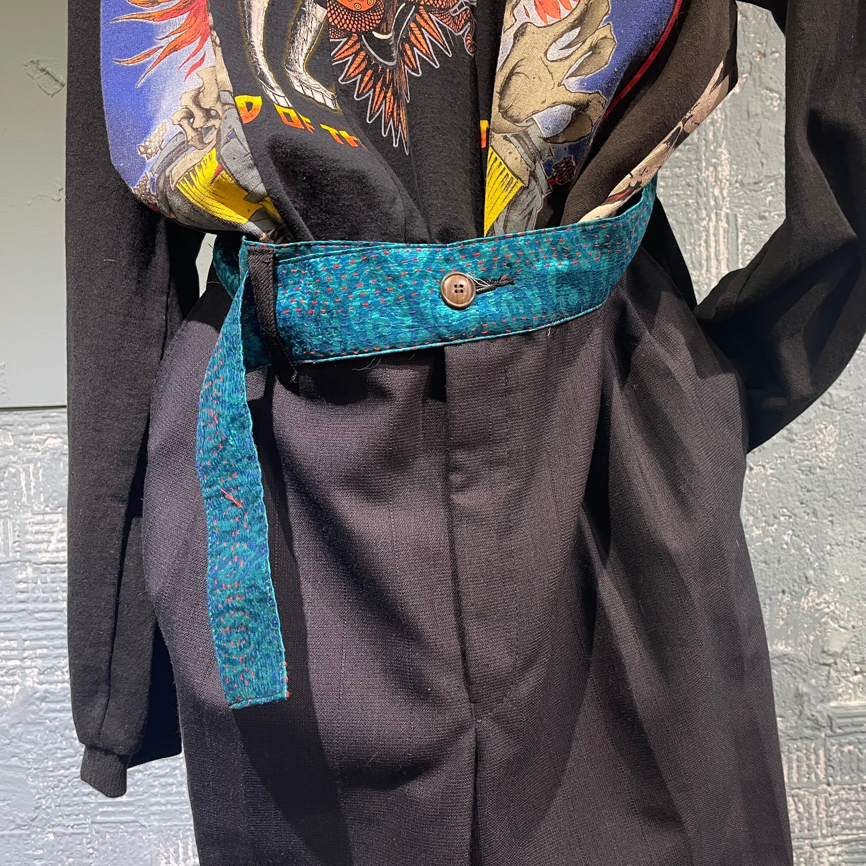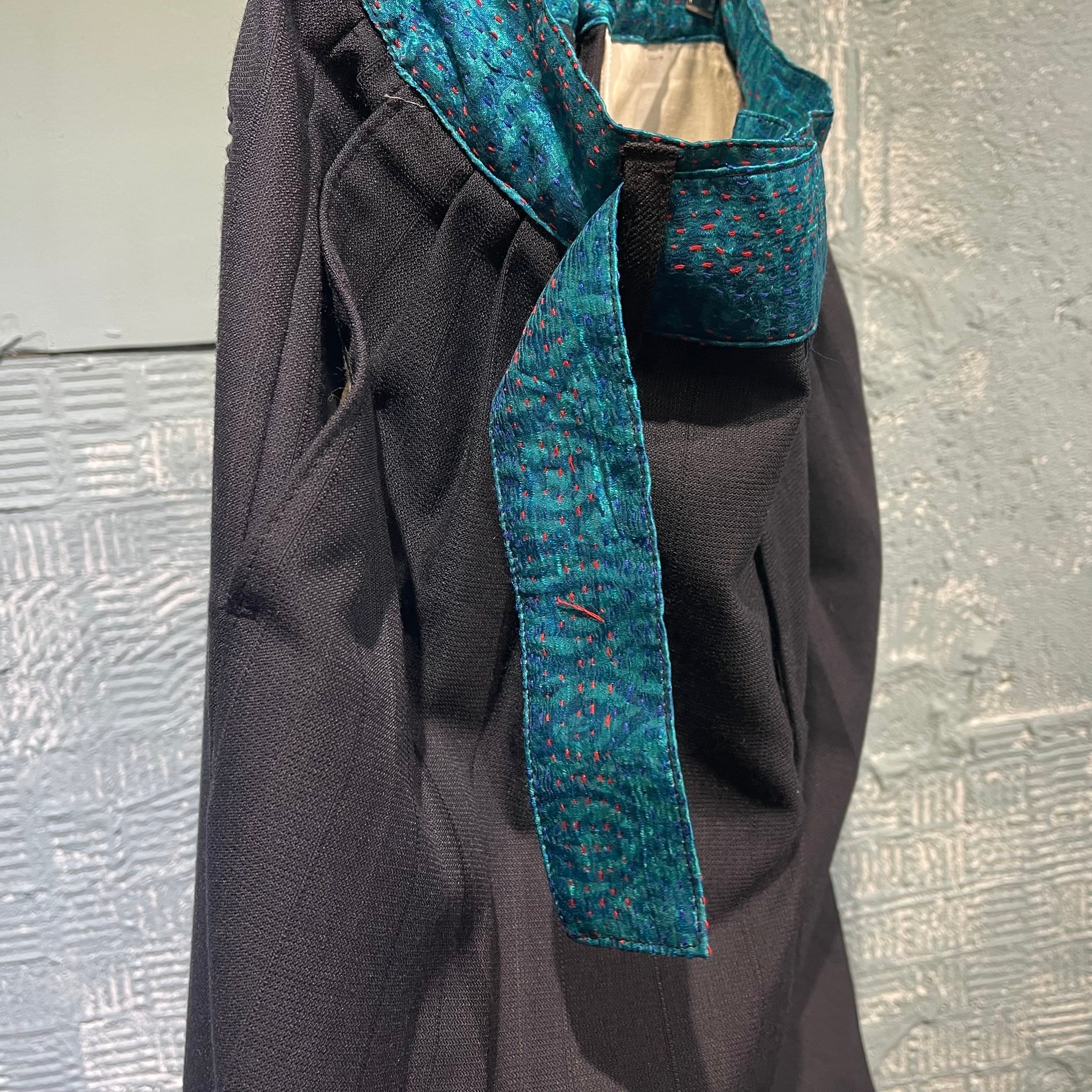 チェンジズのリメイクイージースラックスです。 古来から伝わる刺し子のビンテージ生地をウエスト部分に使用したコントラストを効かせた一本。 ウエストは後ろ側のみ入れていてフロントはすっきりと腰巻きのように見えるようにしています。 ベルトループも1箇所のみ。
