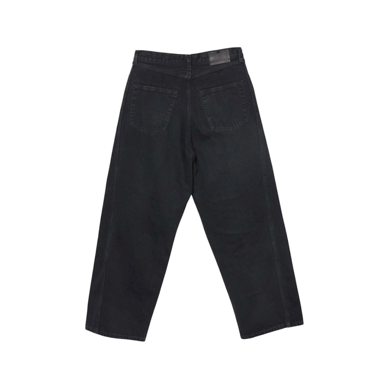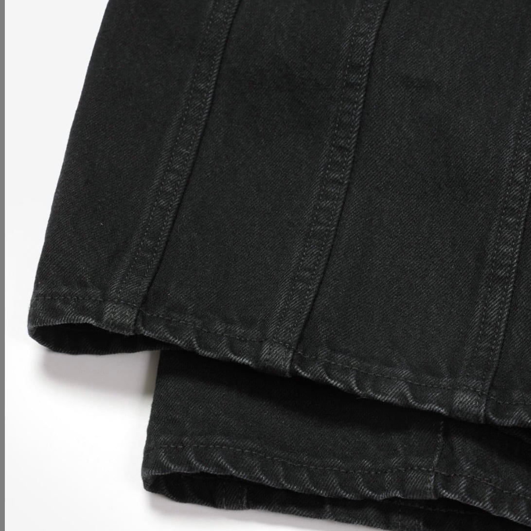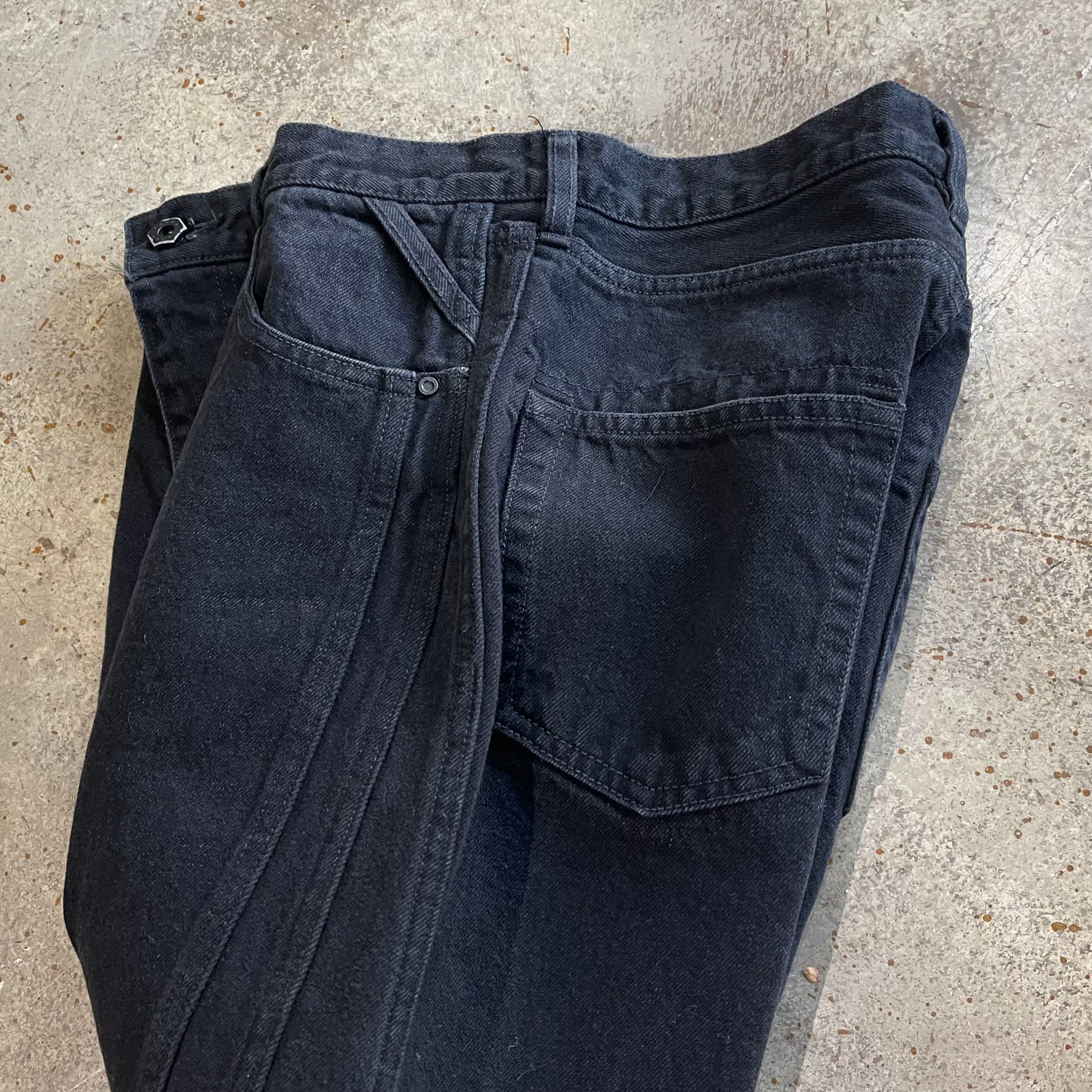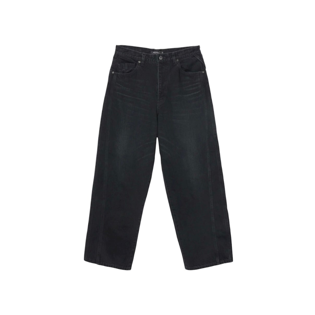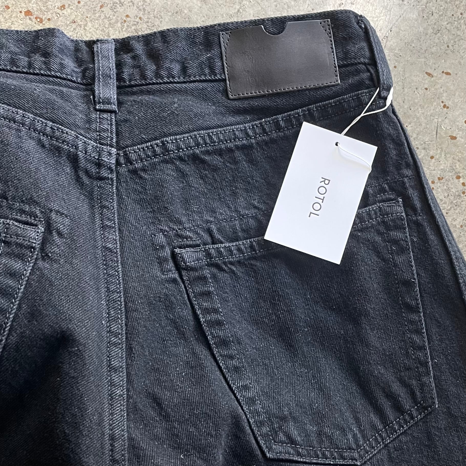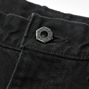 ワタリから裾まで軽くテイパードの入った太めのワイドシルエットなロトルのブラックデニムパンツ ナットの形状をしたボタンなどもオリジナルで制作しています。そしてそのボタンをよく見るとエイジング加工も施されていたり、縦横糸はどちらもブラックなので奥行きのある黒という感じです。