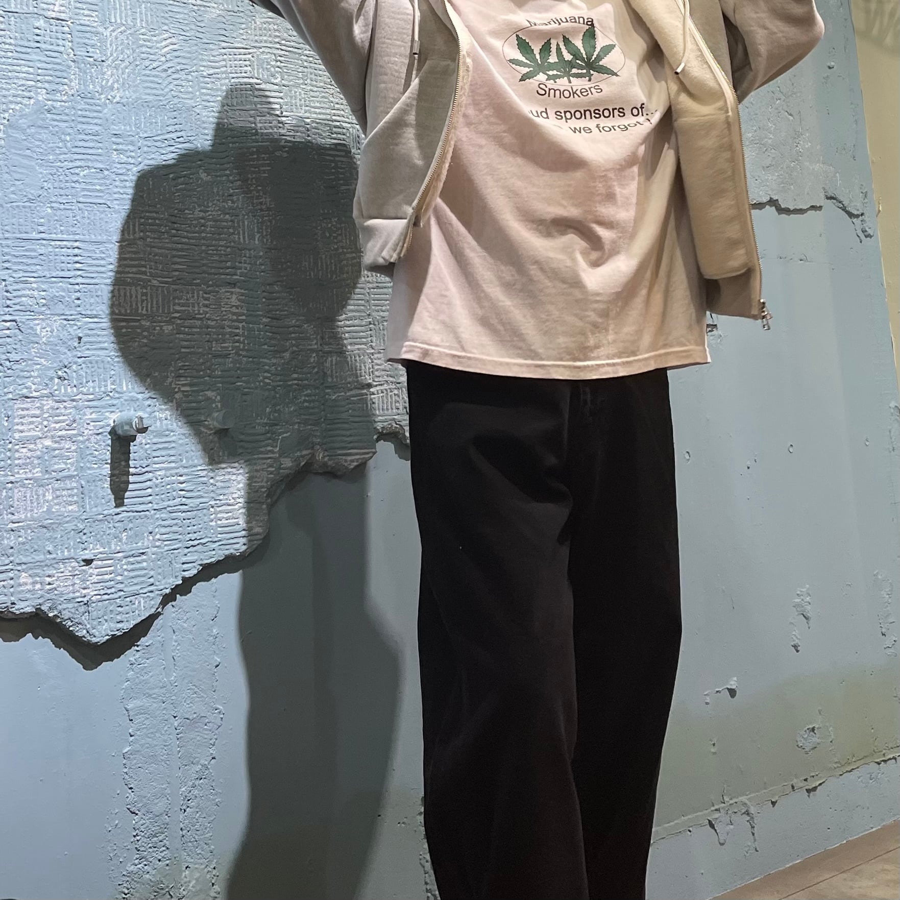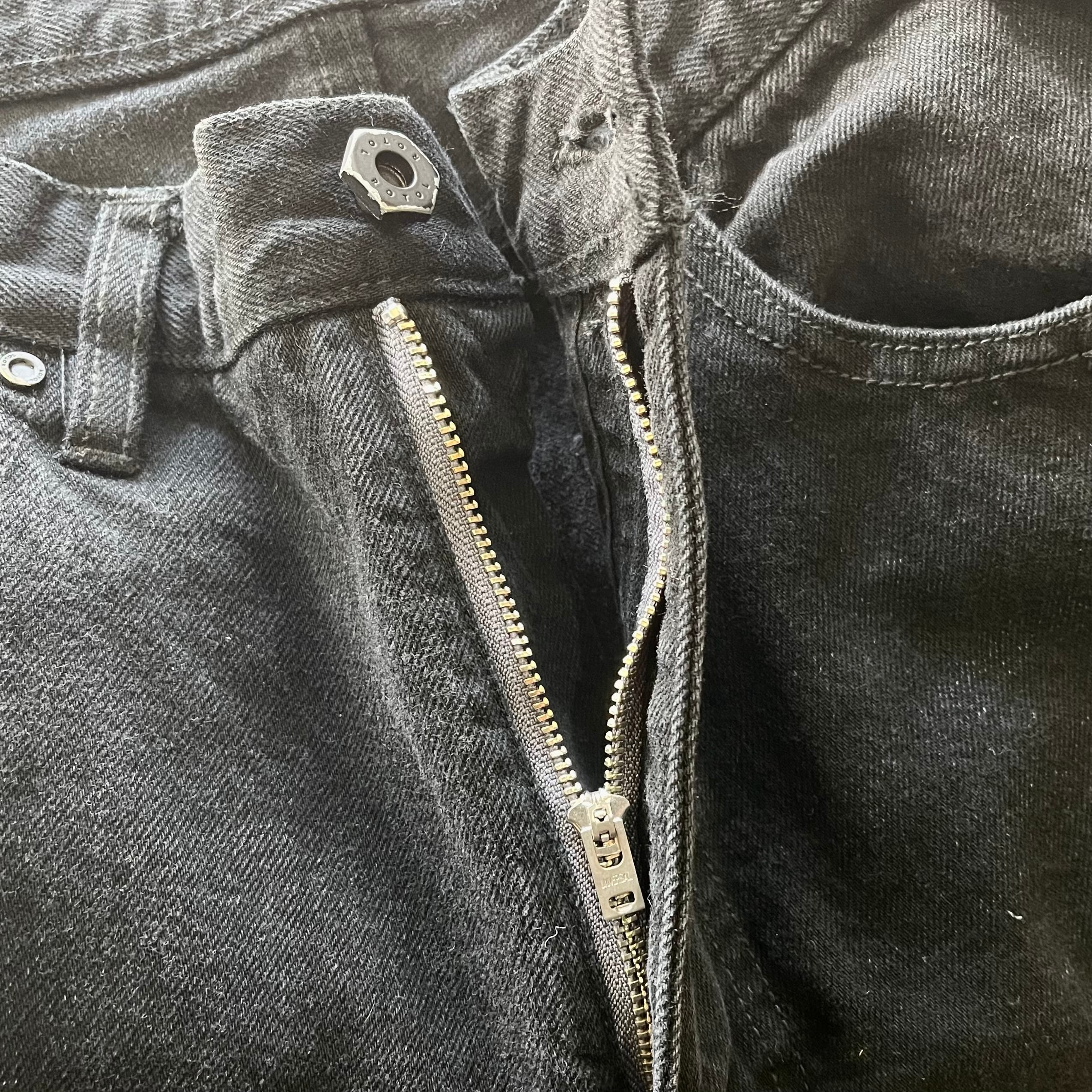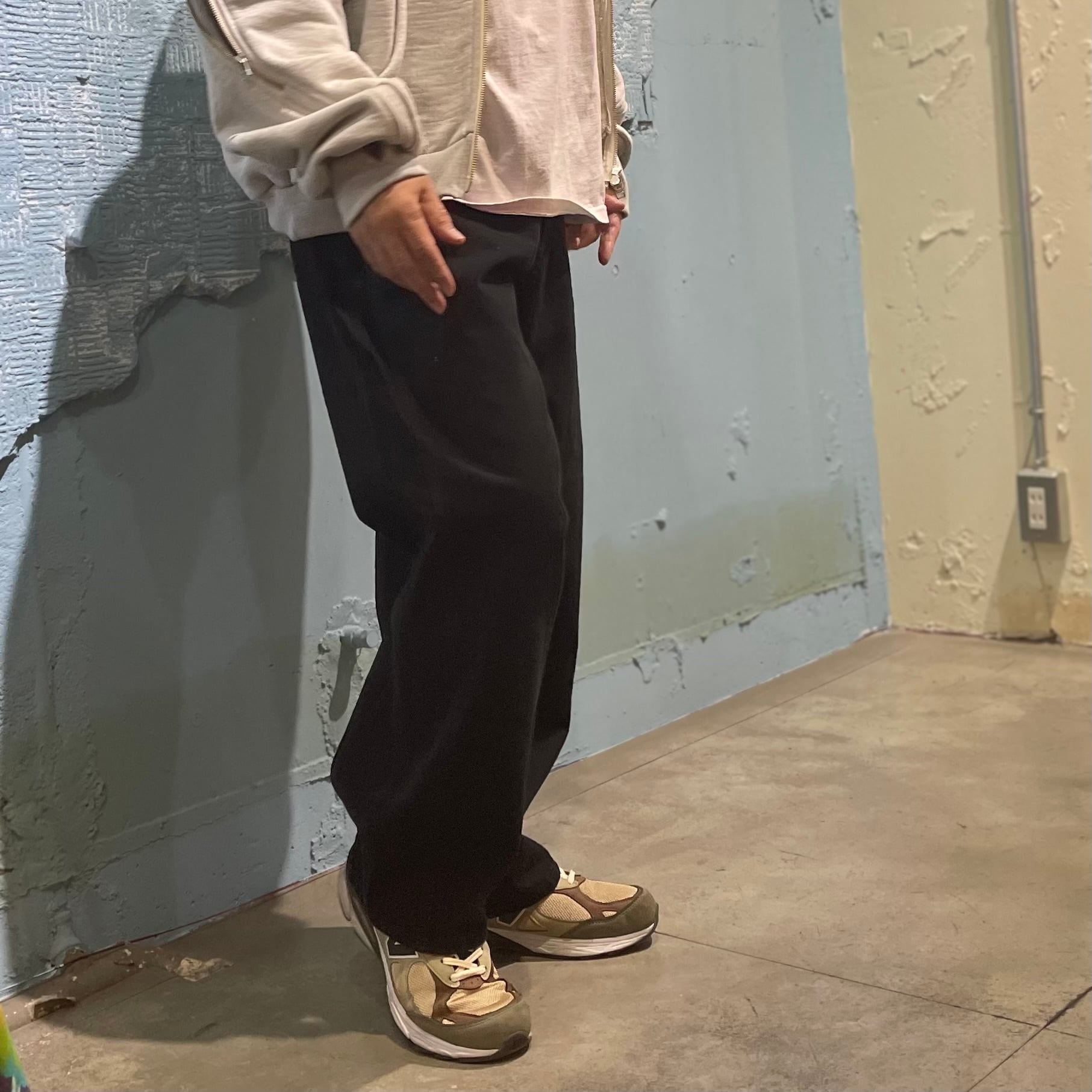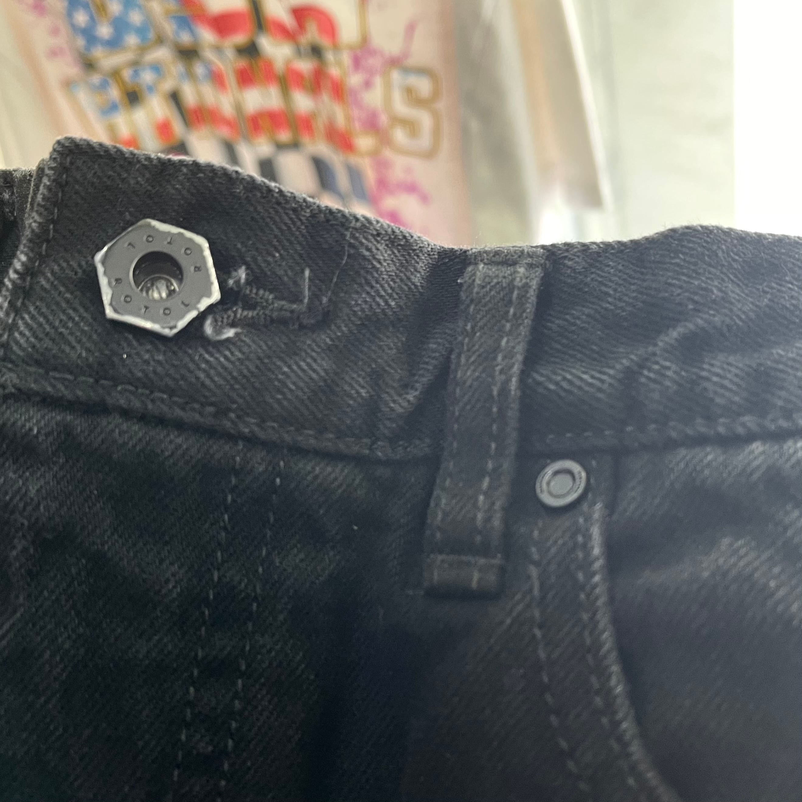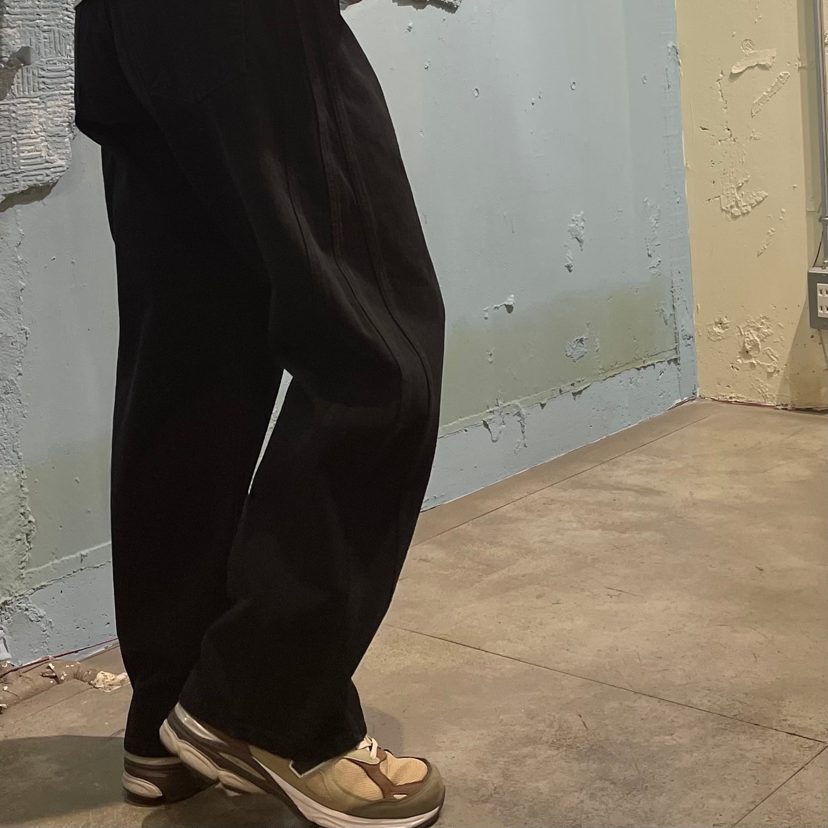 ワタリから裾まで軽くテイパードの入った太めのワイドシルエットなロトルのブラックデニムパンツ ナットの形状をしたボタンなどもオリジナルで制作しています。そしてそのボタンをよく見るとエイジング加工も施されていたり、縦横糸はどちらもブラックなので奥行きのある黒という感じです。