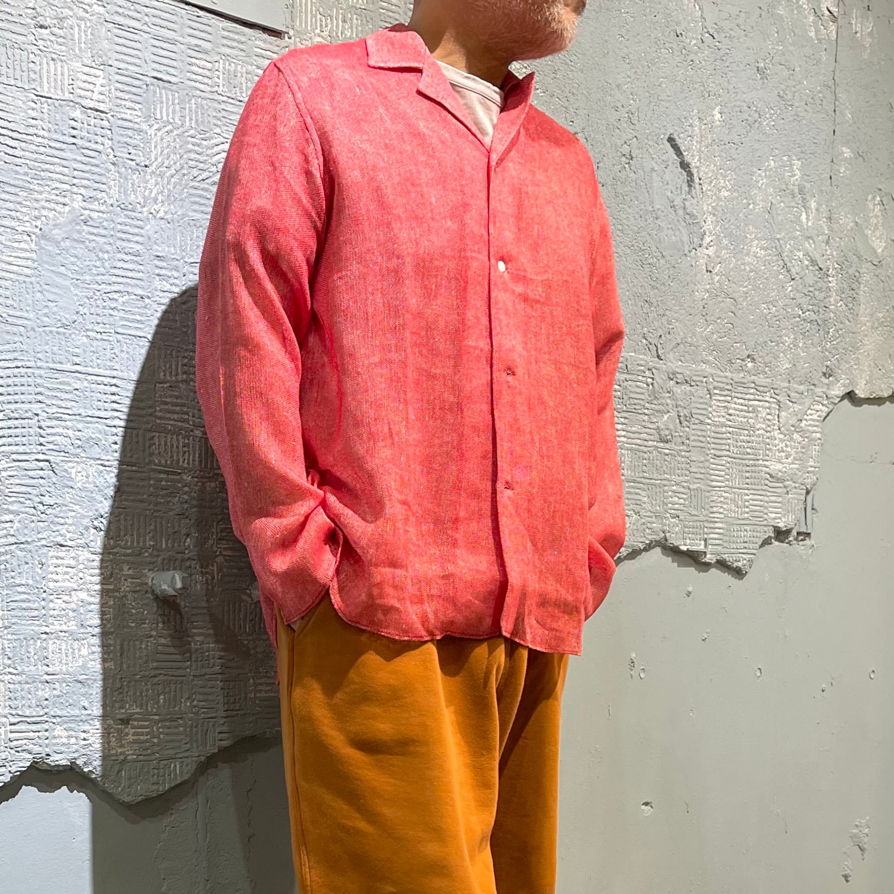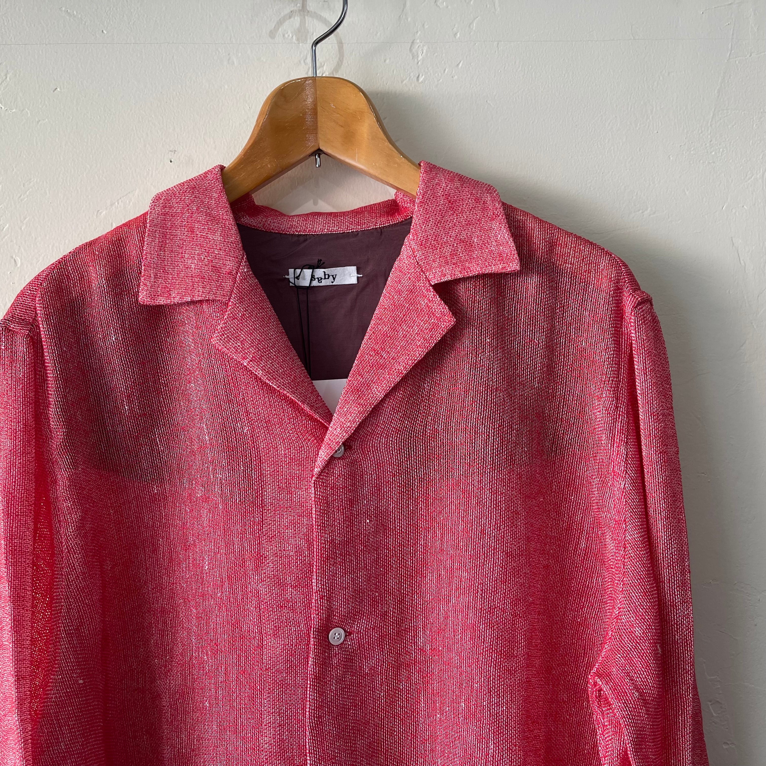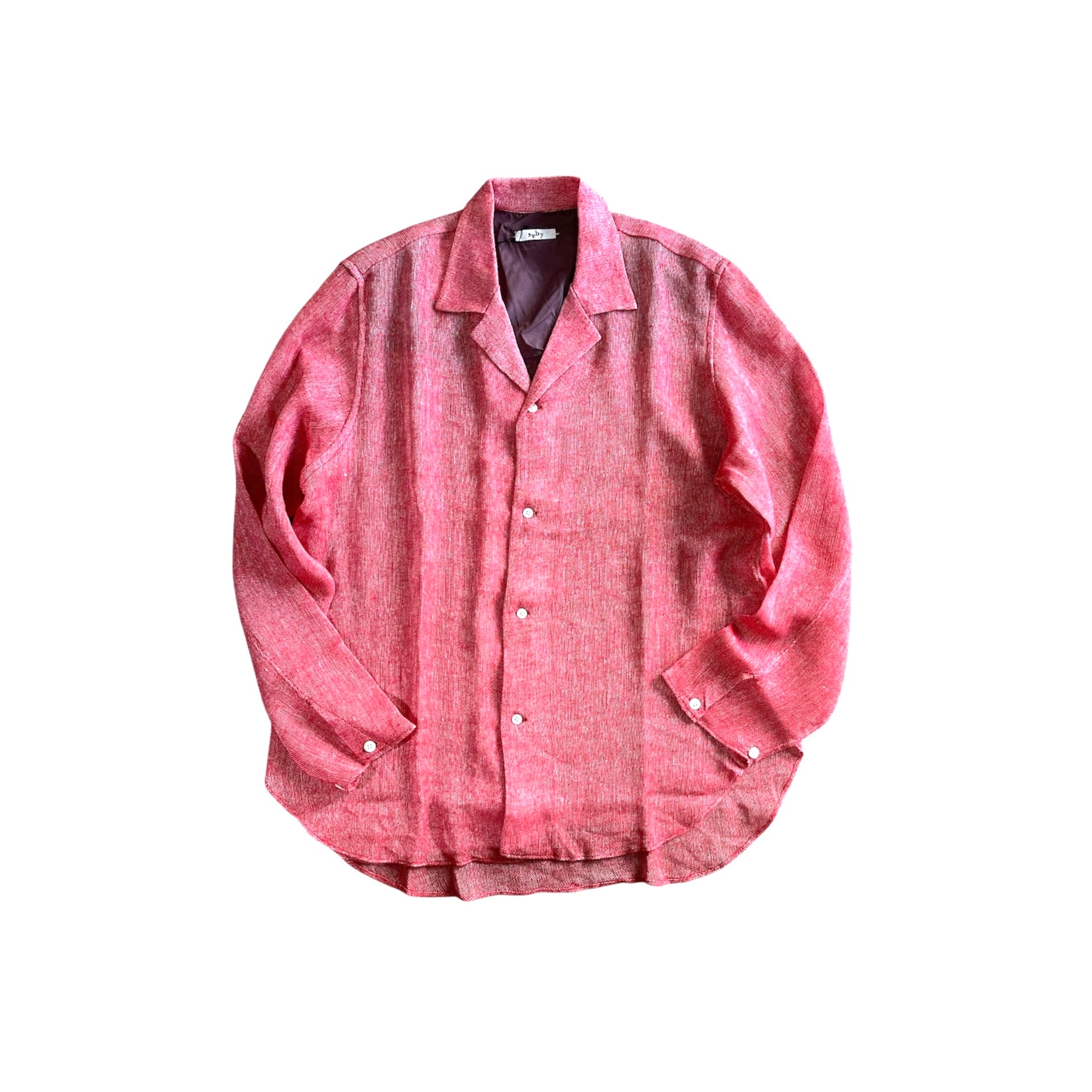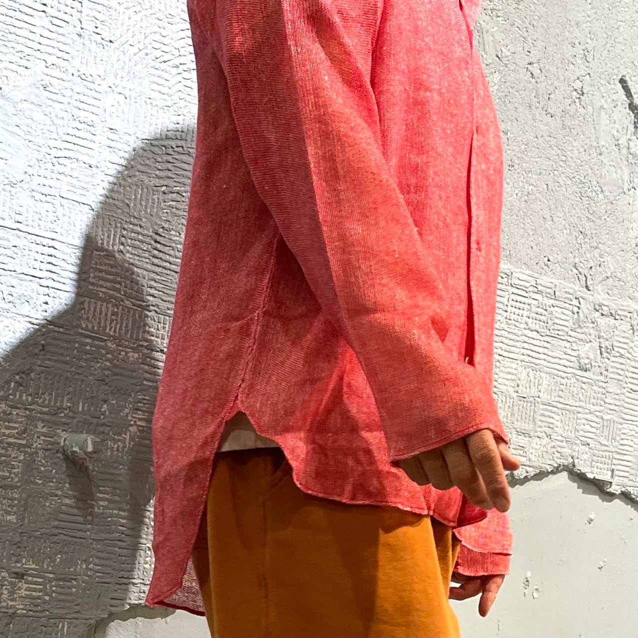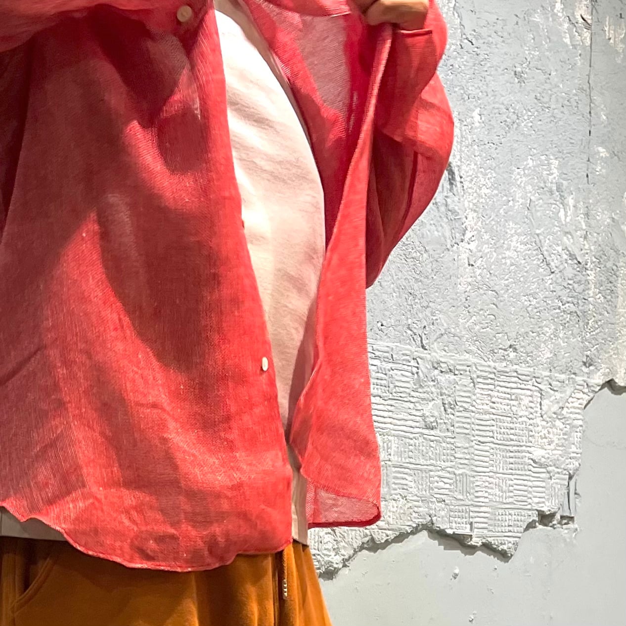 『サバイ』の尾州で織られたリネンのからみ織りで作られた開襟襟シャツです。 通気性の良い透け感のある素材感がとても涼やか、 少し硬めなガーゼのような素材感です。