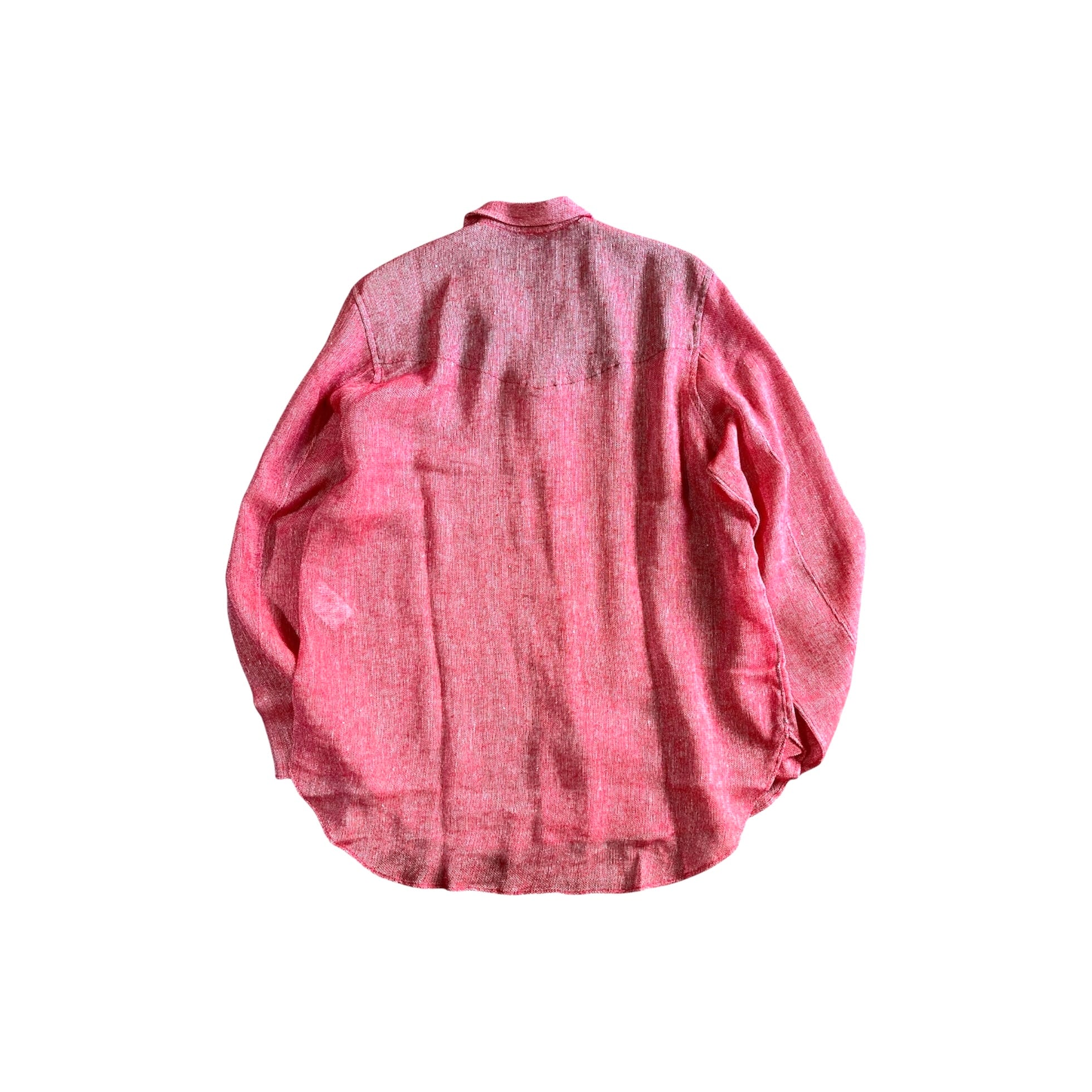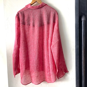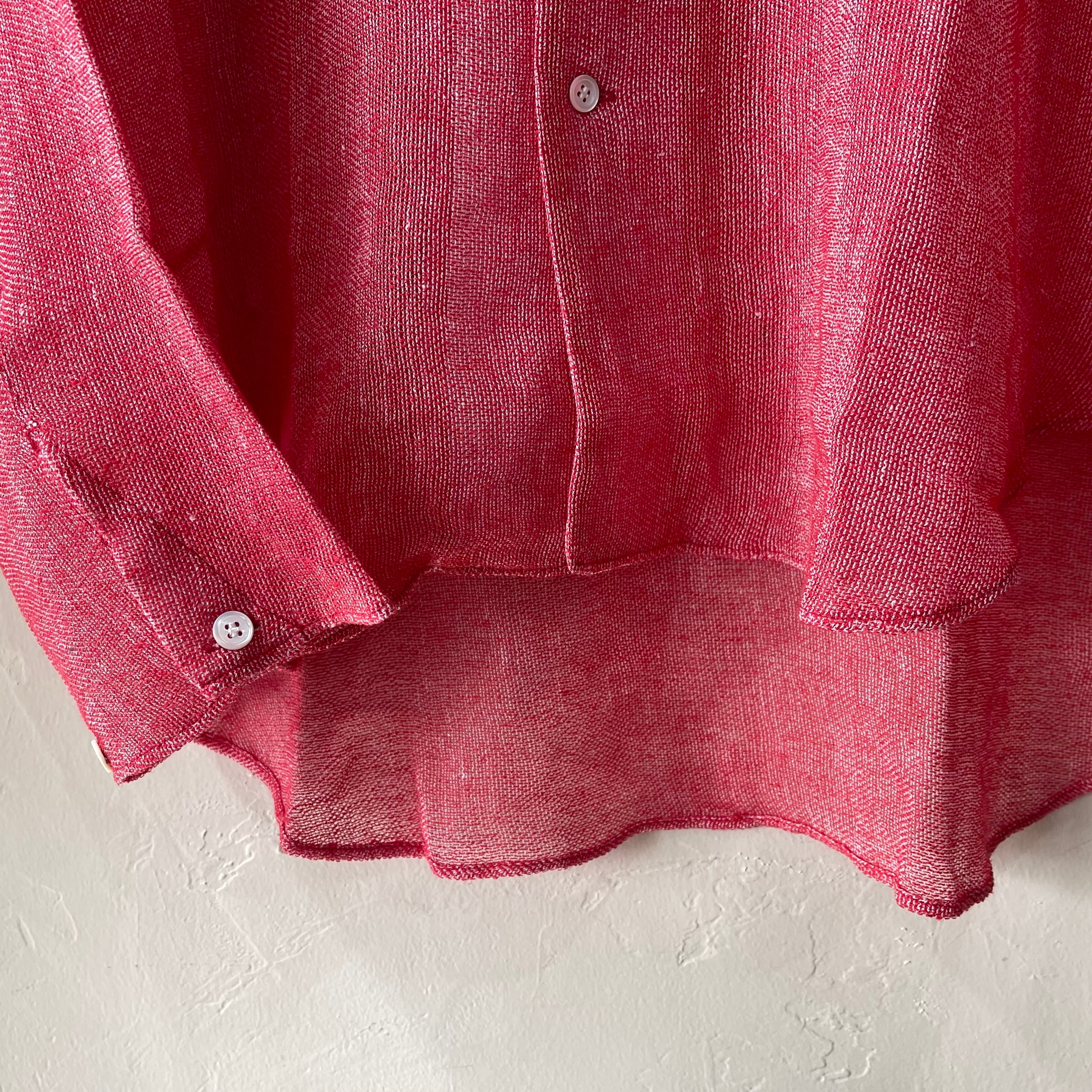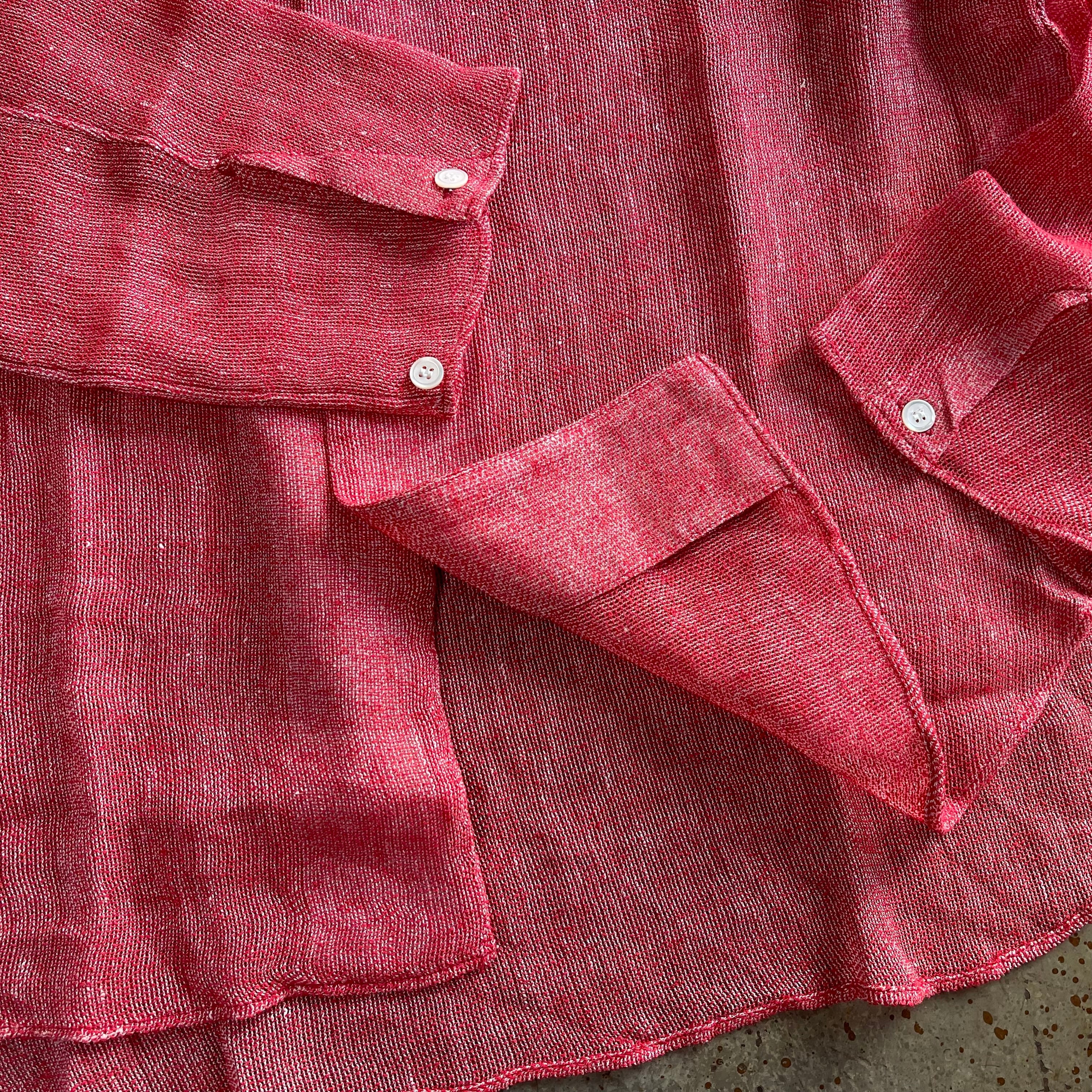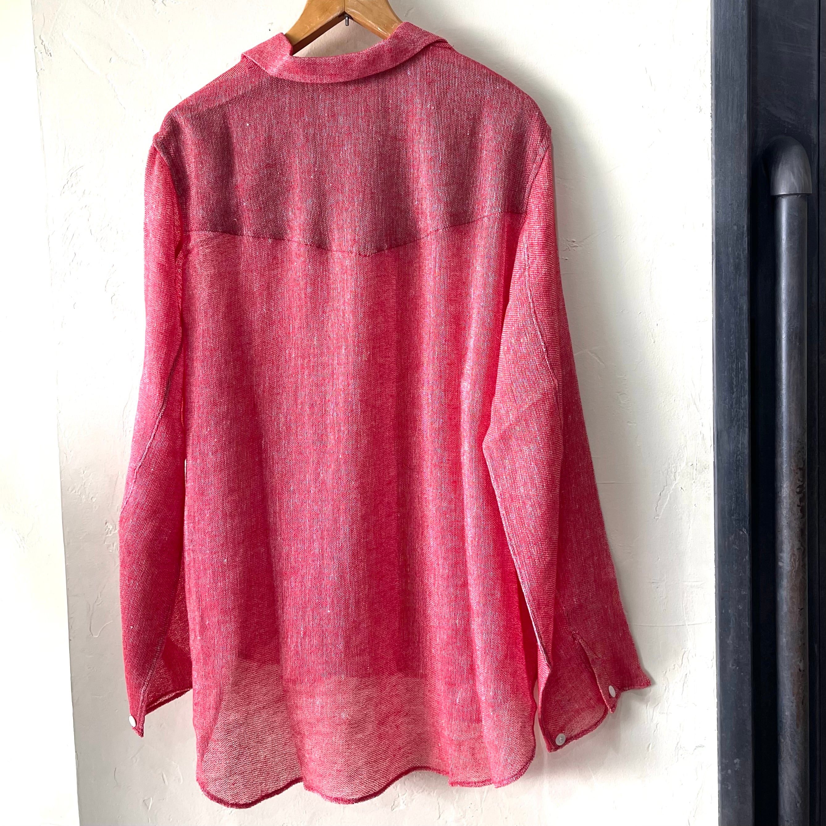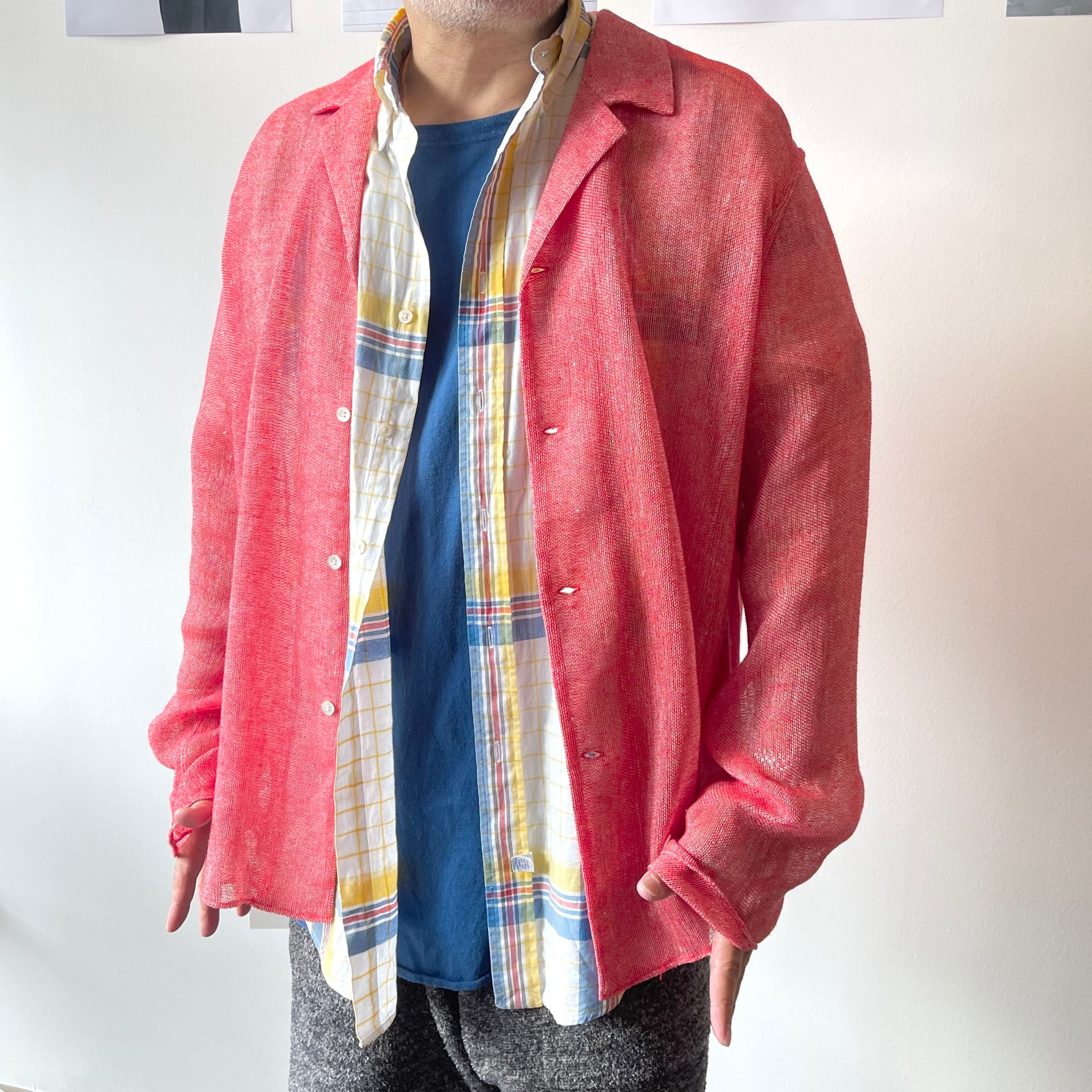 『サバイ』の尾州で織られたリネンのからみ織りで作られた開襟襟シャツです。 通気性の良い透け感のある素材感がとても涼やか、 少し硬めなガーゼのような素材感です。