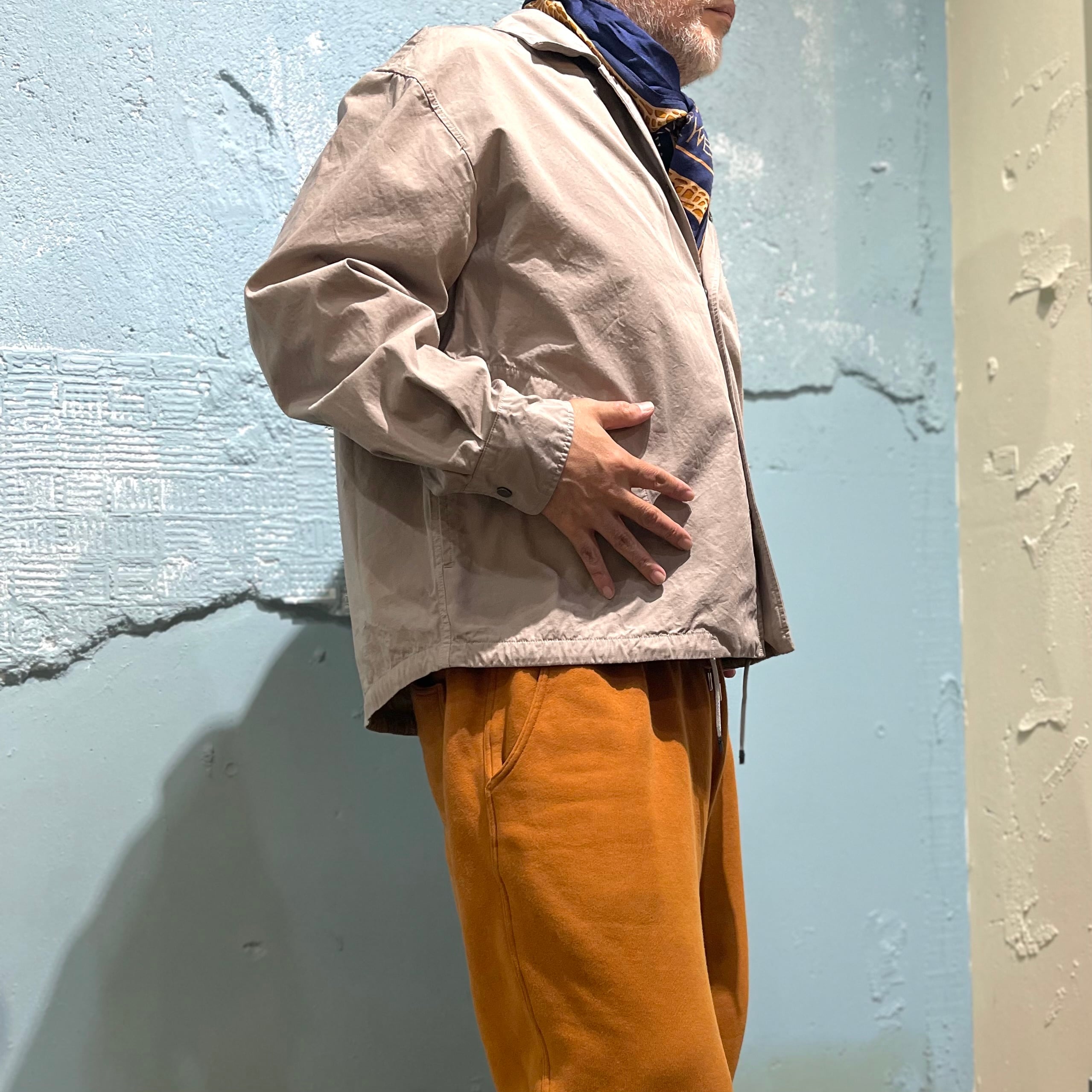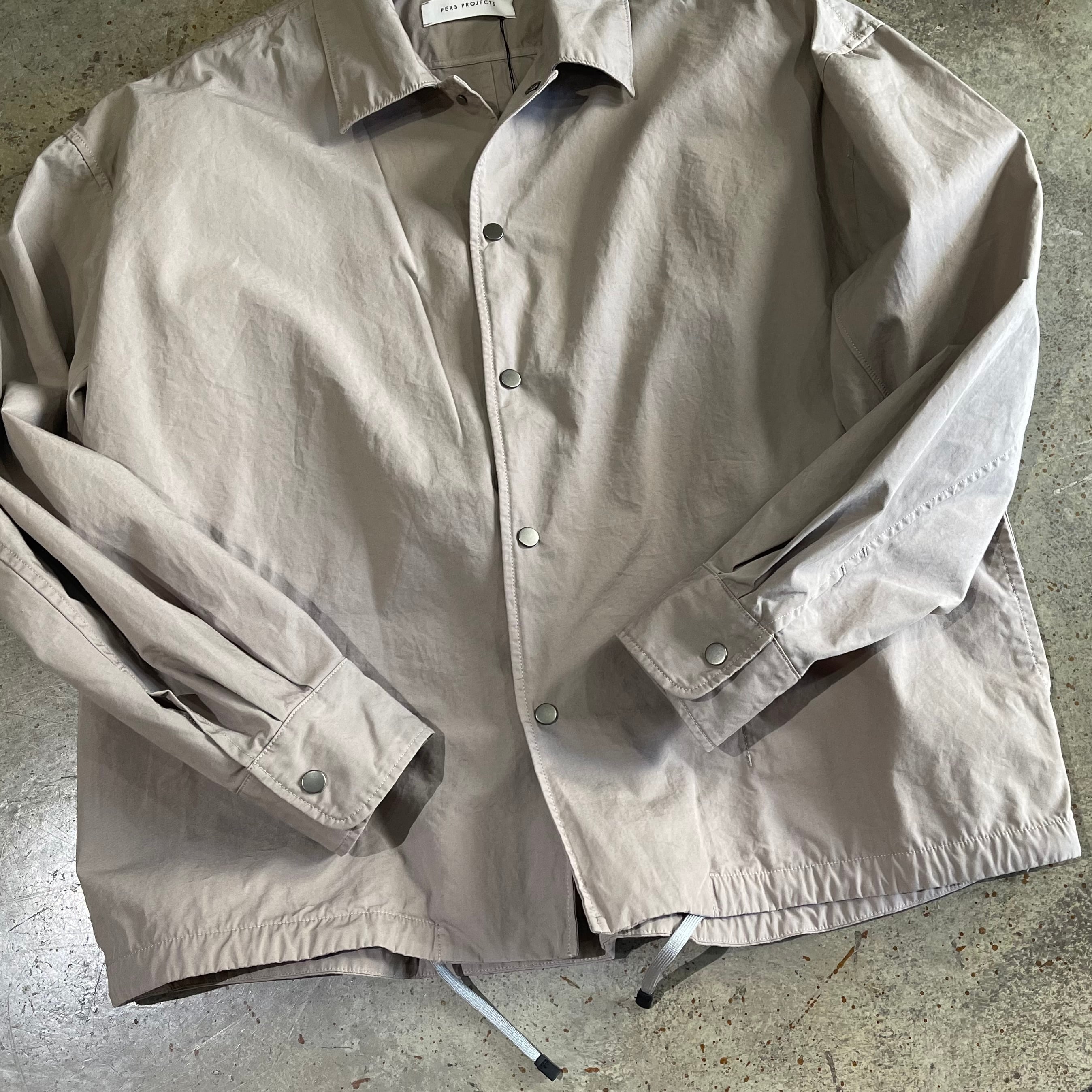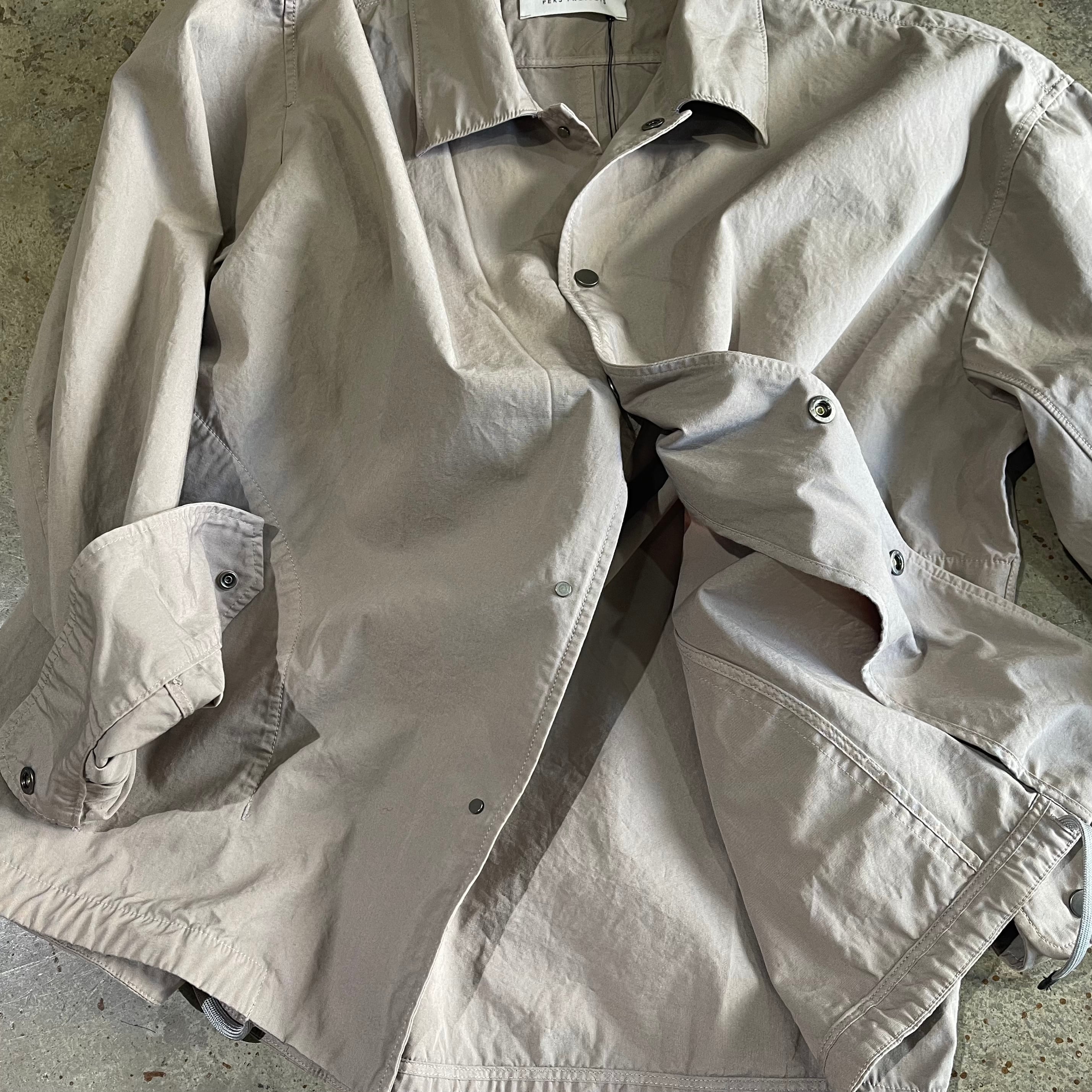 短丈で仕上げた「パースプロジェクツ」のコーチジャケットです。 ガーメントダイによる小慣れた色落ち感、 細番手の糸を高密度で織り上げた薄手ながらハリのある素材感です。
