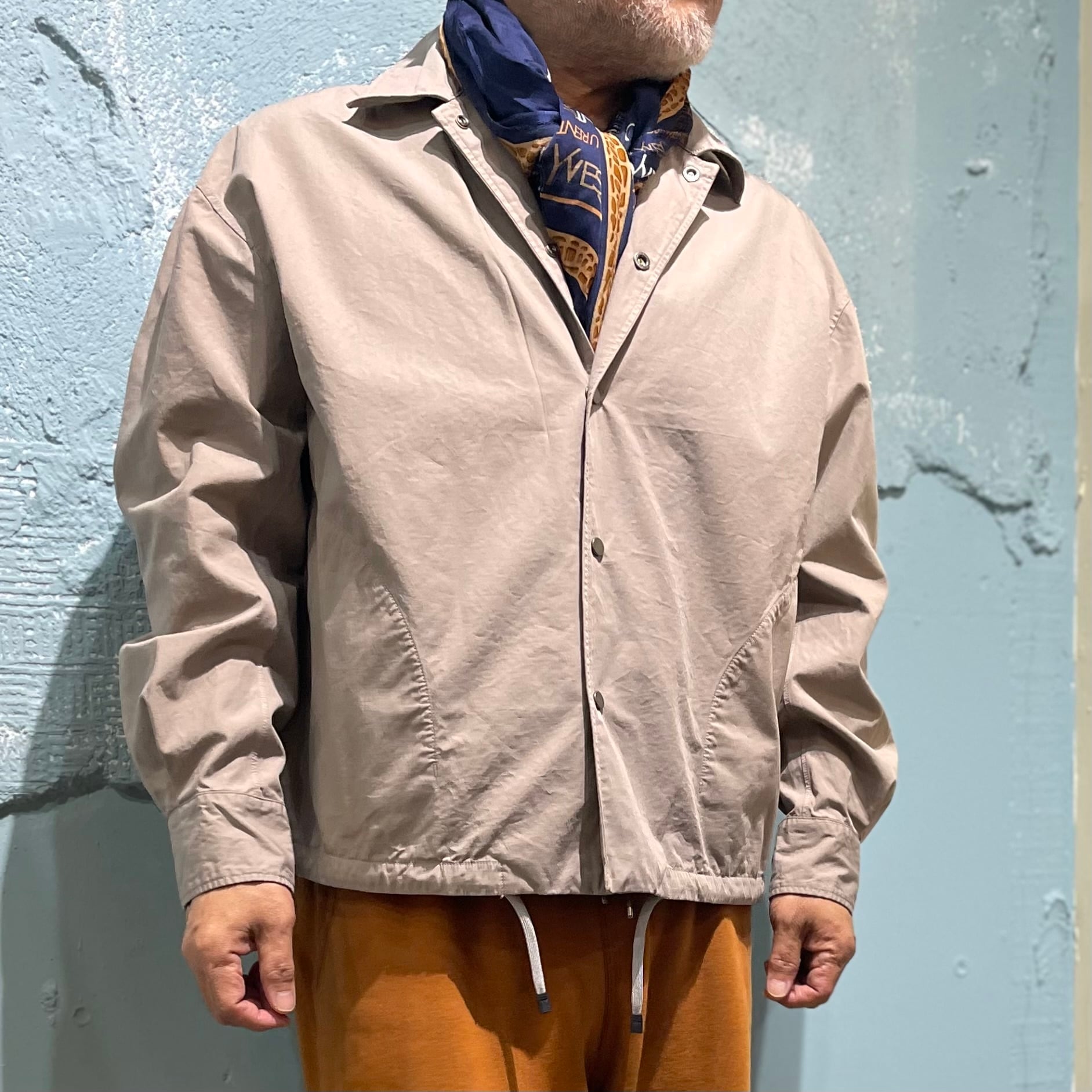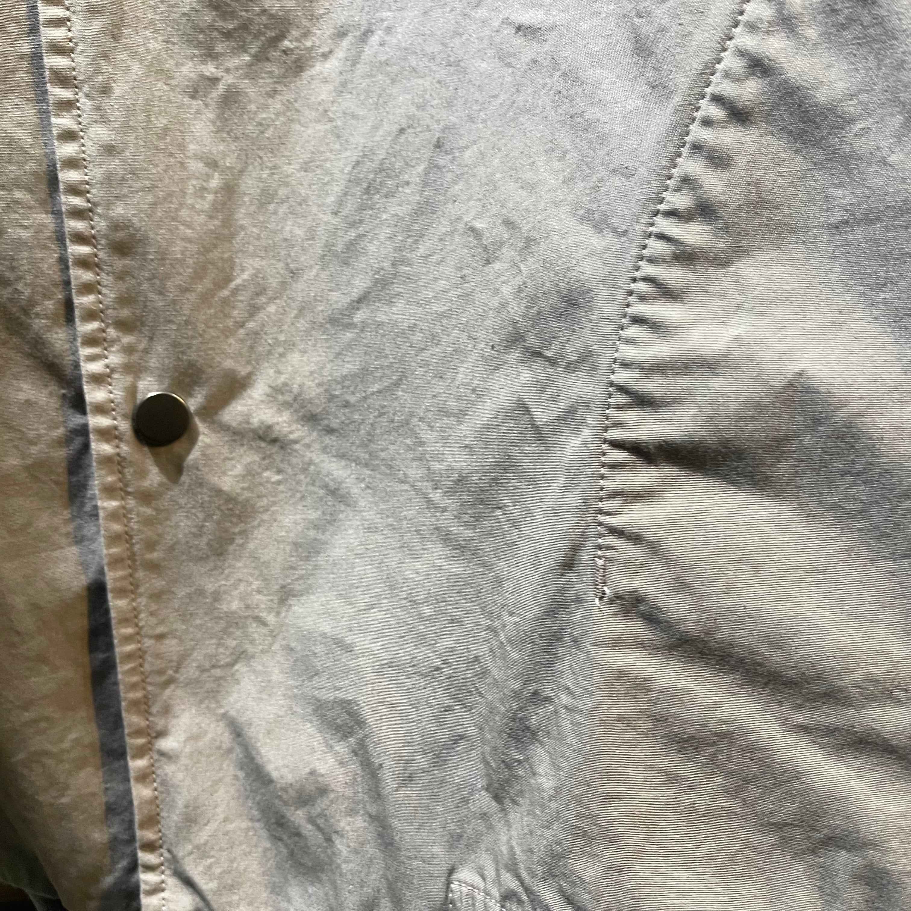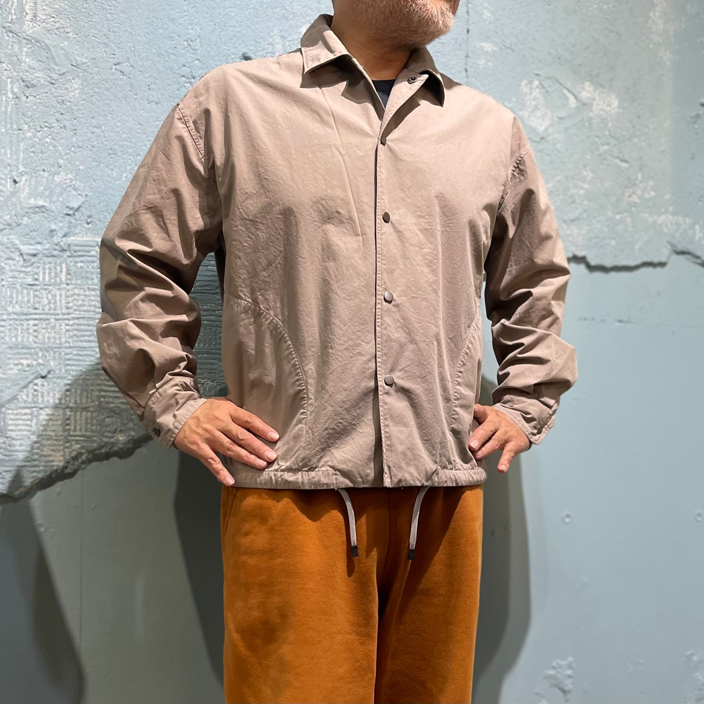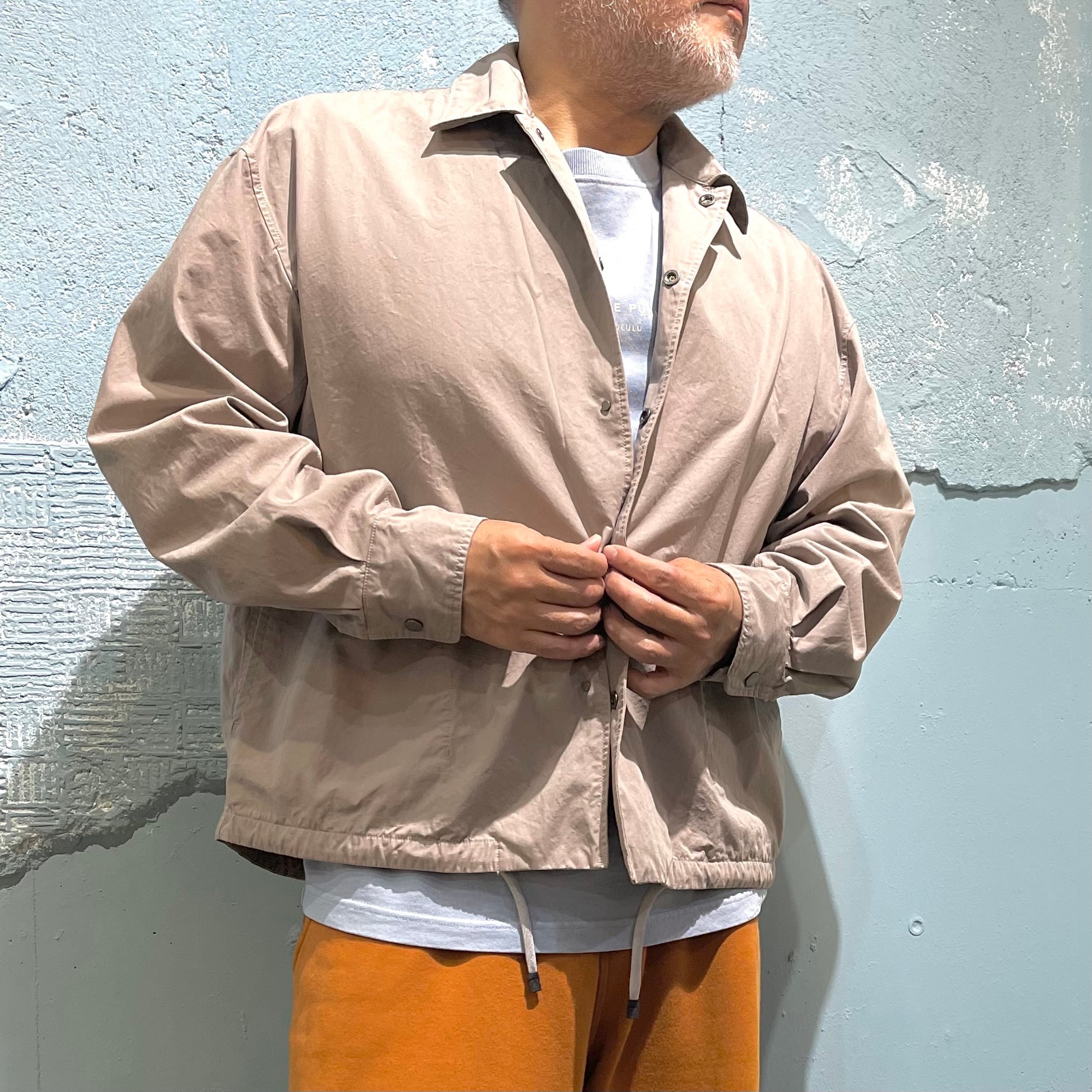 短丈で仕上げた「パースプロジェクツ」のコーチジャケットです。 ガーメントダイによる小慣れた色落ち感、 細番手の糸を高密度で織り上げた薄手ながらハリのある素材感です。