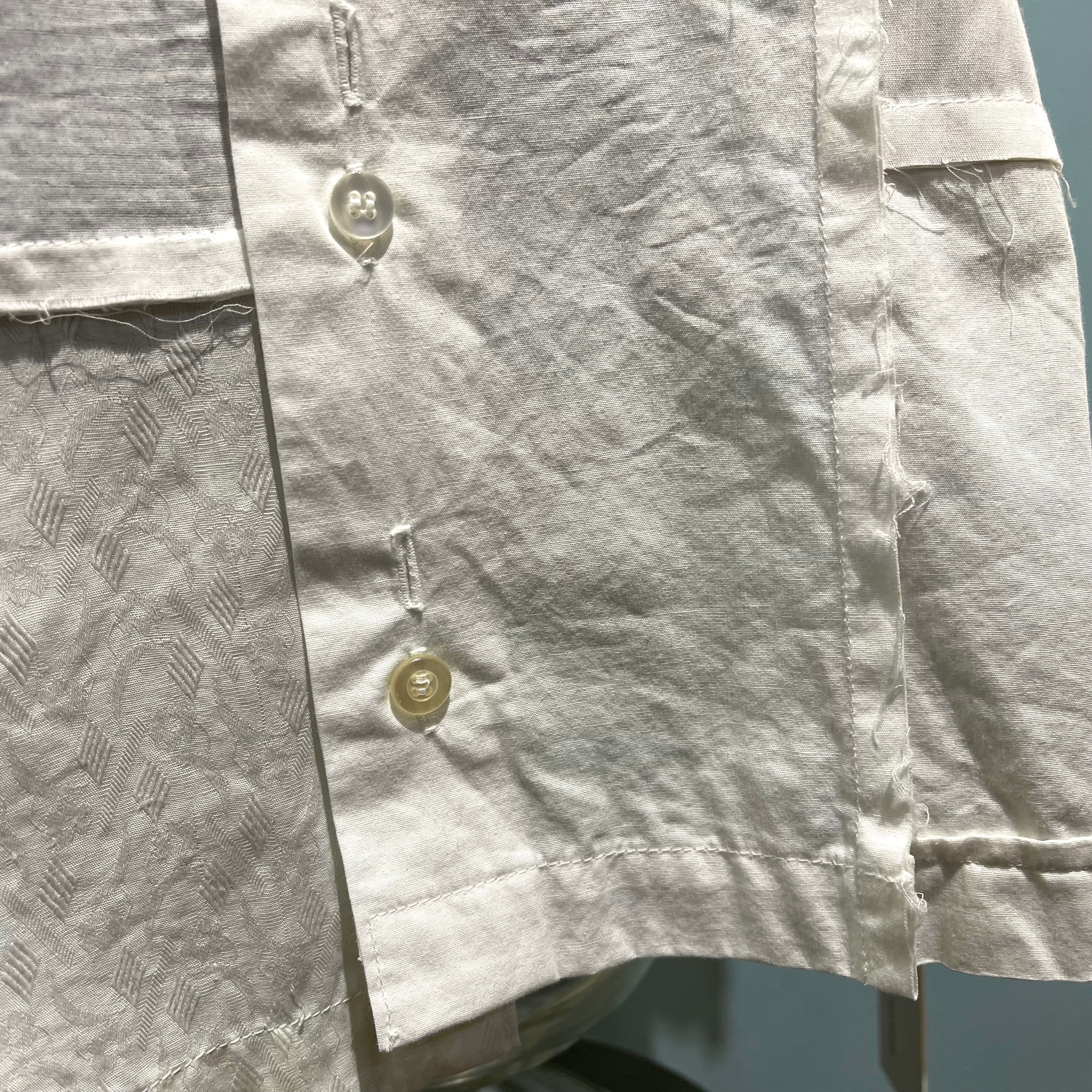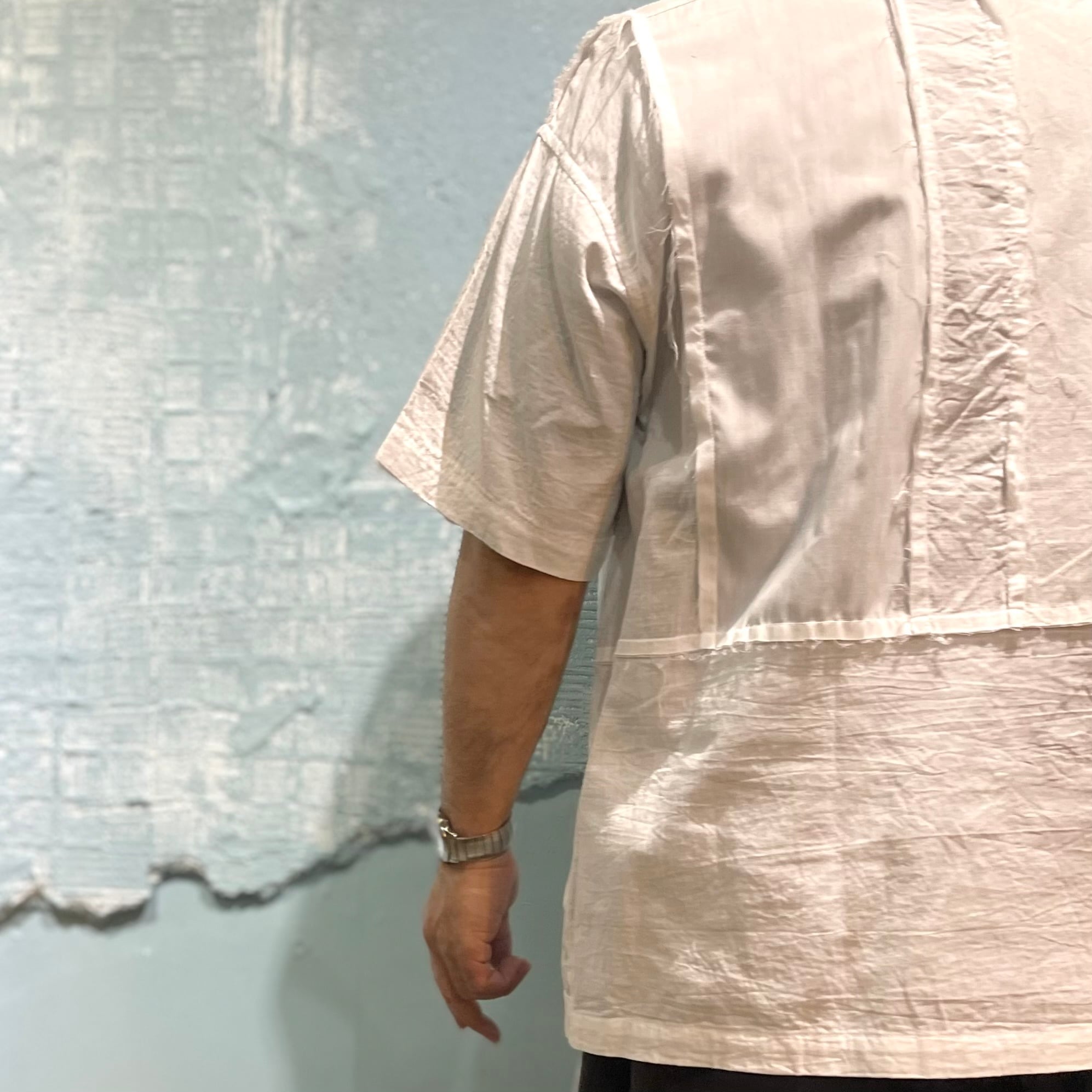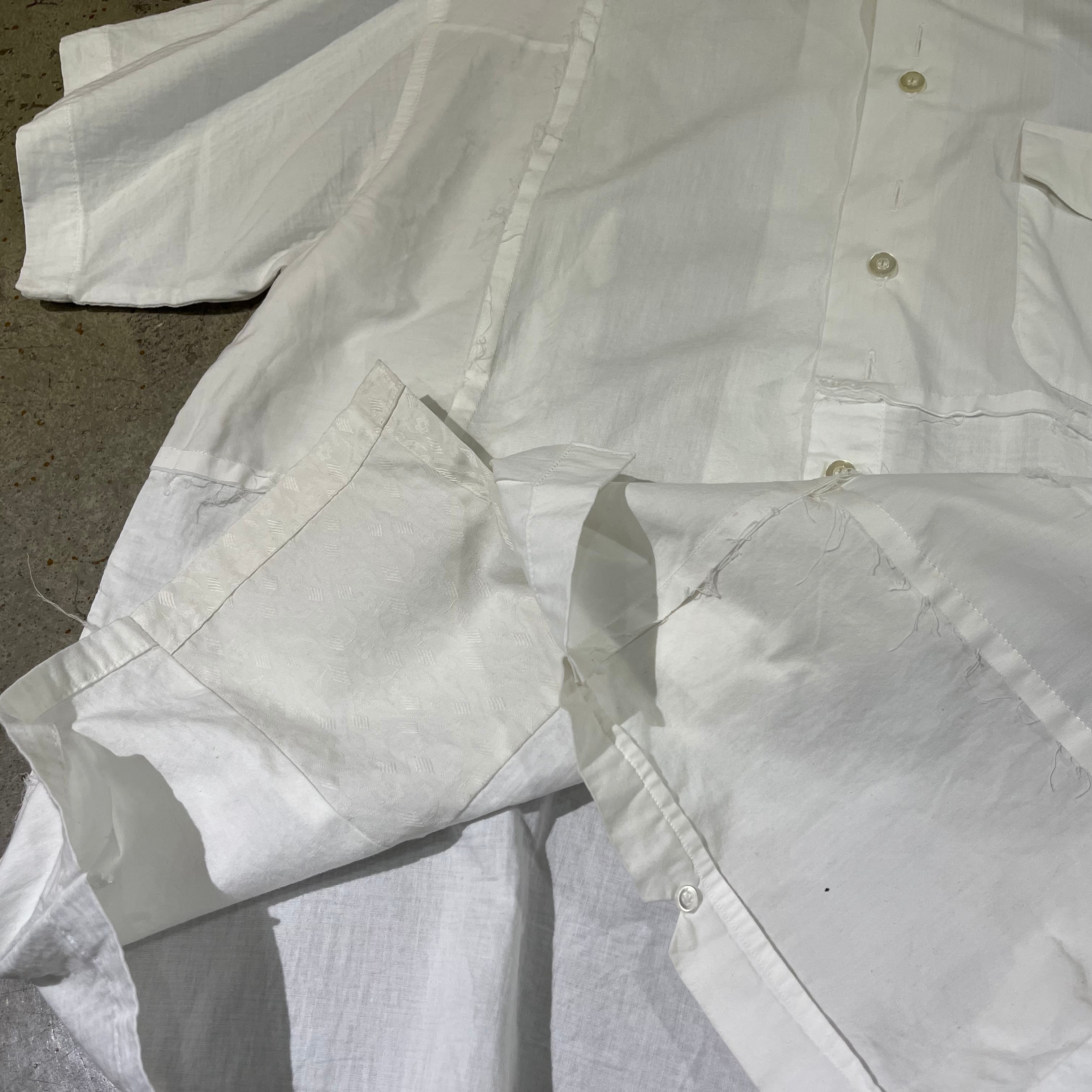 「チェンジーズ」のビンテージの白いシャツを数枚使い制作されたパッチワークシャツです。 ハリのあるブロード素材からガーゼのような柔らかいシャツまで使用してパズルのように当て込んで作り込まれています。 シルエットは少し緩めで着やすいパターン