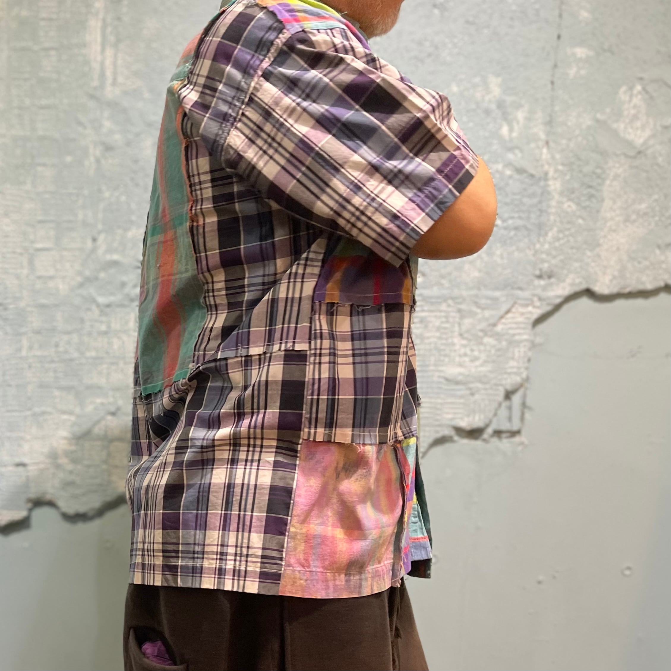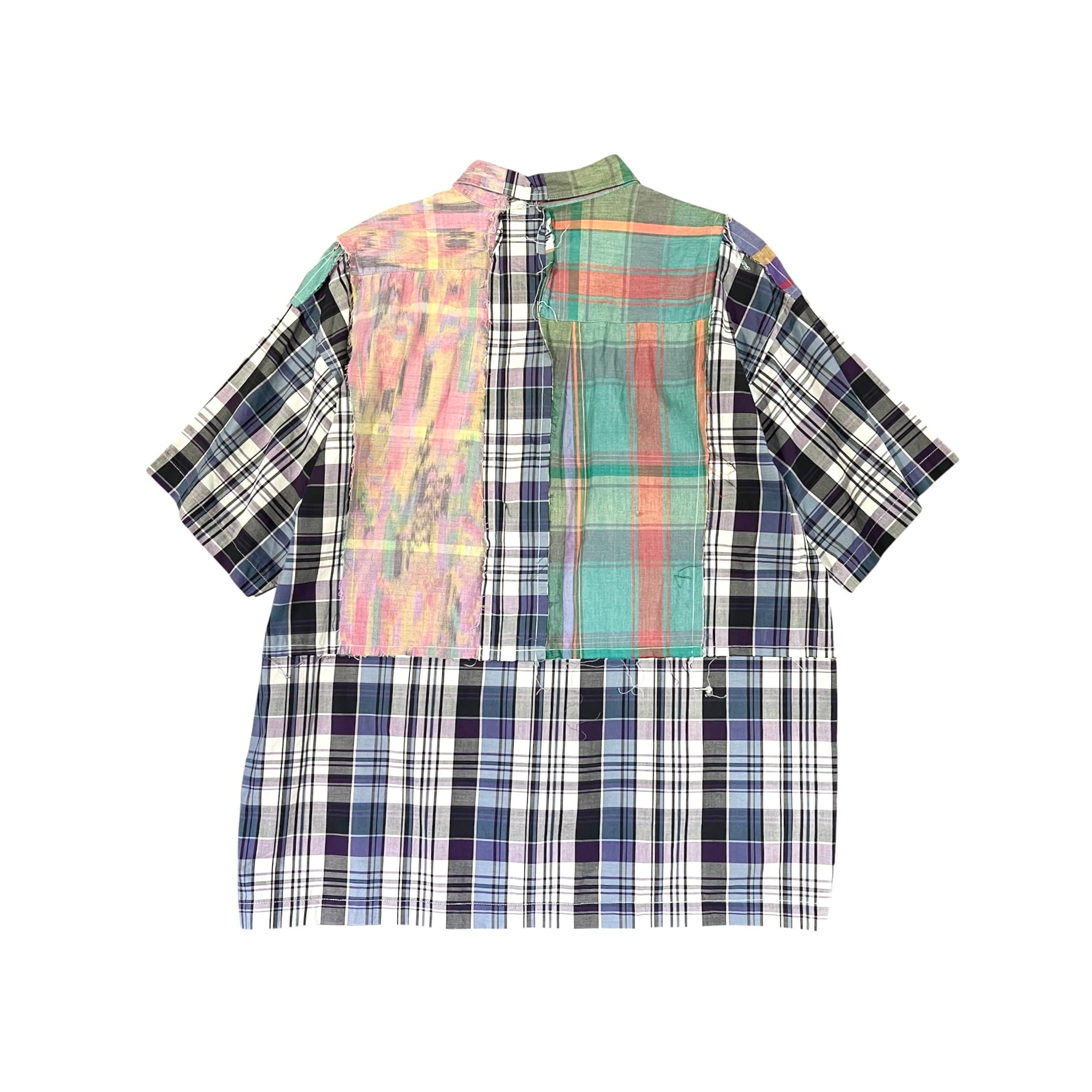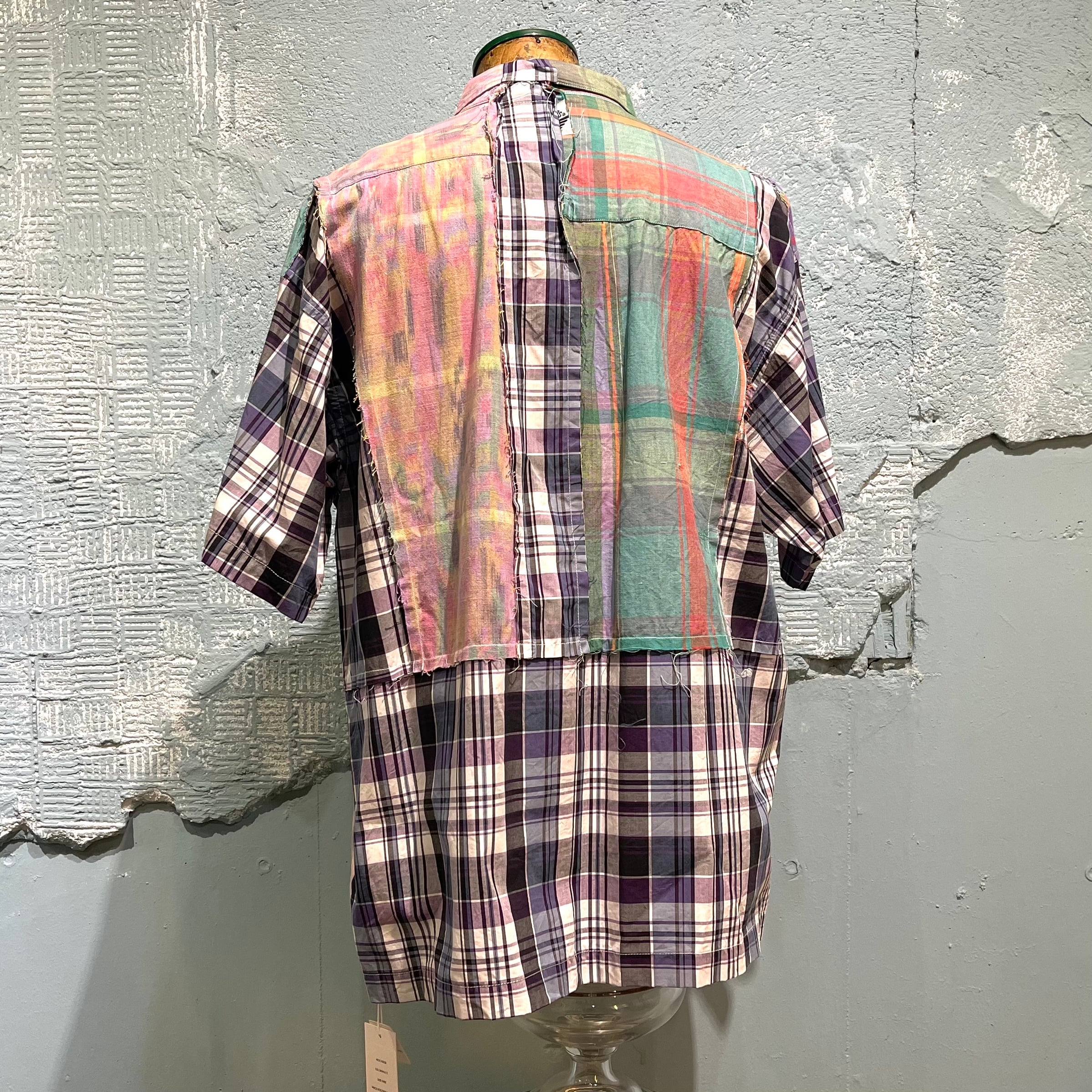 「チェンジーズ」のビンテージのチェックシャツを数枚使い制作されたパッチワークシャツです。 ハリのあるブロード素材からマドラスチェックのような柔らかいシャツまで使用してパズルのように当て込んで作り込まれています。 シルエットは少し緩めで着やすいパターン