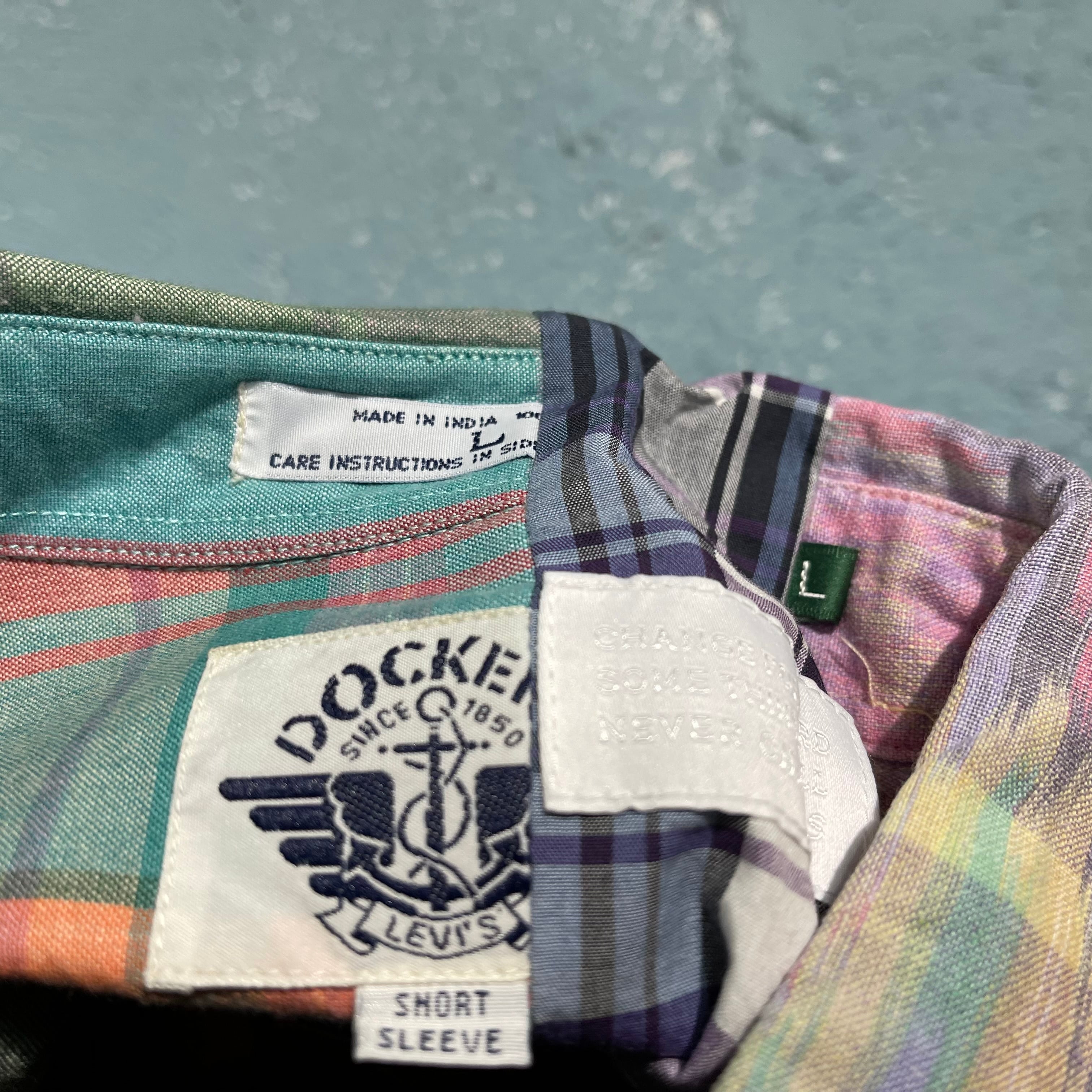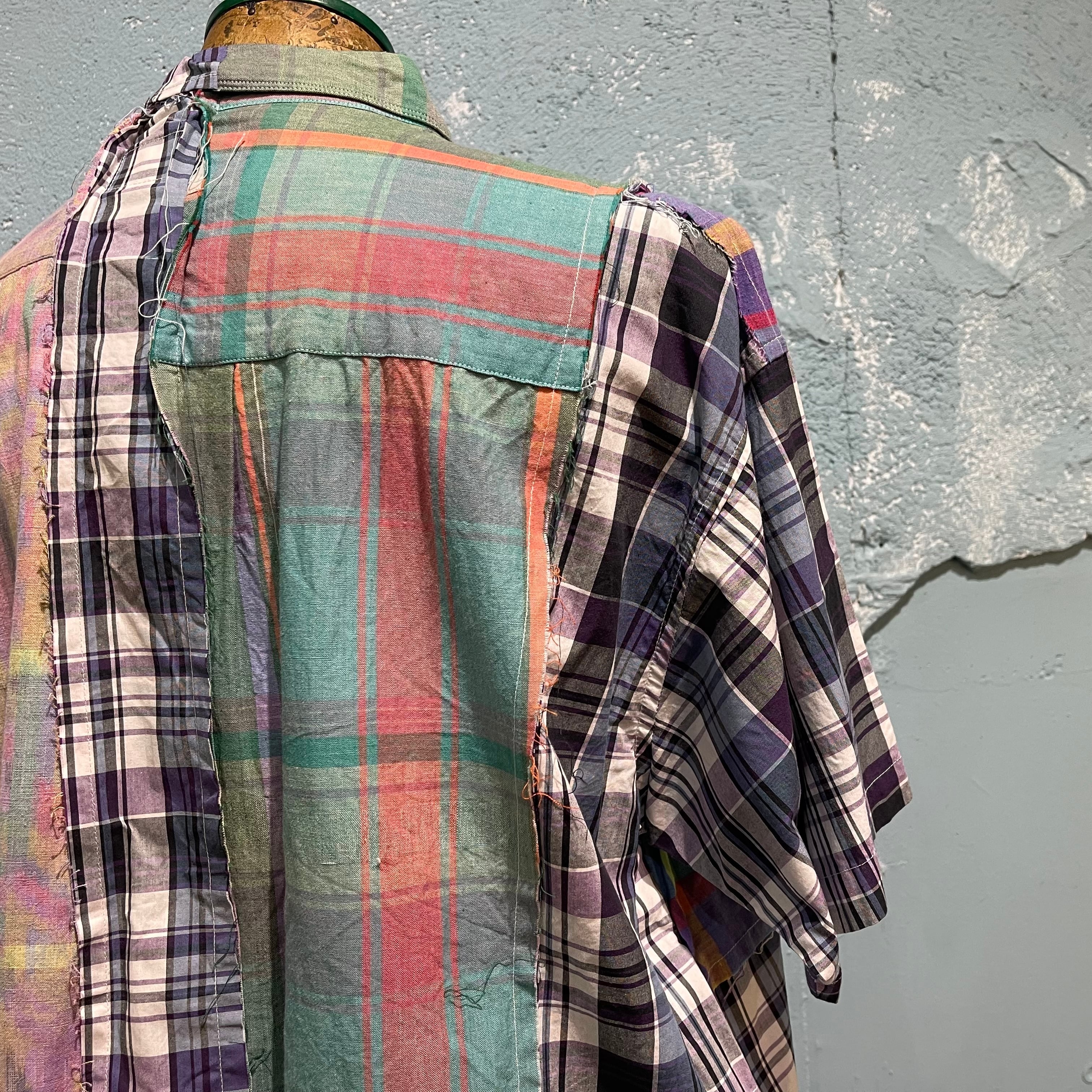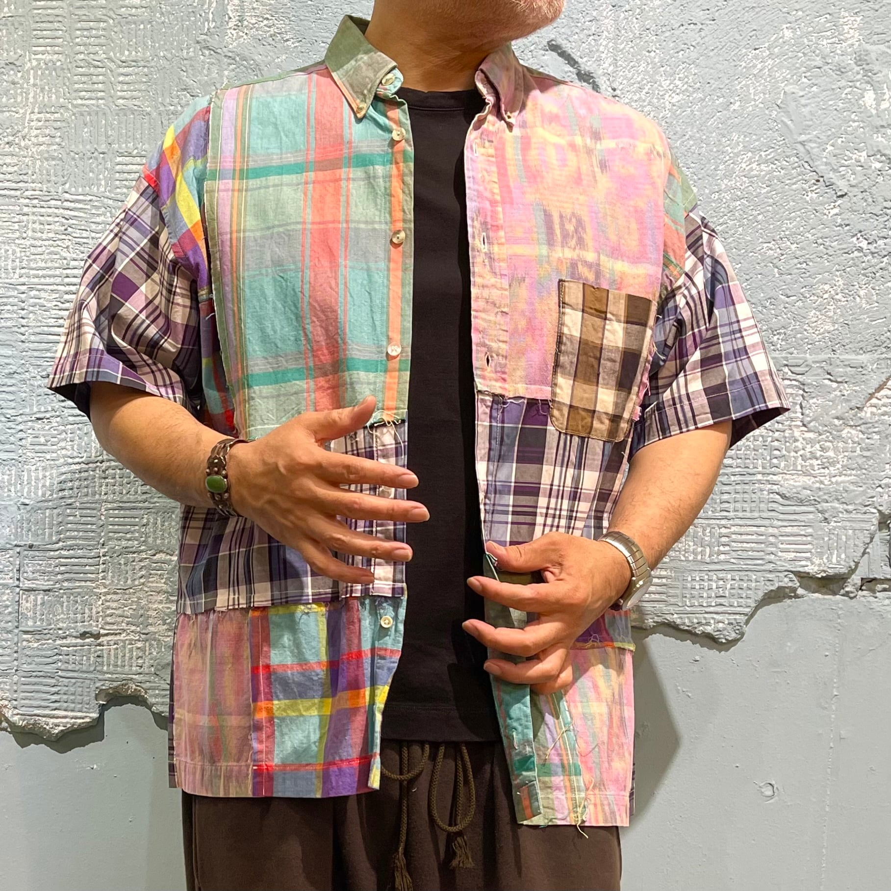 「チェンジーズ」のビンテージのチェックシャツを数枚使い制作されたパッチワークシャツです。 ハリのあるブロード素材からマドラスチェックのような柔らかいシャツまで使用してパズルのように当て込んで作り込まれています。 シルエットは少し緩めで着やすいパターン