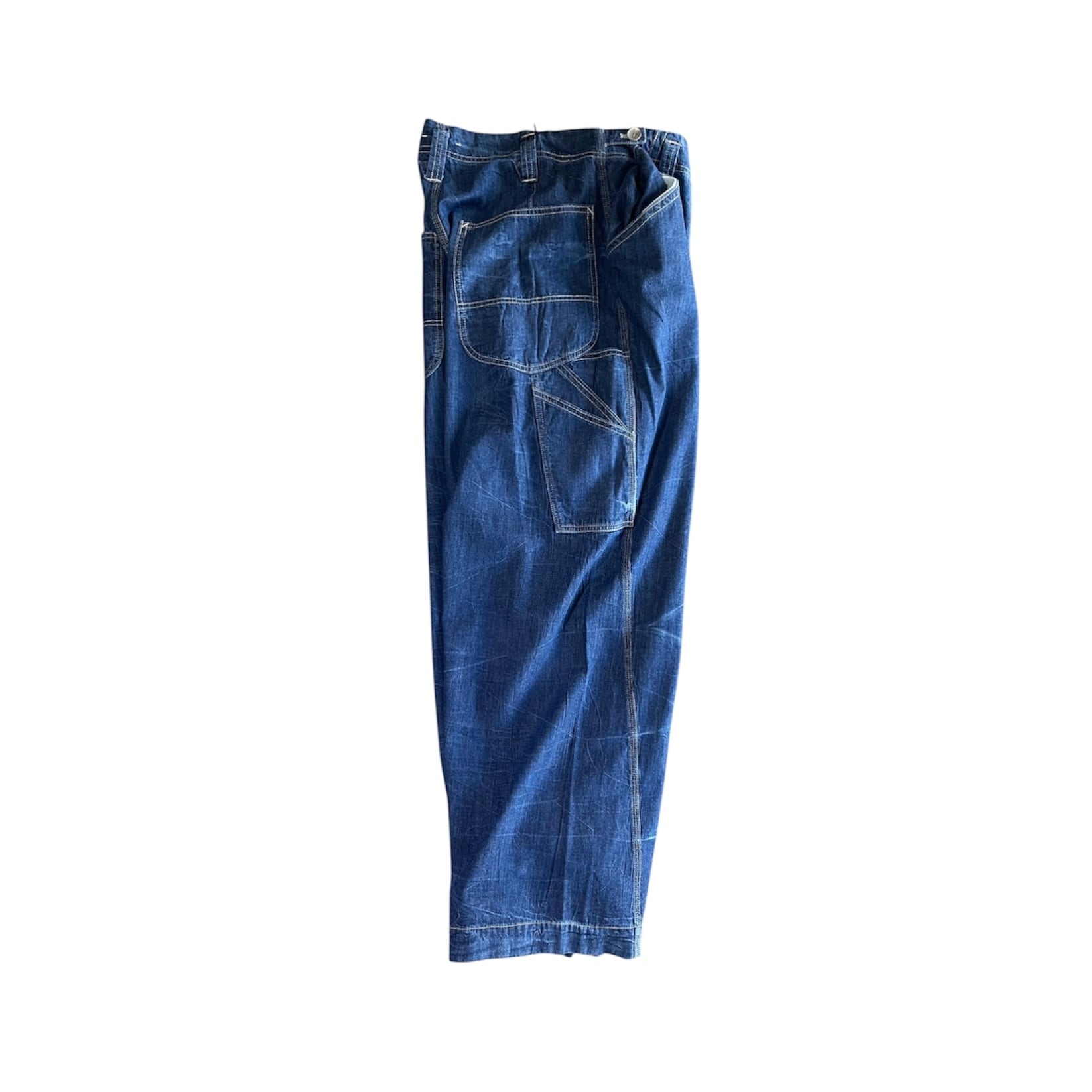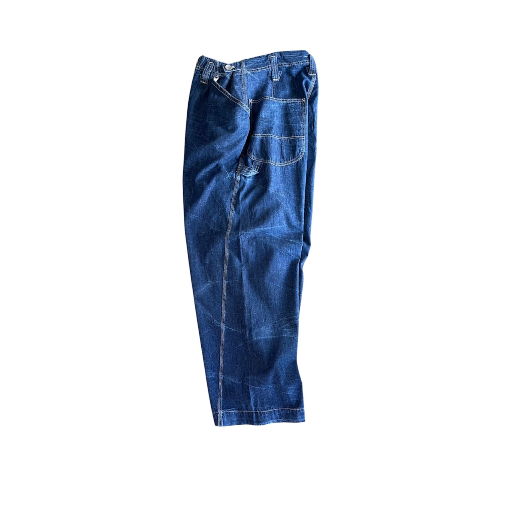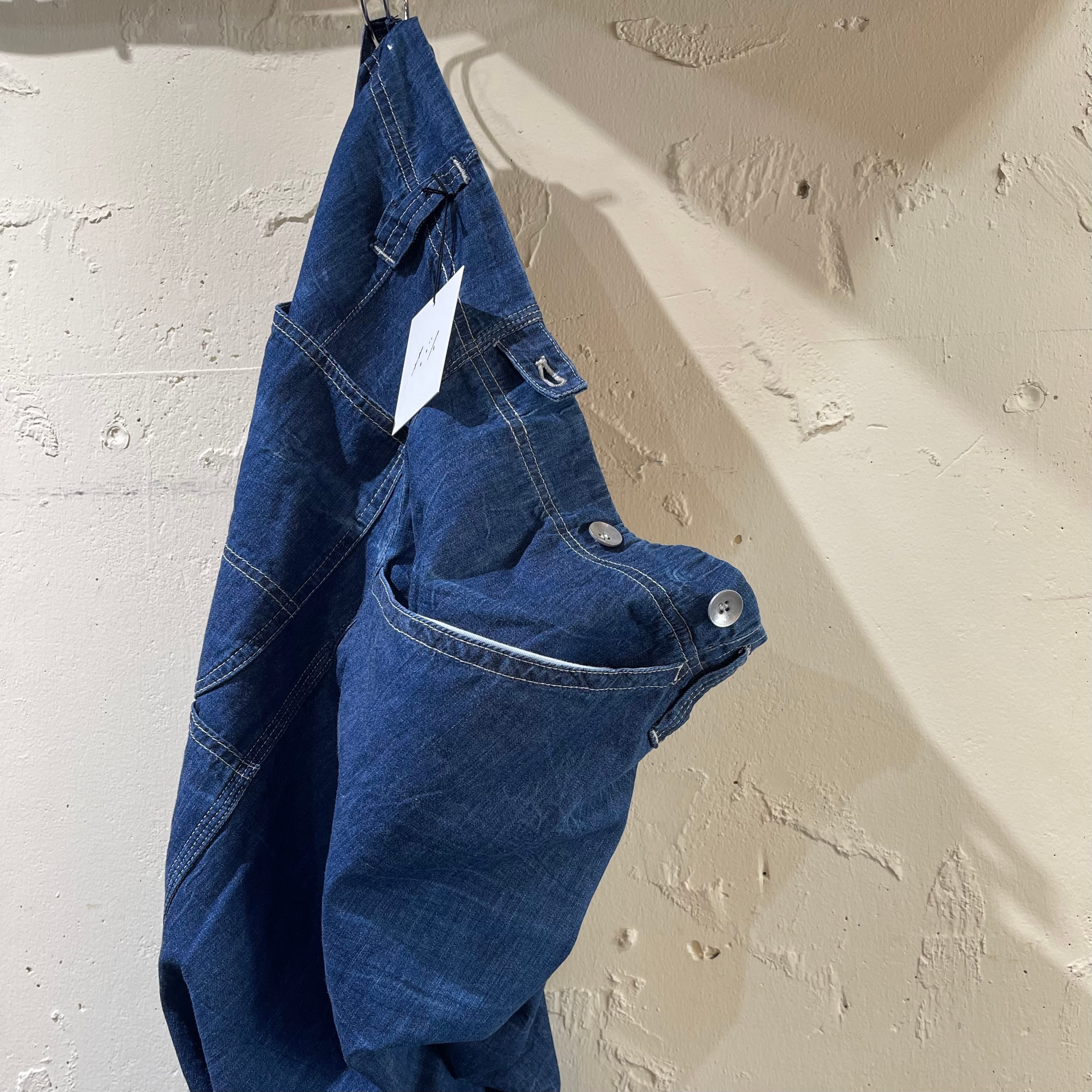 『サバイ』の薄手なデニム素材の太めなペインターパンツです。 立体的なサイドの処理などとてもモードで美しいシルエットになっています。職人の手により自然なシワ感、複雑なアタリを出しています。