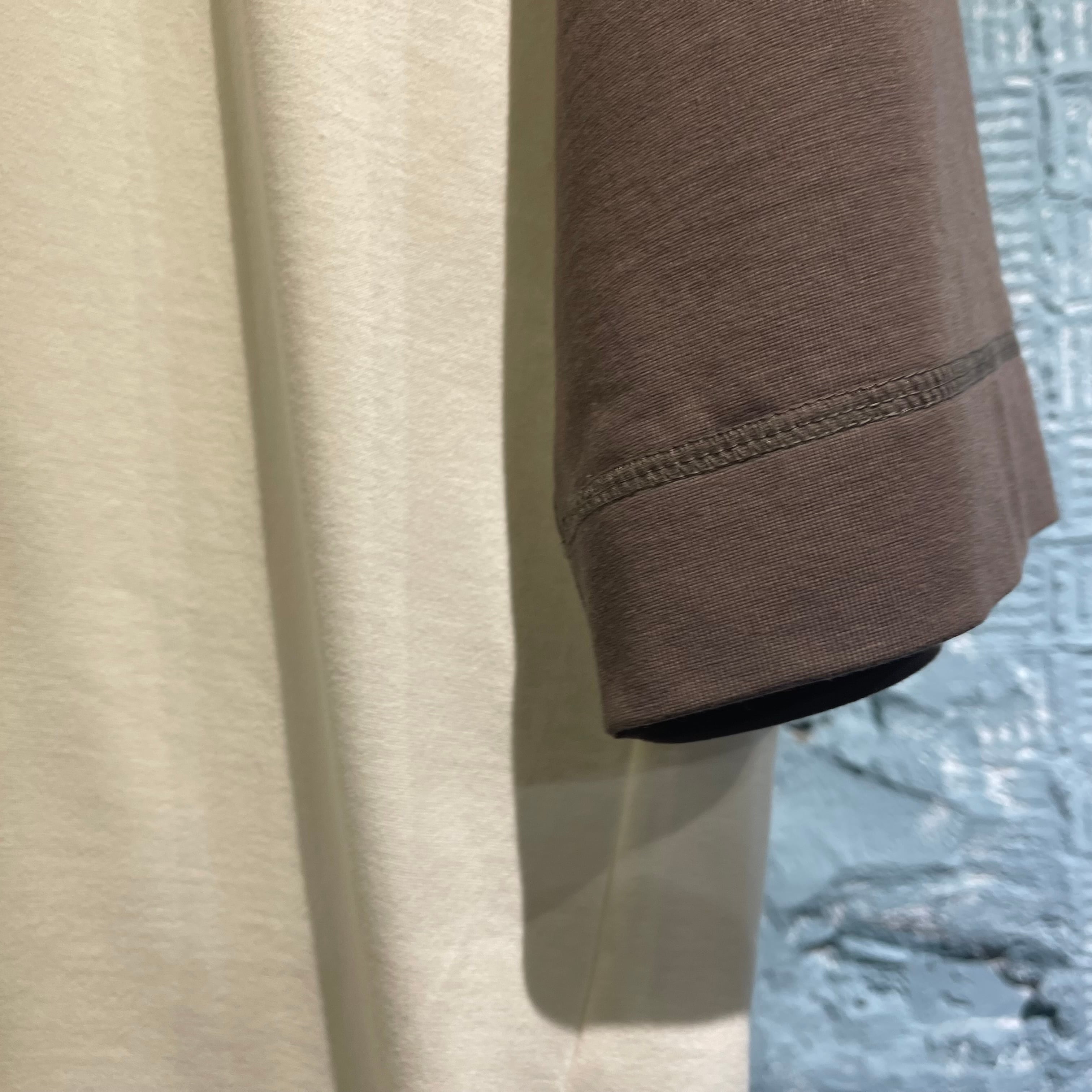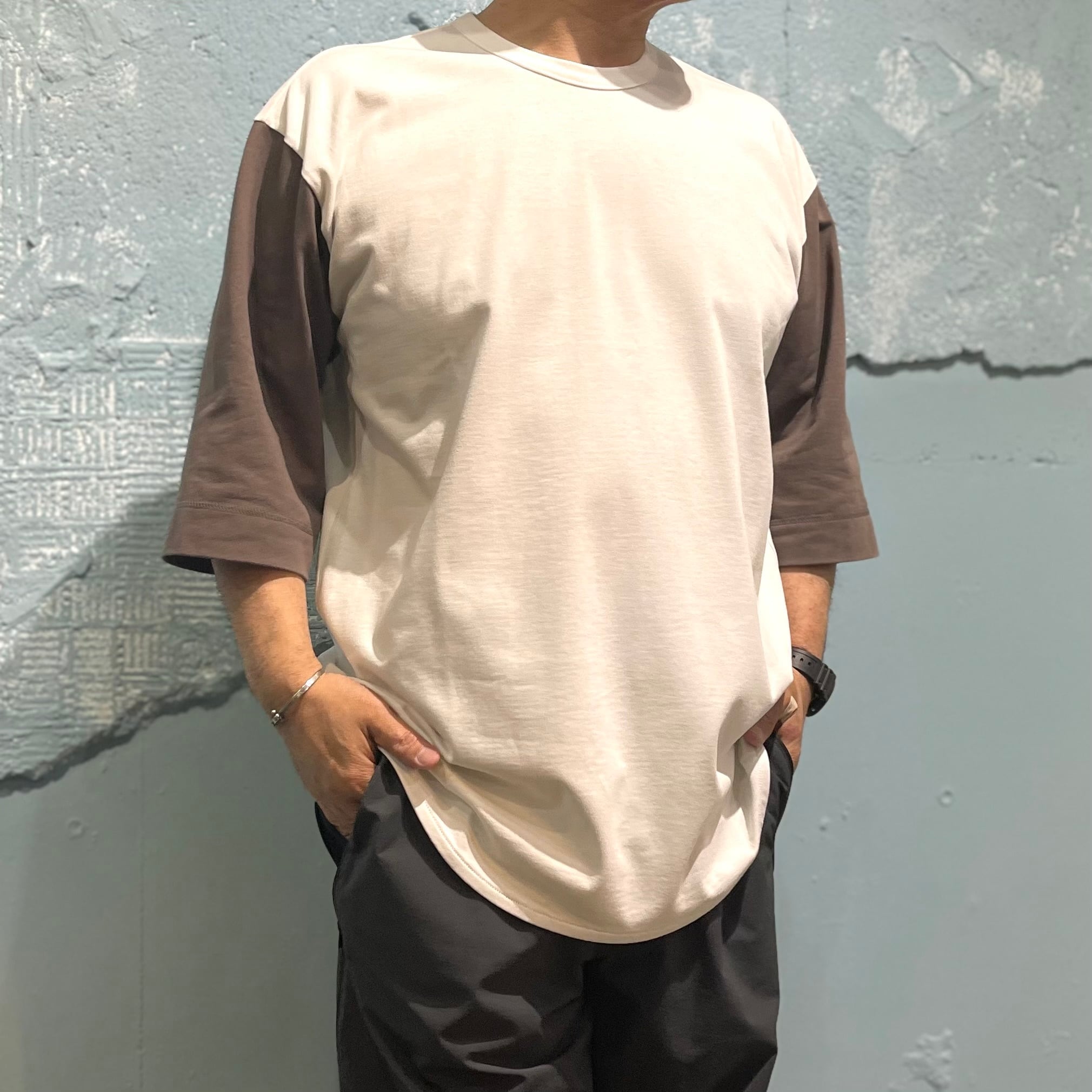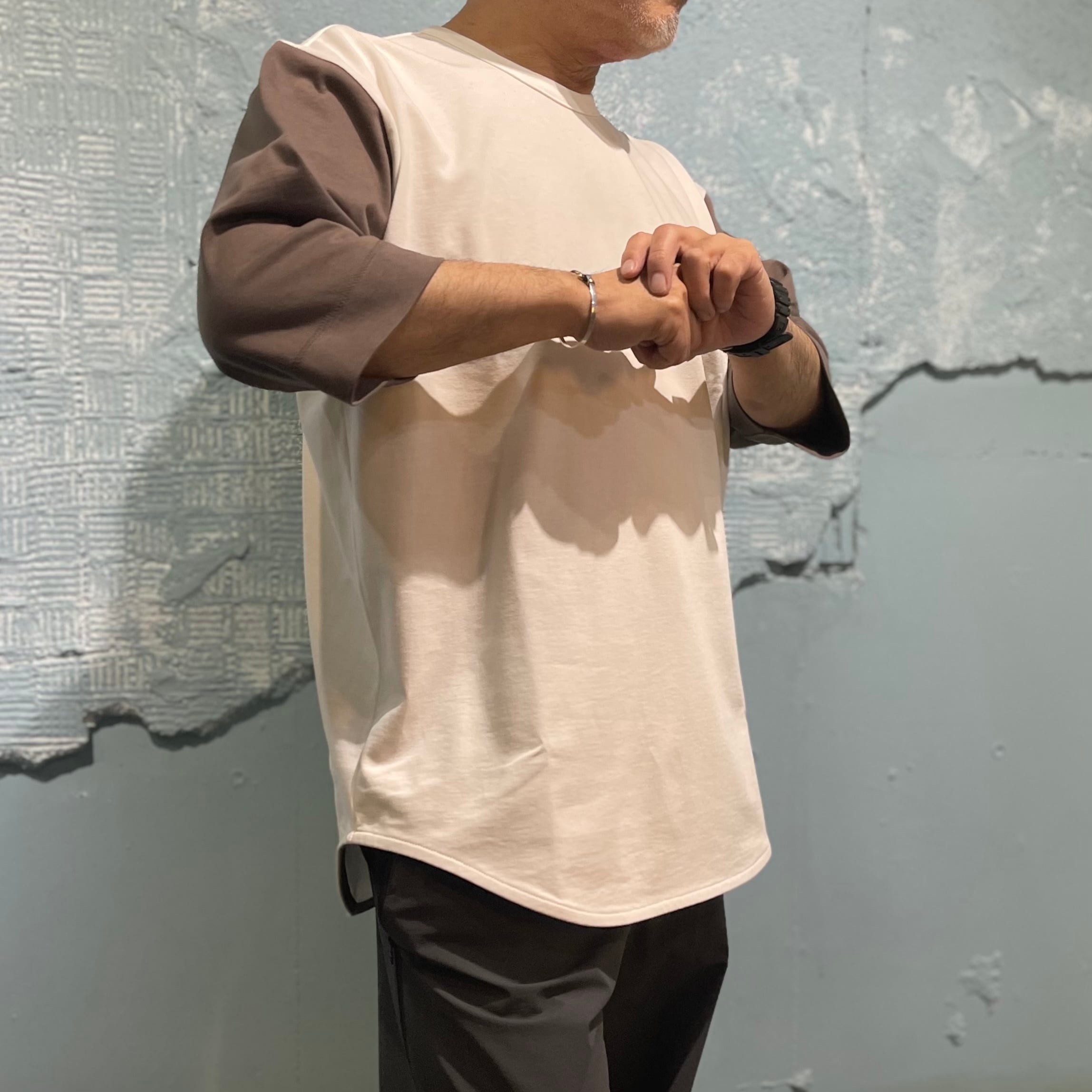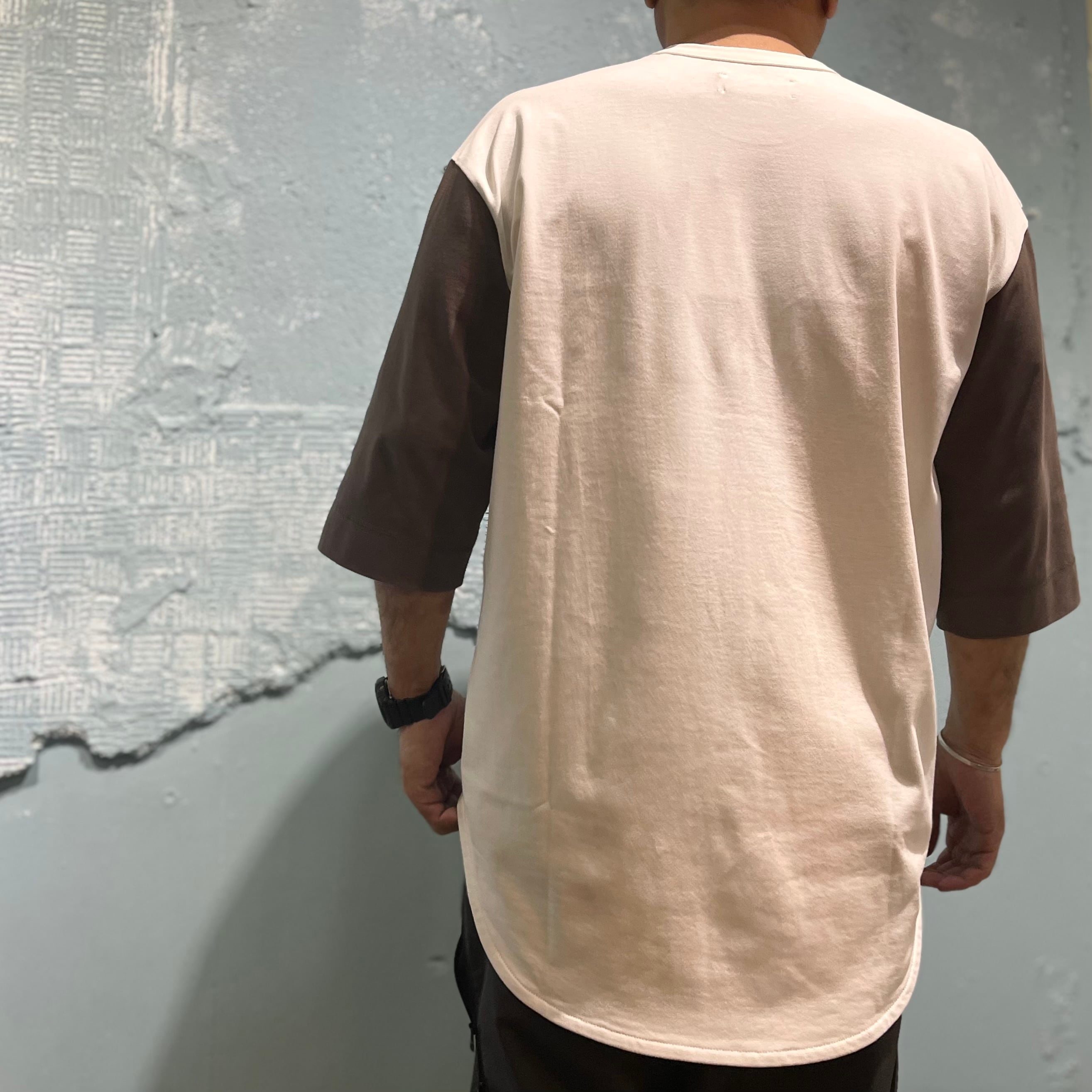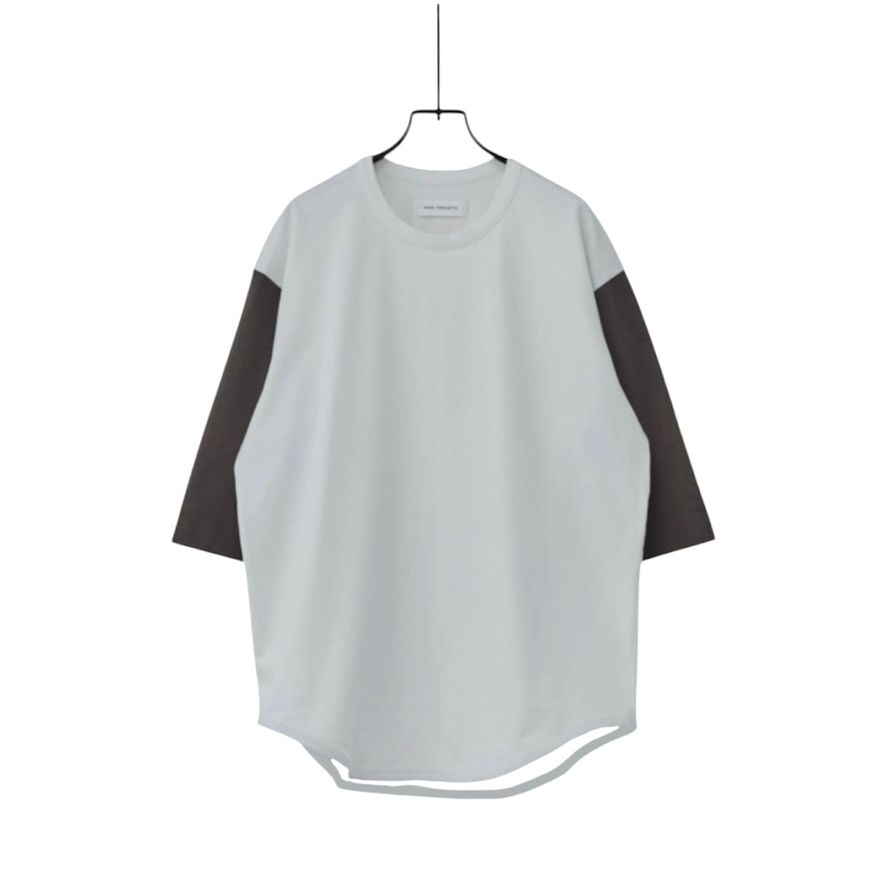パースプロジェクツの切り替え配色のカットソーです。少しゆとりのあるシルエット そして裾の部分は裏から袖と共生地を当てがった細かな作り込み。 裾をラウンド処理しています、少し後ろ側を長めにした立体的なバランスデザインに。しっかり着込めるスタンダードなかっちり素材の五部袖Tシャツです。