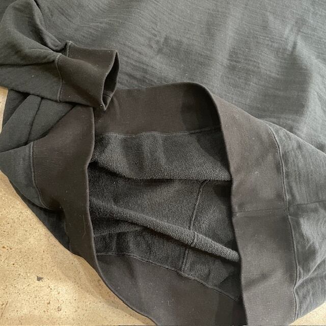 チェンジズの立体裁断を駆使して制作されたスウェットです。 前見ごろは新しい素材で後ろ側の刺繍ワッペン周辺や袖の部分がUSED素材、肩のところから袖にかけてかなり複雑な生地使いとなっています。